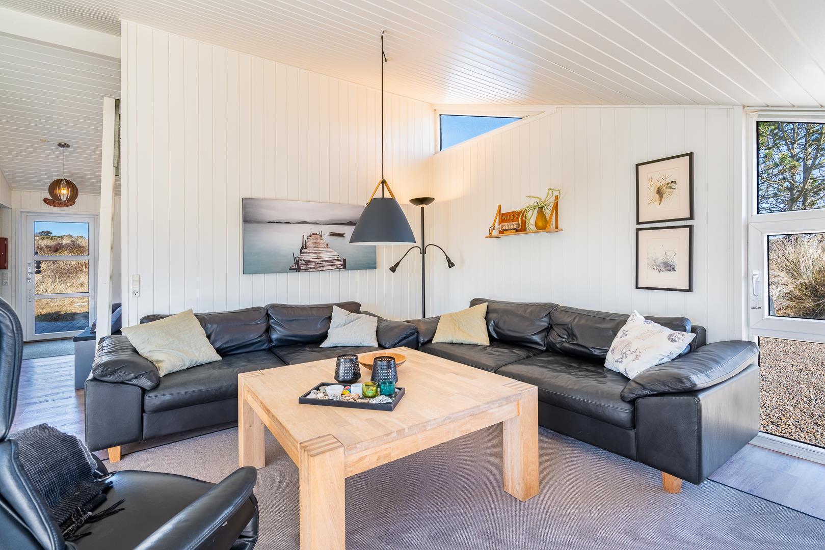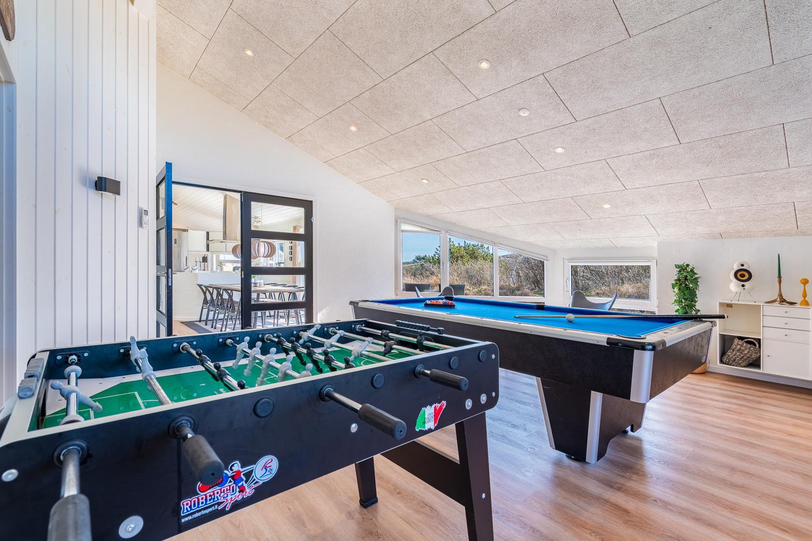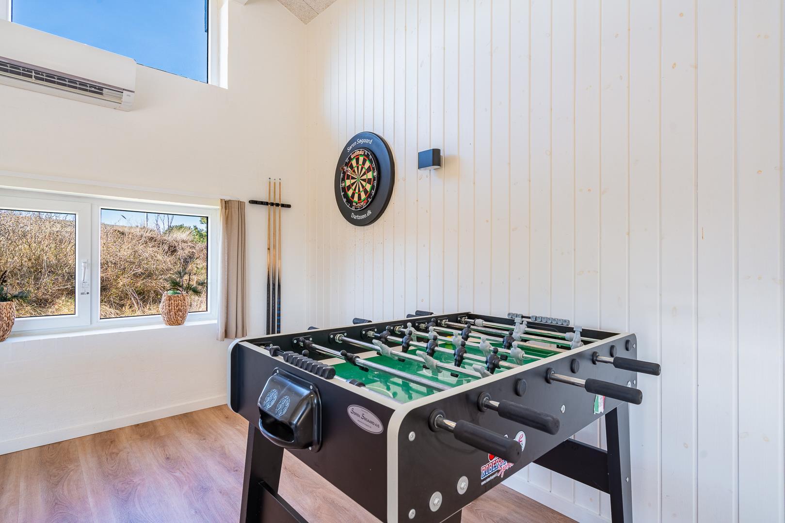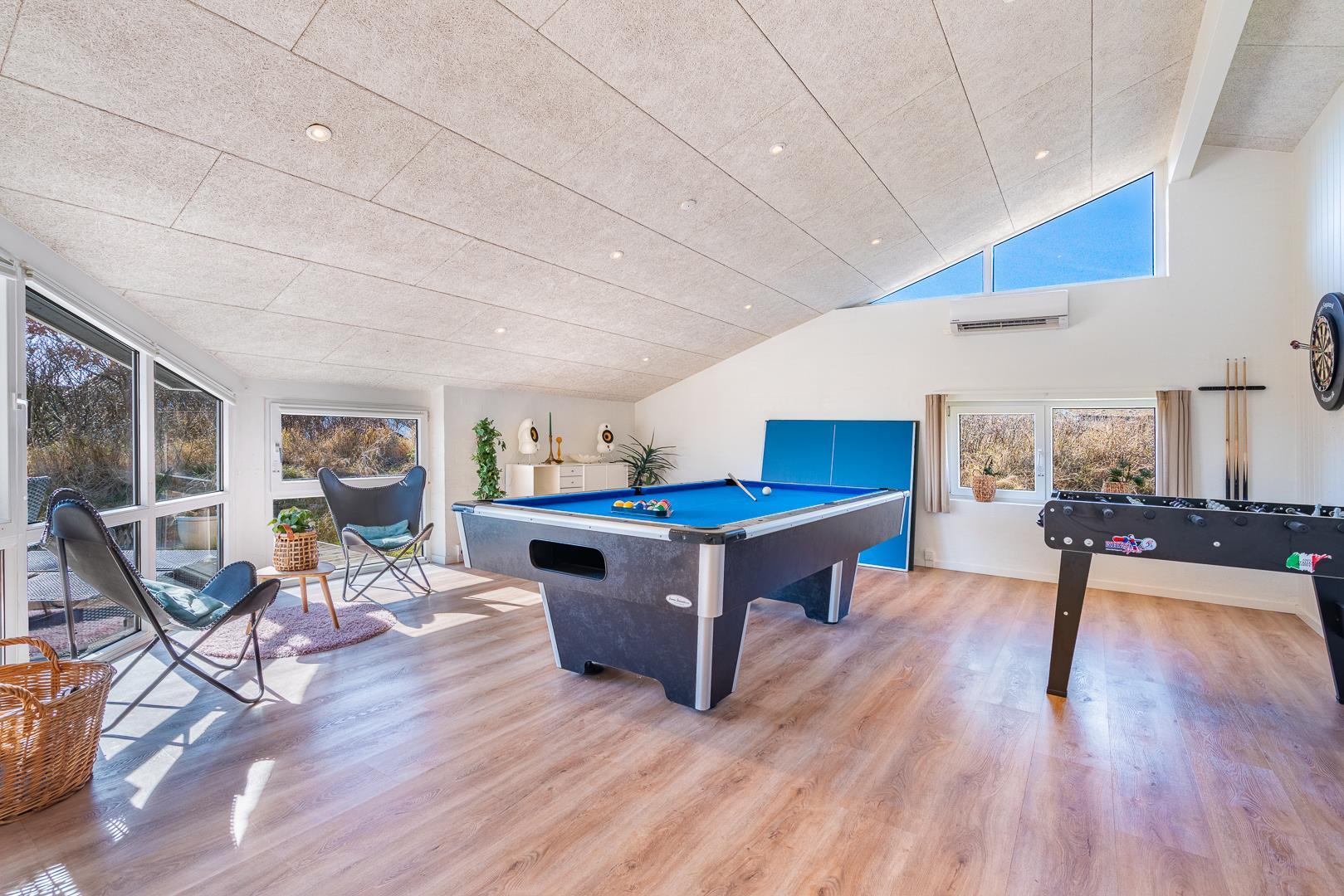 Auf einem Dünengrundstück am Ende einer Sackgasse, liegt dieses tolle und moderne Ferienhaus. Besonders hervorzuheben ist hier der Aktivitätsraum mit Billard, Tischtennis und Kicker. Schöne, neue und offene Küche in Verbindung mit dem super eingerichteten Wohnzimmer. Das gesamte Haus ist sehr hell und freundlich eingerichtet. 4 helle Schlafzimmer, mit Hems. 2 Badezimmer mit Duschkabine und in dem einen gibt es ein Whirlpool und eine Sauna. Ungestörte Terrasse. Tolles Ferienhaus in dem die besten Voraussetzungen für einen fantastischen Urlaub in Henne Strand geschaffen sind.
