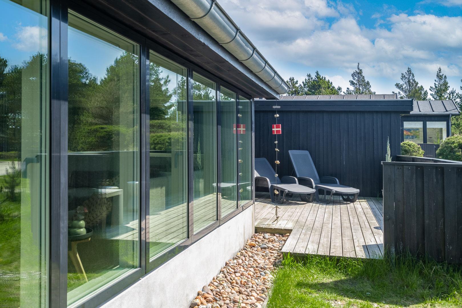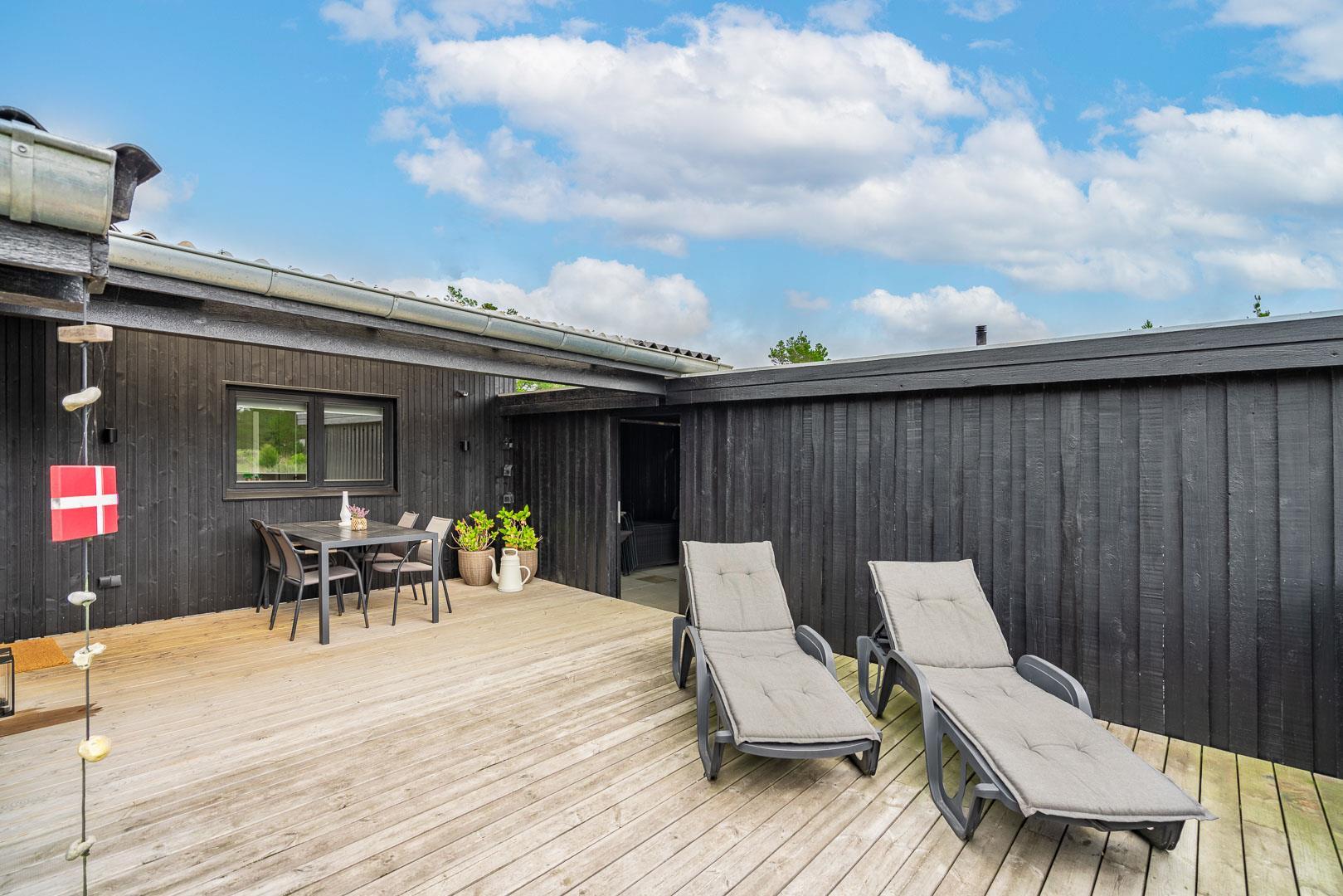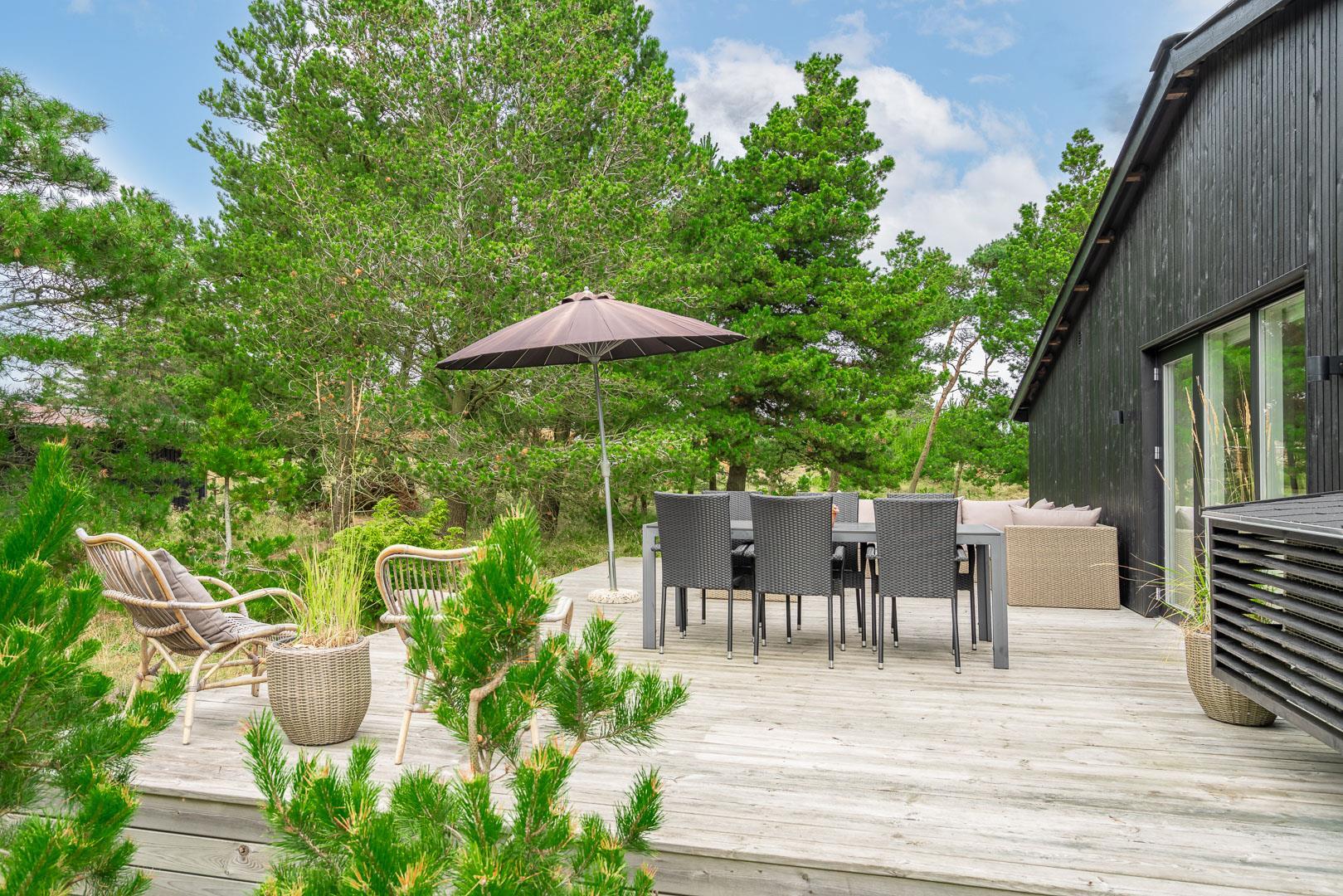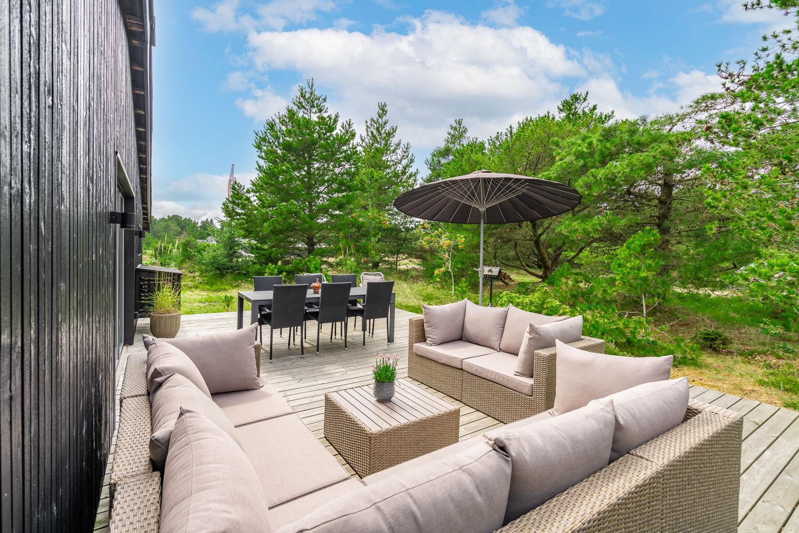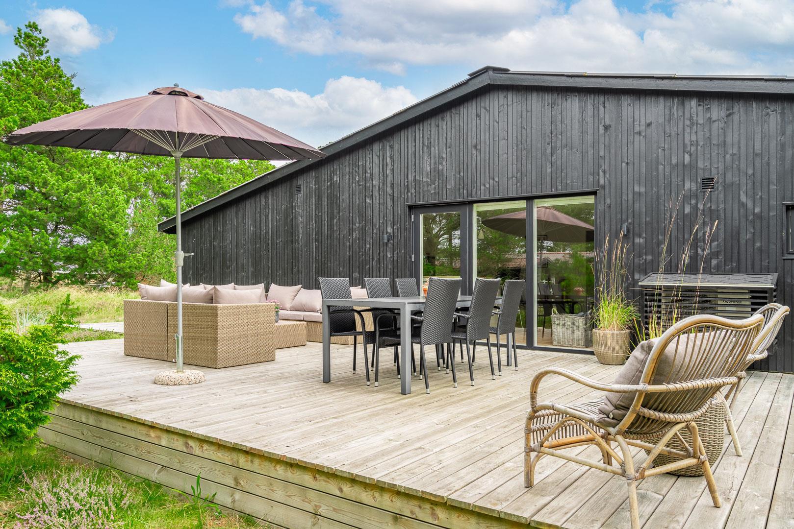 Das Ferienhaus liegt auf einem großen, herrlichen Naturgrundstück, und der fantastische Außenbereich bietet mehrere einladende Holzterrassen, ausgestattet mit allem, was das Herz begehrt – von Gartenmöbeln bis hin zu einer Außendusche für die warmen Sommertage. Eine der Terrassen befindet sich direkt am Eingang und ist teilweise überdacht, während die anderen beiden Terrassen rund um das Ferienhaus verteilt und durch einen charmanten Holzsteg miteinander verbunden sind. Hier finden Sie viele gemütliche Ecken und windgeschützte Bereiche, in denen Sie sich entspannen, ein gutes Buch lesen oder gemeinsam mit der Familie ein Spiel spielen können.