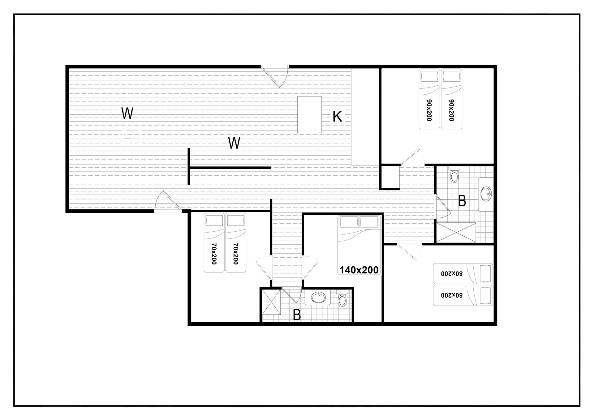 Bettengrösse: 1 Doppelbett mit je 2 Matratzen á 90 x 200 cm + 1 Doppelbett mit je 2 Matratzen á 80 x 200 cm + 1 Doppelbett mit je 2 Matratzen á 70 x 200 cm + 1 Doppelbett 140 x 200 cm.