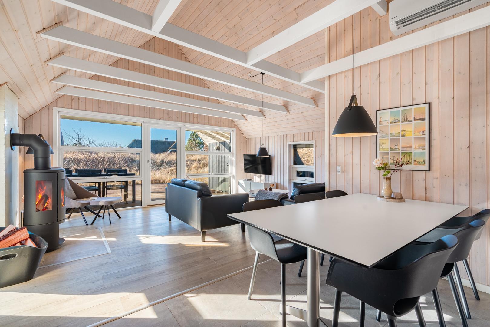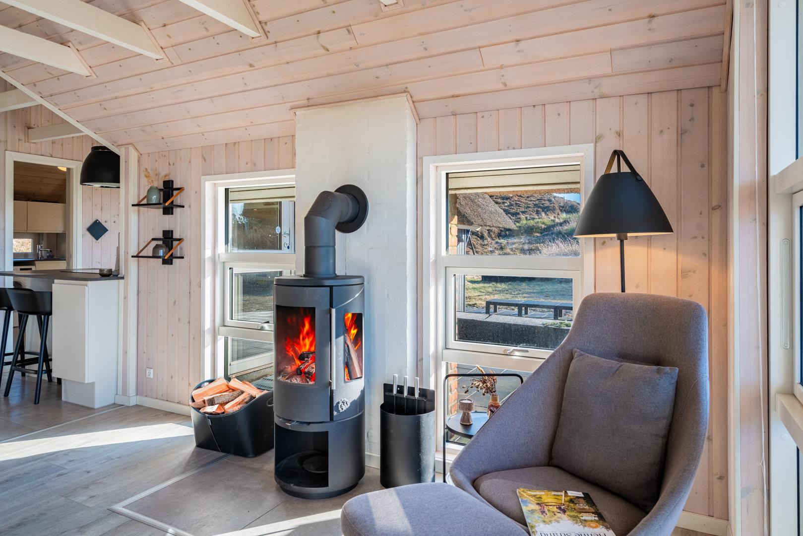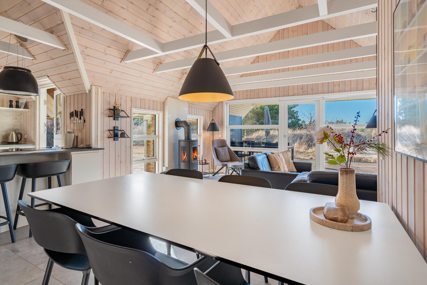 Der helle Wohnbereich ist das Herz des Hauses. Hier genießt ihr gemütliche Abende mit Kaminfeuer und Blick auf die umliegenden Dünen. Die offene Küche ist gut ausgestattet und lädt zum gemeinsamen Kochen und Genießen ein.