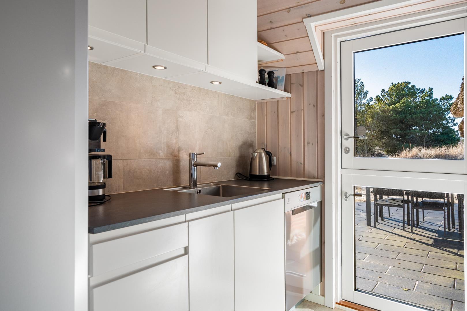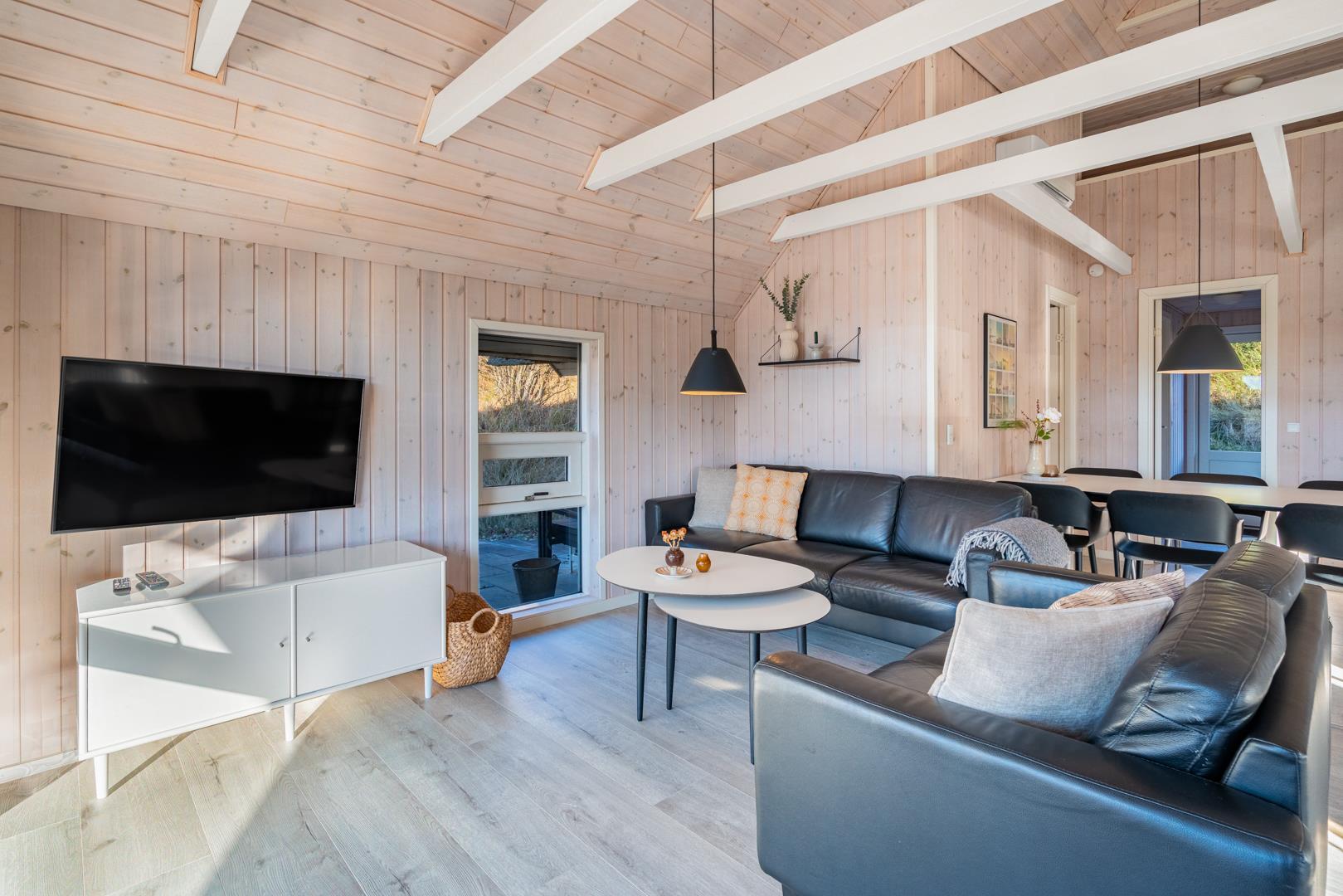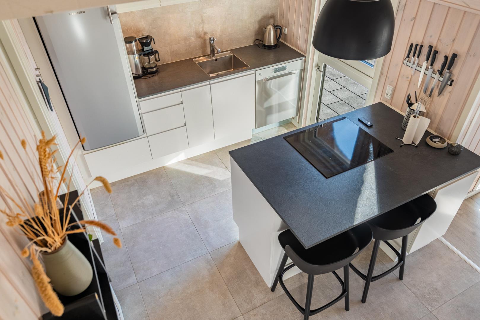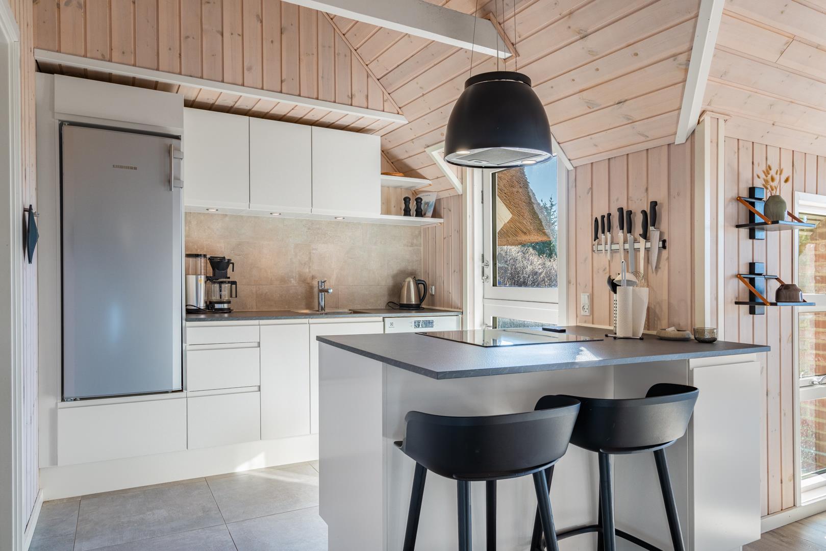 Der helle Wohnbereich ist das Herz des Hauses. Hier genießt ihr gemütliche Abende mit Kaminfeuer und Blick auf die umliegenden Dünen. Die offene Küche ist gut ausgestattet und lädt zum gemeinsamen Kochen und Genießen ein.