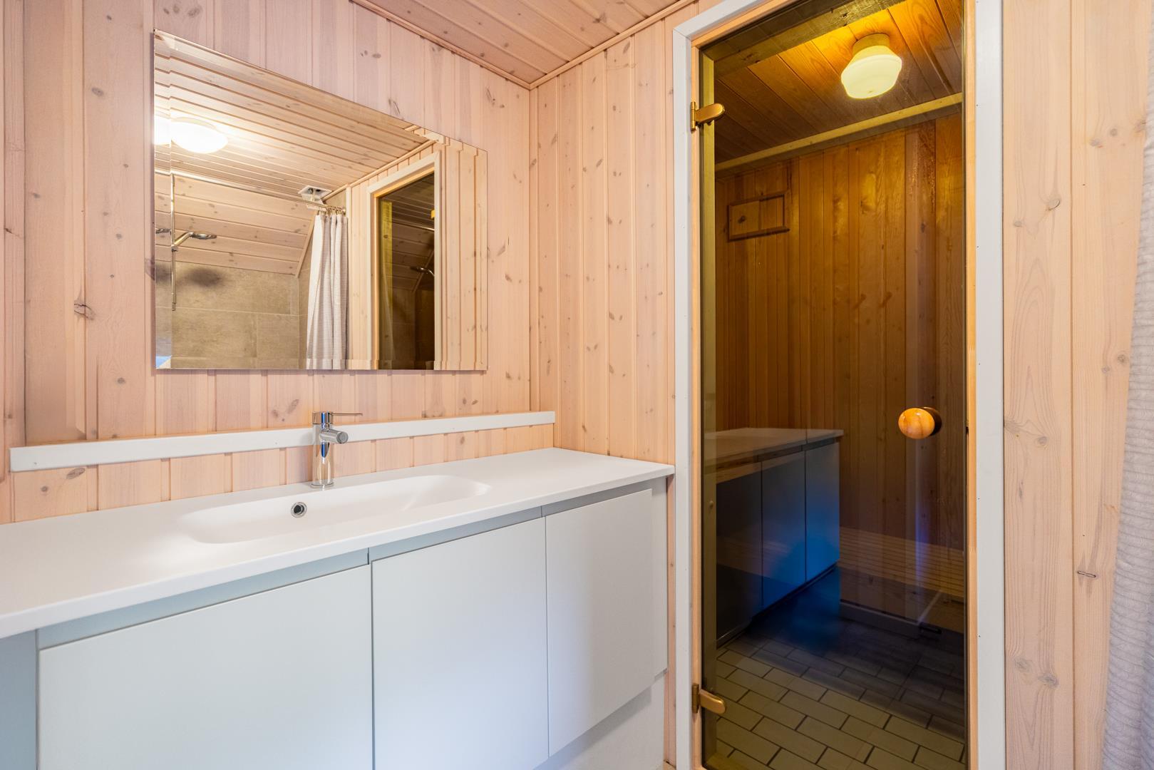 Zwei Badezimmer mit Fußbodenheizung bieten hohen Komfort. Sauna und Whirlpool machen das Ferienhaus zu einem echten Wellness-Ferienhaus in Henne Strand – ideal nach Strandtagen oder langen Spaziergängen.