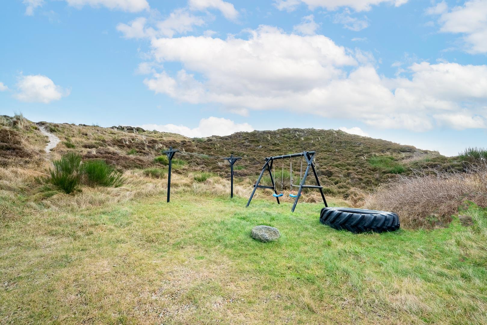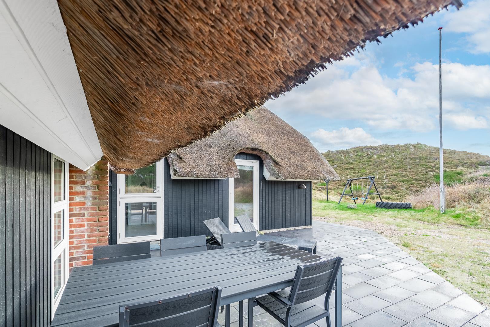 Auf der überdachten Terrasse genießt ihr entspannte Stunden im Freien. Schaukel und Sandkasten machen das Ferienhaus besonders kinderfreundlich.