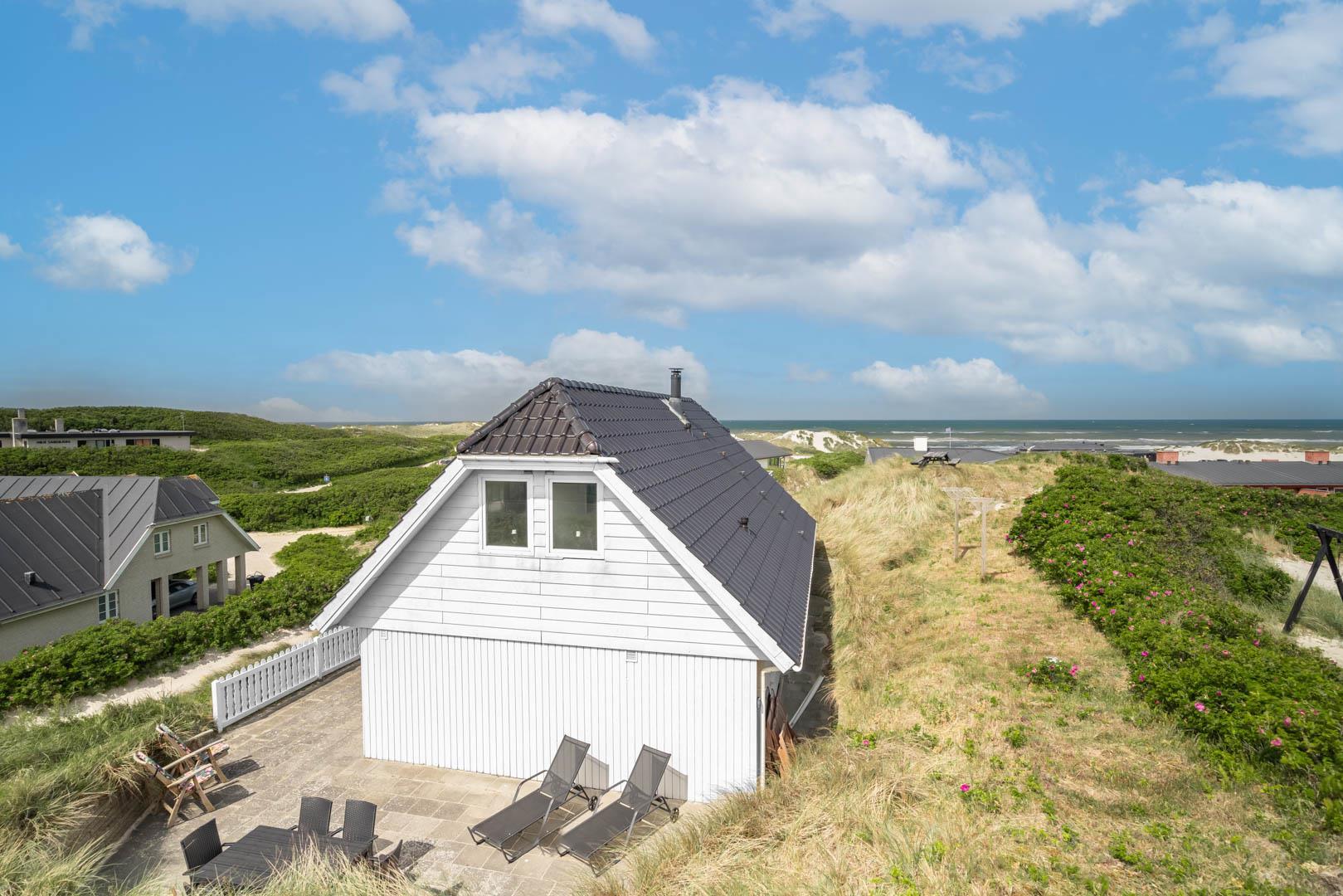 Das charmante Ferienhaus fügt sich perfekt in die idyllische Umgebung ein. Es ist fast in eine Düne eingebaut, die sowohl Schutz als auch gute Aussichtspunkte auf dem Grundstück schafft.