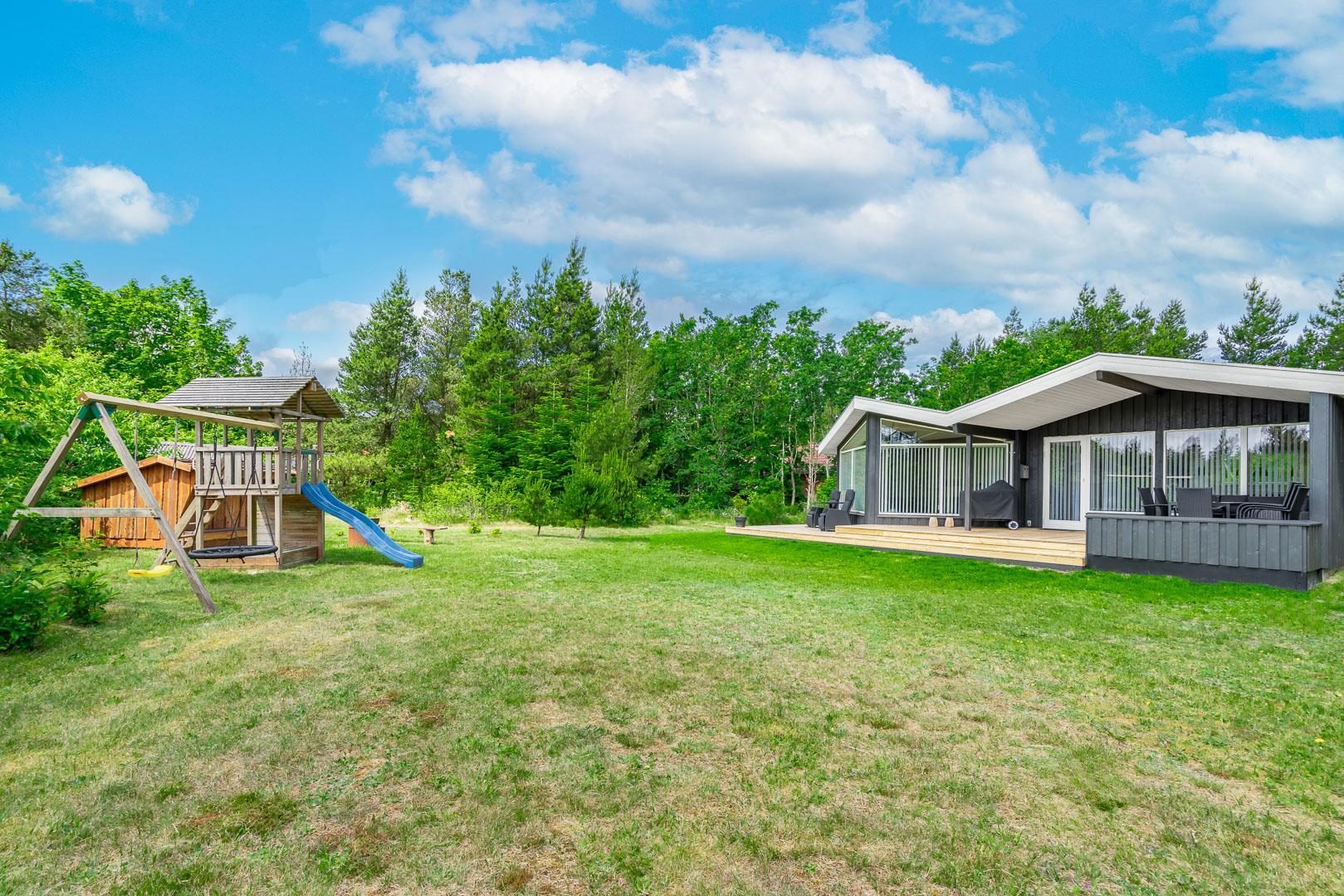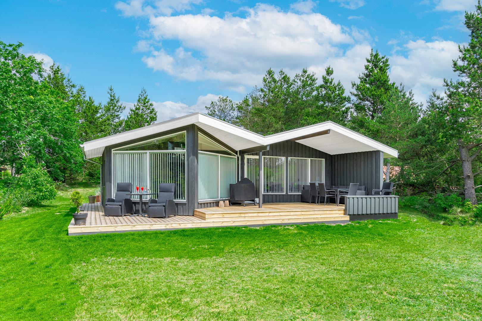 Auf einem ungestörten und kinderfreundlichen Naturgrundstück umgeben von Bäumen liegt dieses gemütliche und hell eingerichtete Ferienhaus, renoviert 2018. Zum Haus gehört eine große überdachte Südterrasse sowie 2 offene Terrassen. Große Stube mit tollem Lichteinfall. 2 Badezimmer mit Dusche und eine auch mit BAdewanne. Große gut ausgestattete Küche/Gemeinschaftsraum. Herd mit keramischen Kochplatten. Gratis Internetverbindung. 3 Schlafzimmer mit Doppelbetten. Kinderbett, Kinderstuhl, Schaukel und Sandkasten für Kinder. Es sind keine Haustiere erlaubt.