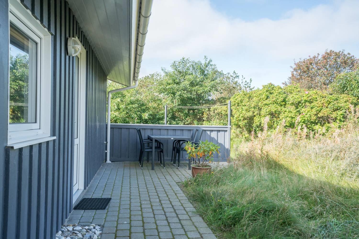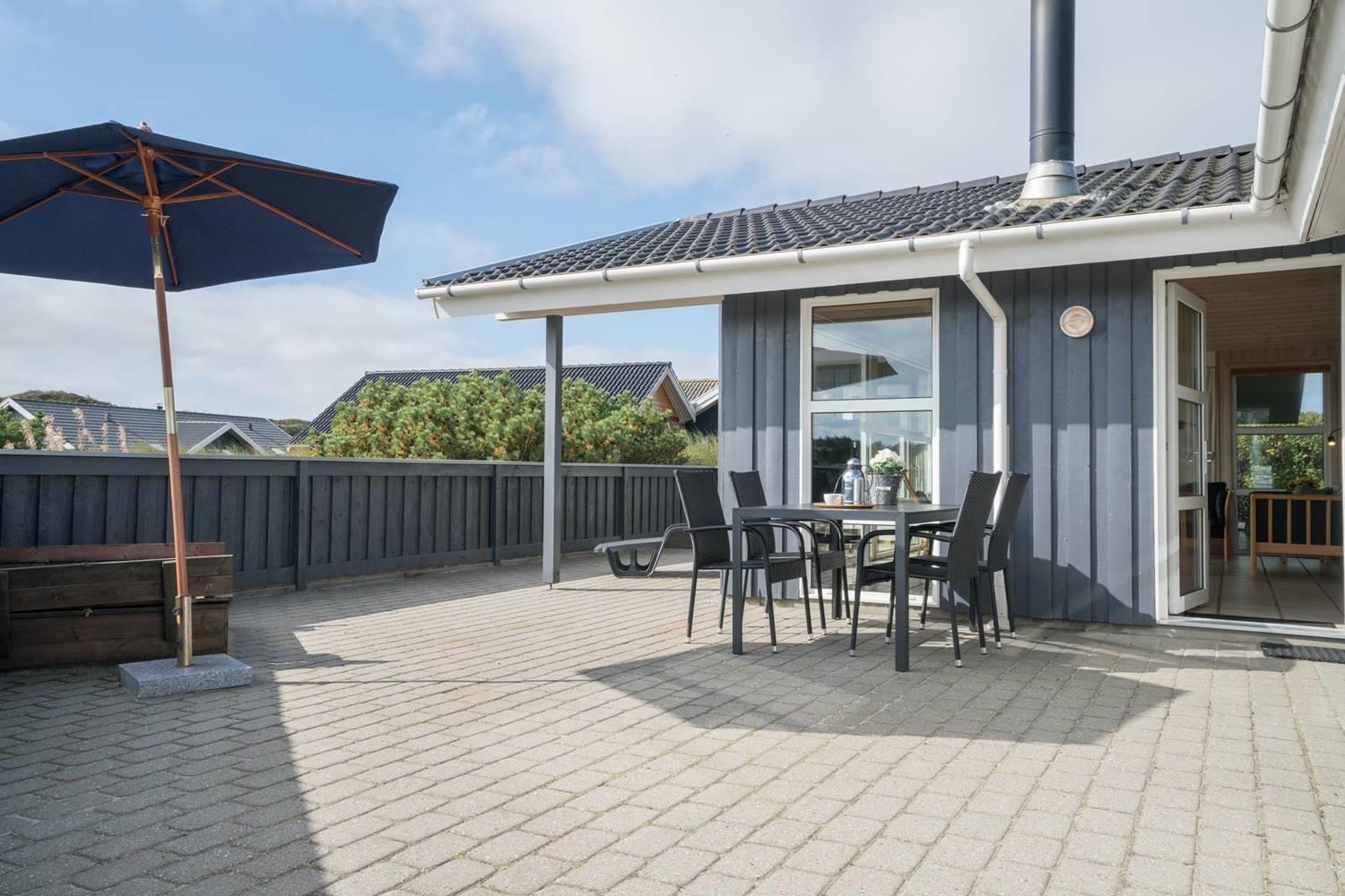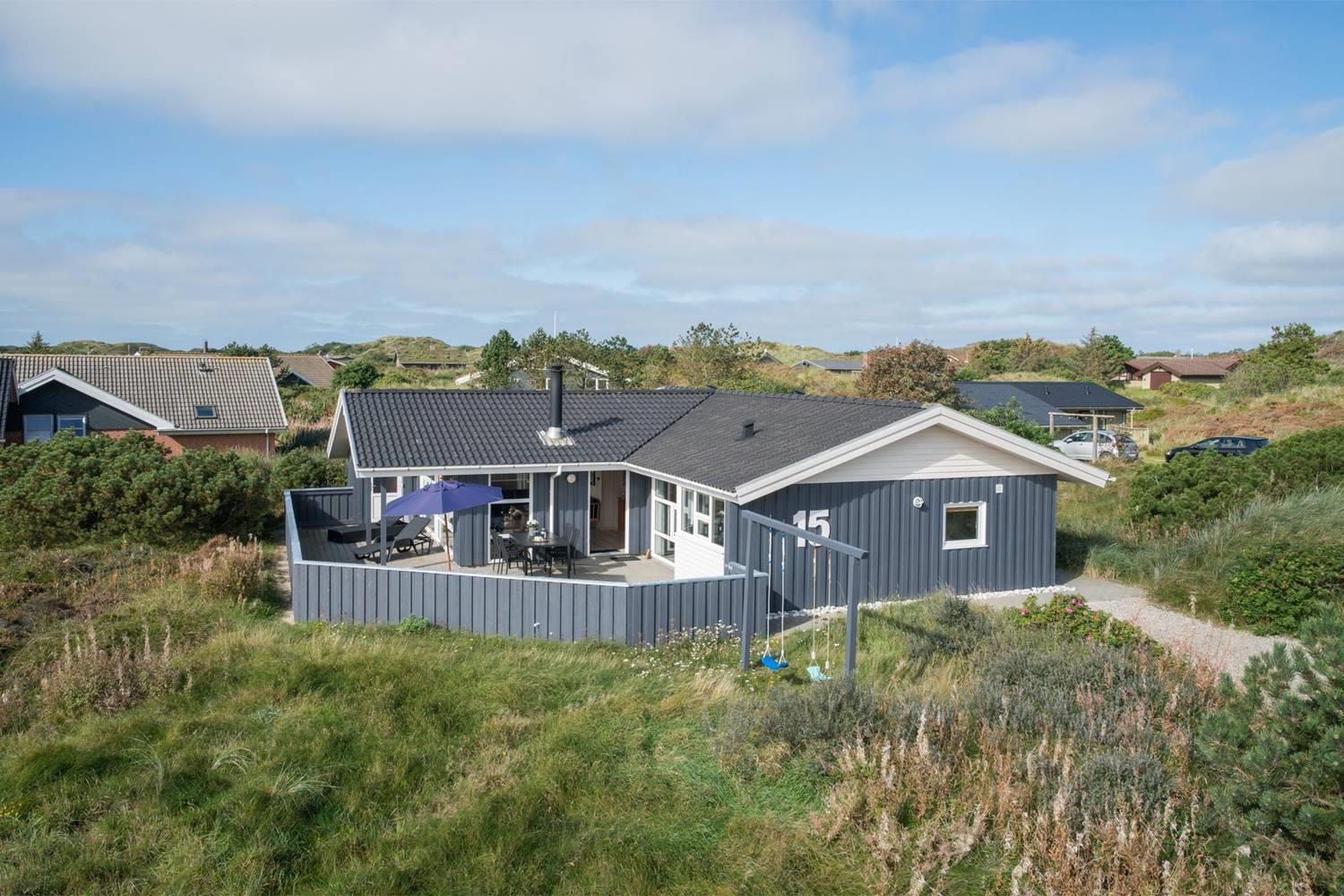 Der Außenbereich im Kløvervej 15 ist wie gemacht für entspannte Urlaubstage an der frischen Nordseeluft. Auf der geschlossenen Terrasse können Hunde und kleine Kinder sicher spielen, während du ganz entspannt die Sonne genießt. Die überdachte Terrasse bietet auch bei wechselhaftem Wetter einen geschützten Platz für gemütliche Stunden im Freien – ideal für ein ausgedehntes Frühstück oder einen ruhigen Abend. Für die kleinen Gäste sorgen Schaukel und Sandkasten für jede Menge Spaß, während die Großen die ruhige Lage und den Blick auf die umliegende Natur genießen.