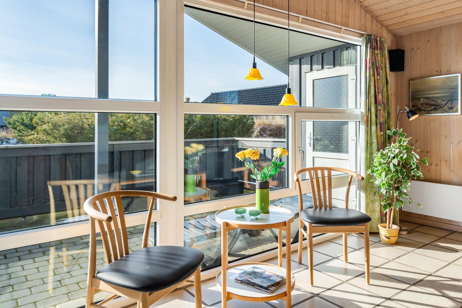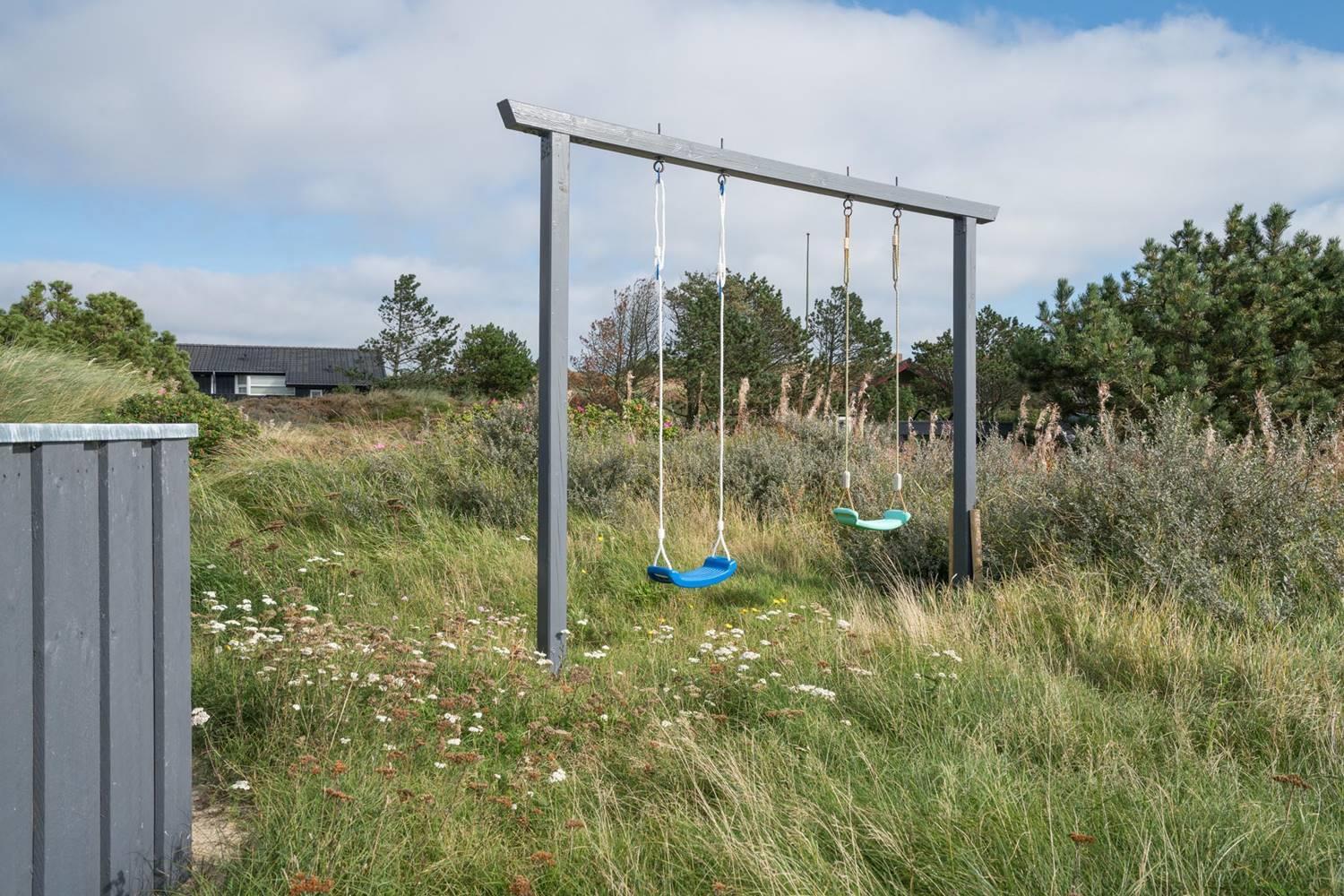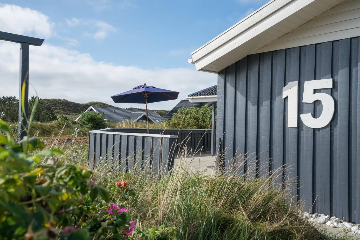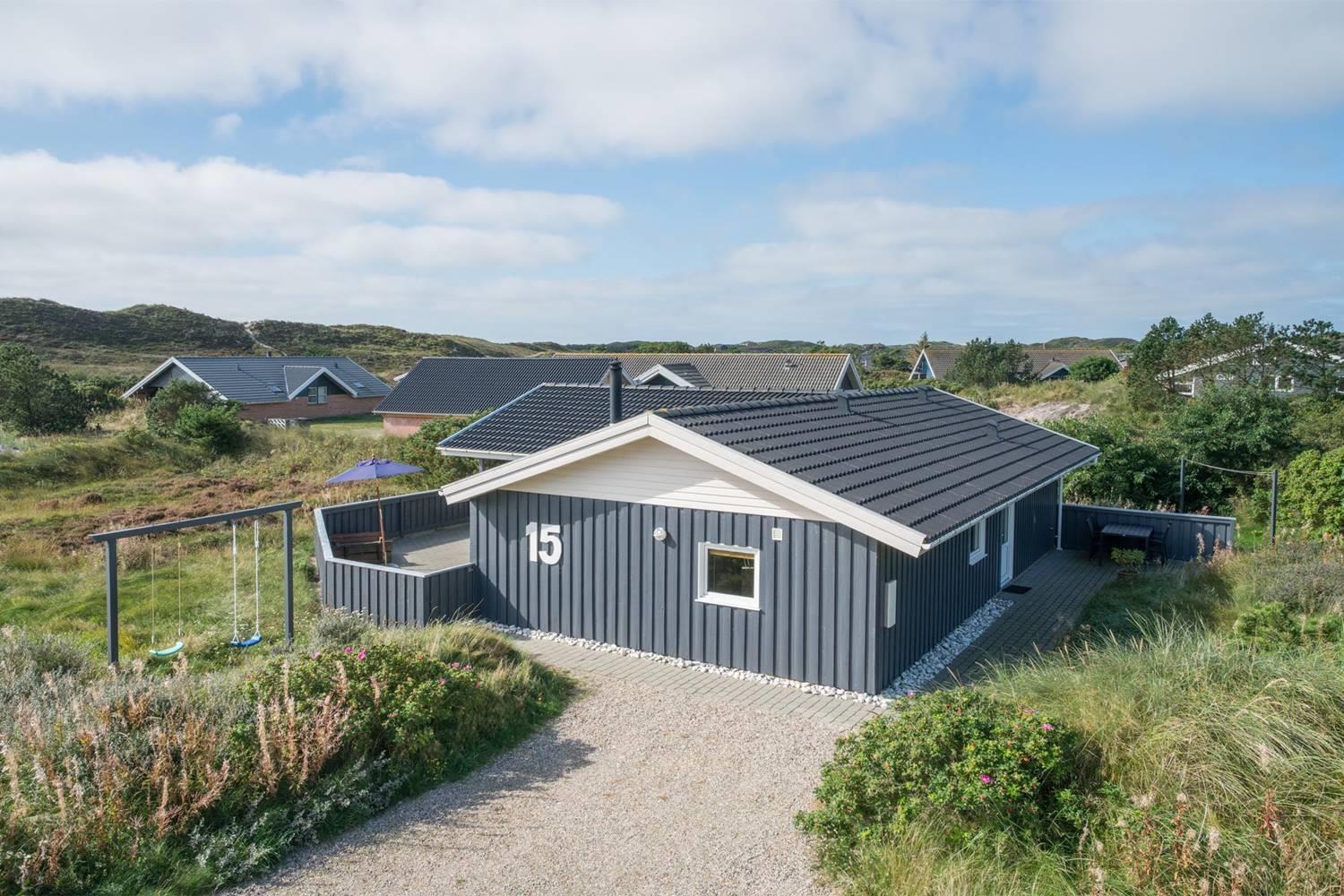 Der Außenbereich im Kløvervej 15 ist wie gemacht für entspannte Urlaubstage an der frischen Nordseeluft. Auf der geschlossenen Terrasse können Hunde und kleine Kinder sicher spielen, während du ganz entspannt die Sonne genießt. Die überdachte Terrasse bietet auch bei wechselhaftem Wetter einen geschützten Platz für gemütliche Stunden im Freien – ideal für ein ausgedehntes Frühstück oder einen ruhigen Abend. Für die kleinen Gäste sorgen Schaukel und Sandkasten für jede Menge Spaß, während die Großen die ruhige Lage und den Blick auf die umliegende Natur genießen.
