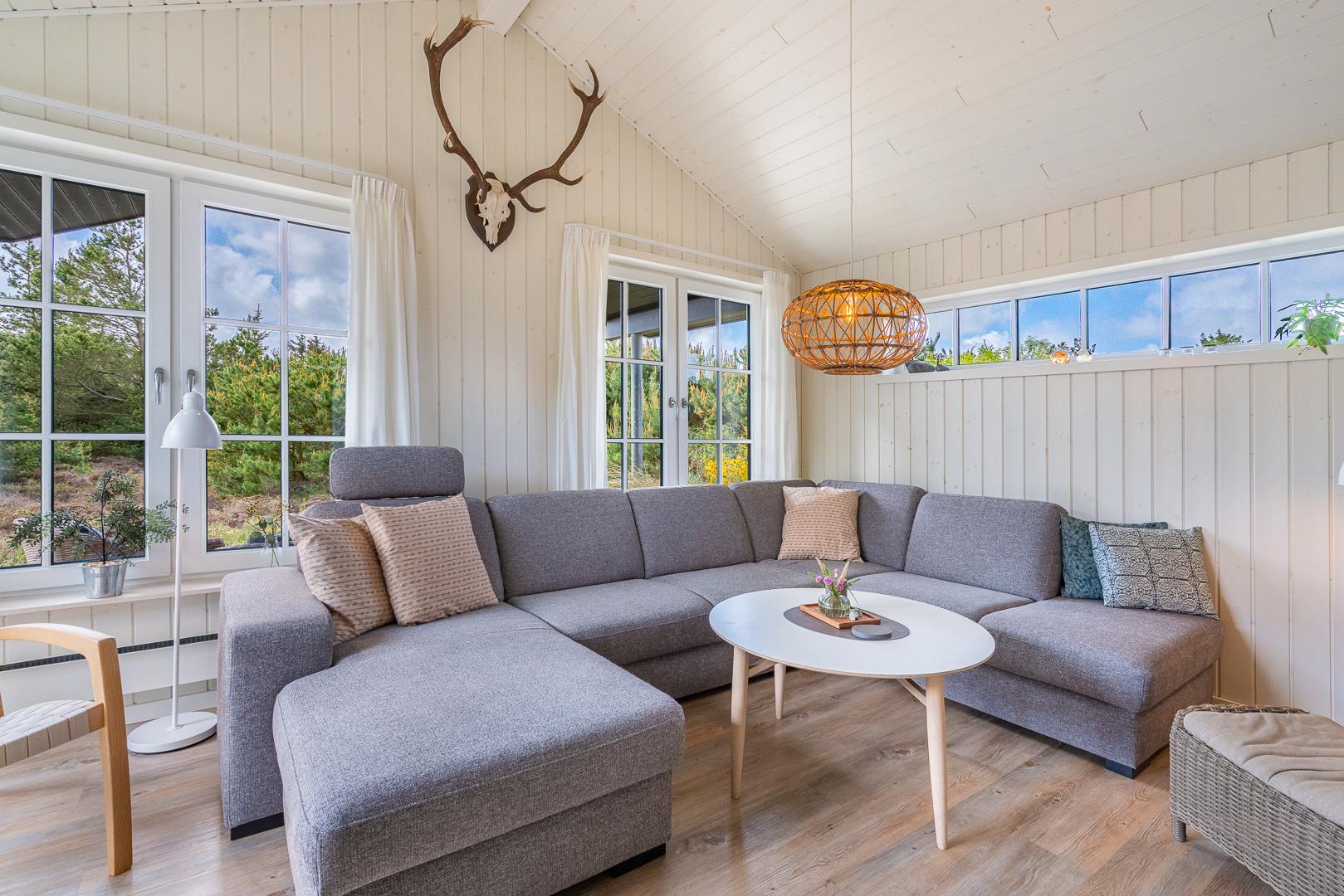 Die Küche ist in das schöne Wohnzimmer des Hauses integriert, in dem schöne Kunst an den Wänden, stilvolle Möbel und schönes Licht aus den vielen Sprossen-Fenstern des Hauses genossen werden kann. Das Wohnzimmer hat auch einen Holzofen für die kühlen, gemütlichen Abende. Wenn Sie sich vor dem Fernseher etwas entspannen möchten, können Sie den Chromecast einschalten und Ihre Lieblingsserie streamen - oder einfach zwischen der Auswahl von dänisch und deutsche Kanäle wählen.
