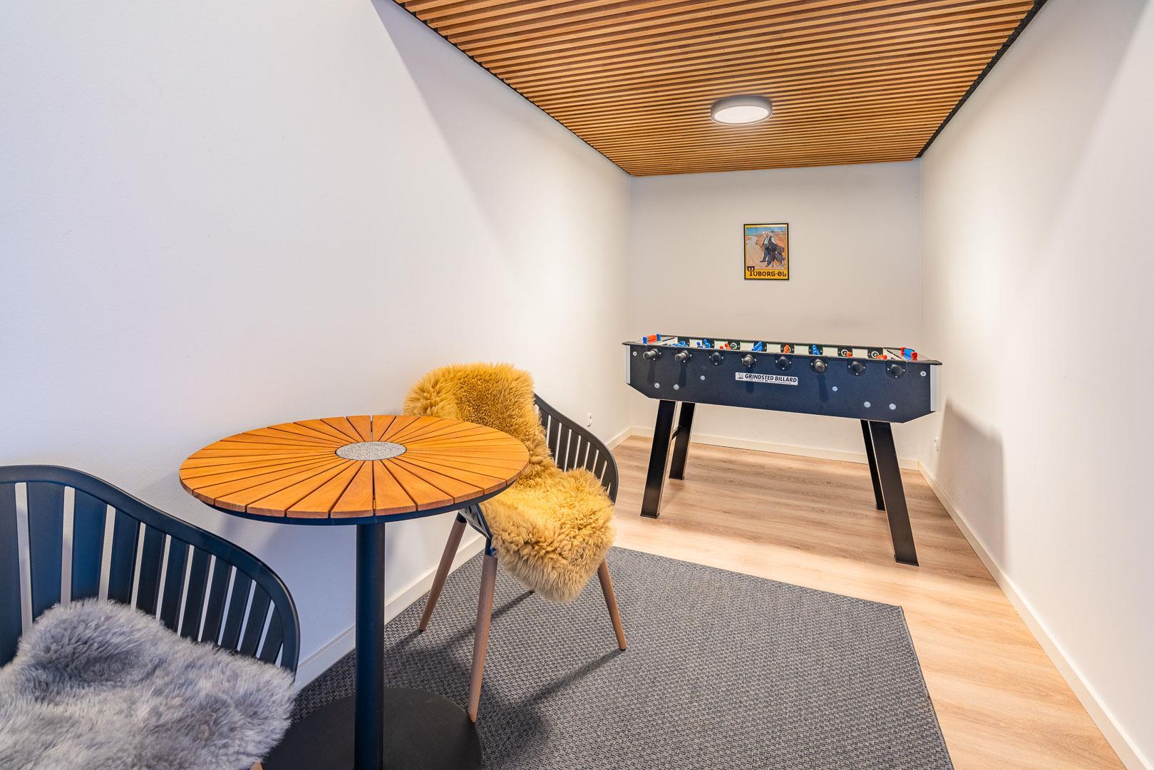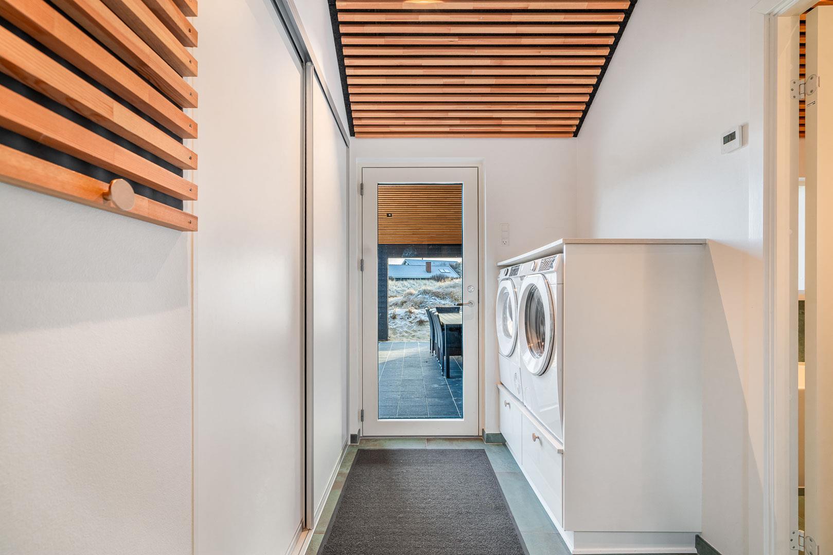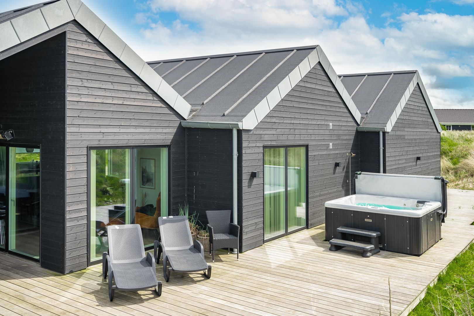 Ein großzügiger Eingangsbereich mit Waschmaschine und Wäschetrockner sowie ein großer Dachboden, auf dem die Kinder spielen können, runden die Inneneinrichtung ab. Im Nebengebäude finden Sie einen Aktivitätsraum mit Tischfußball und extra Kühl- und Gefrierschrank. Am Eingang des Ferienhauses finden Sie eine große überdachte Terrasse mit Gartenmöbeln, Lounge-Set und Terrassenheizern. Die gesamte Rückseite des Hauses verfügt über eine schöne Holzterrasse, einschließlich eines überdachten Teils. In diesem fantastischen Ferienhaus können Sie sowohl drinnen als auch draußen viele herrliche Stunden verbringen – ein Außen-Whirlpool, eine Außendusche und Sonnenliegen vervollständigen die stilvolle Außenausstattung des Hauses.