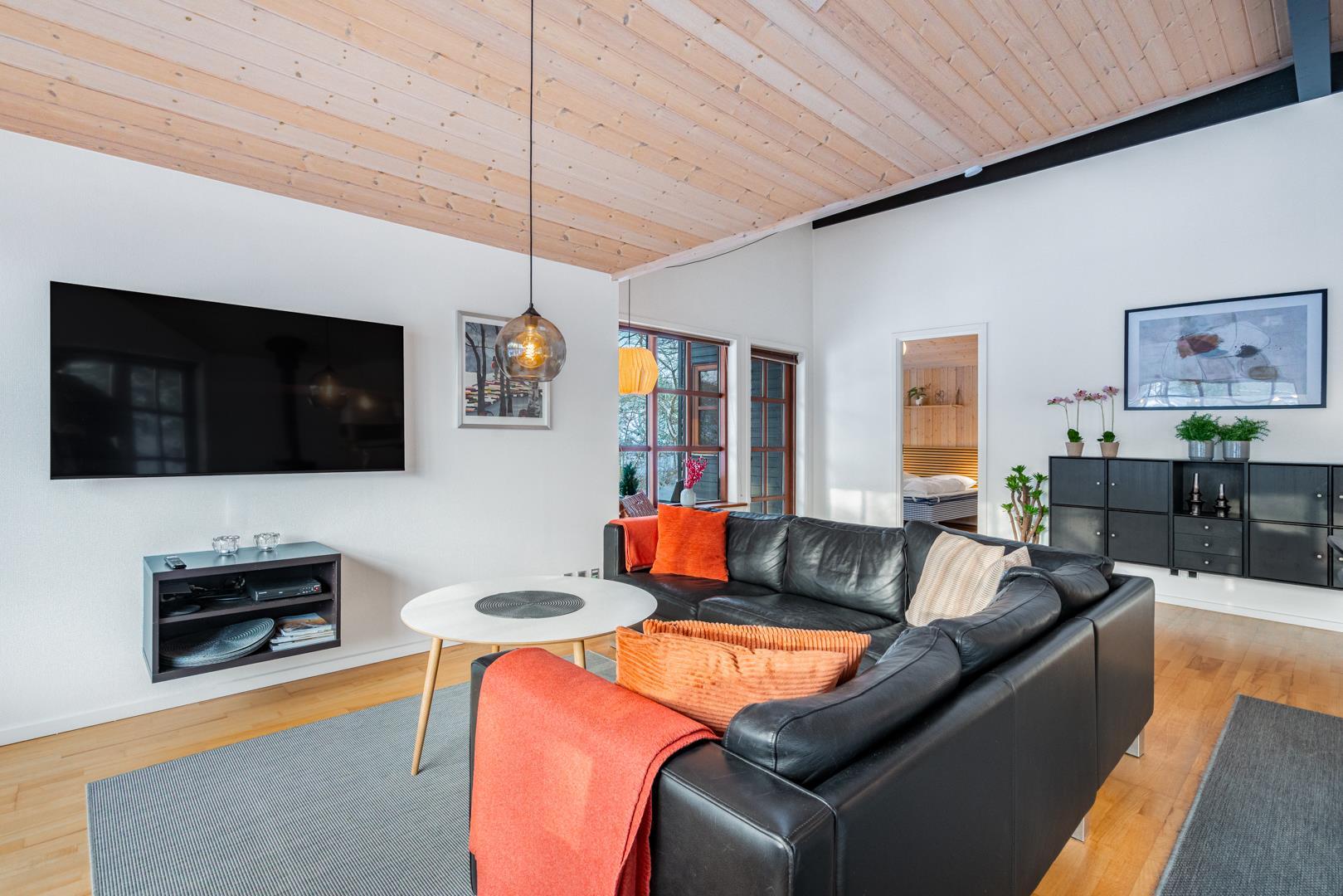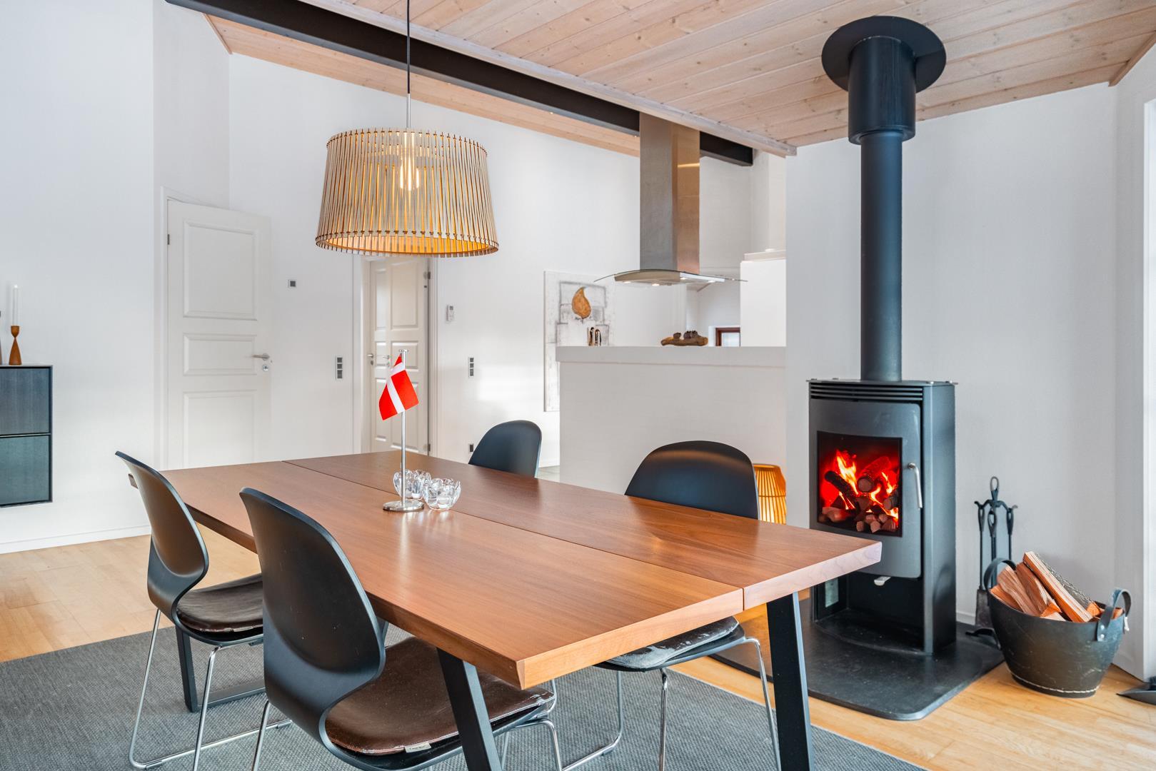 Das Haus ist hell und einladend mit hohen Decken bis zum First, die ein großzügiges Raumgefühl schaffen. Wohnzimmer, Essbereich und die gut ausgestattete Küche sind offen miteinander verbunden und bilden den idealen Mittelpunkt für gemeinsame Zeit.