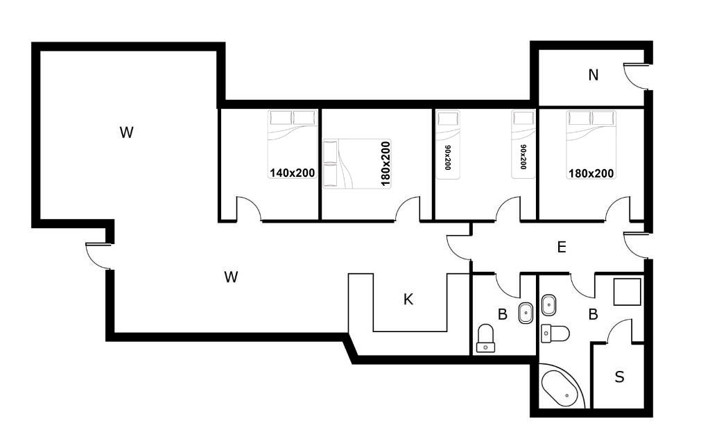 Bettengrösse: 2 Doppelbetten 180 x 200 cm + 1 Doppelbett 140 x 200 cm + 2 Einzelbetten 90 x 200 cm.