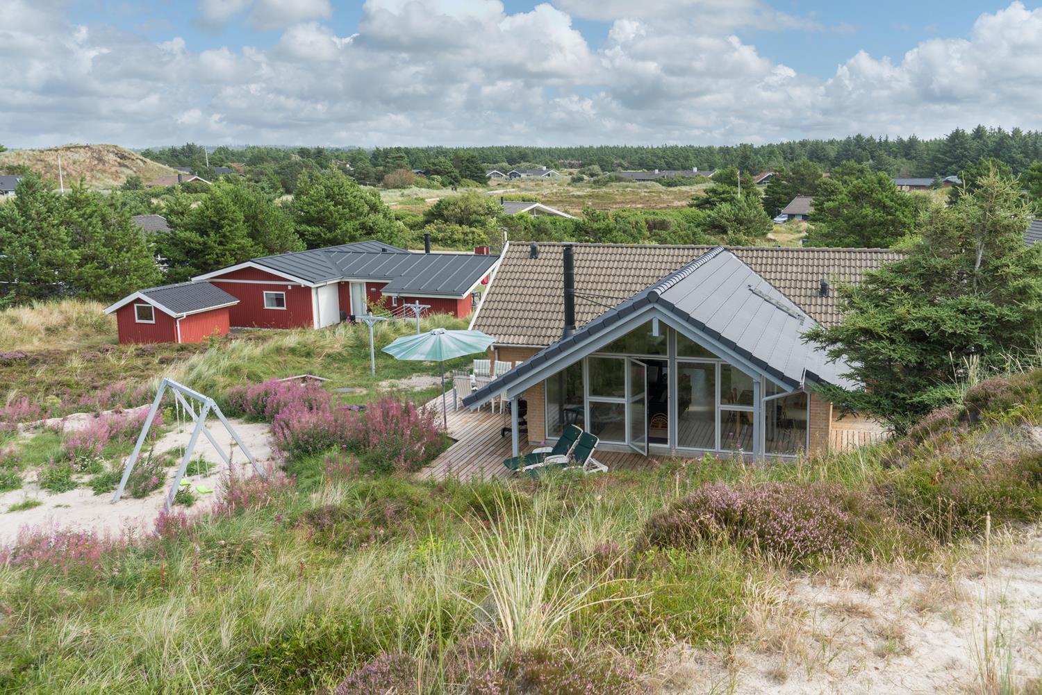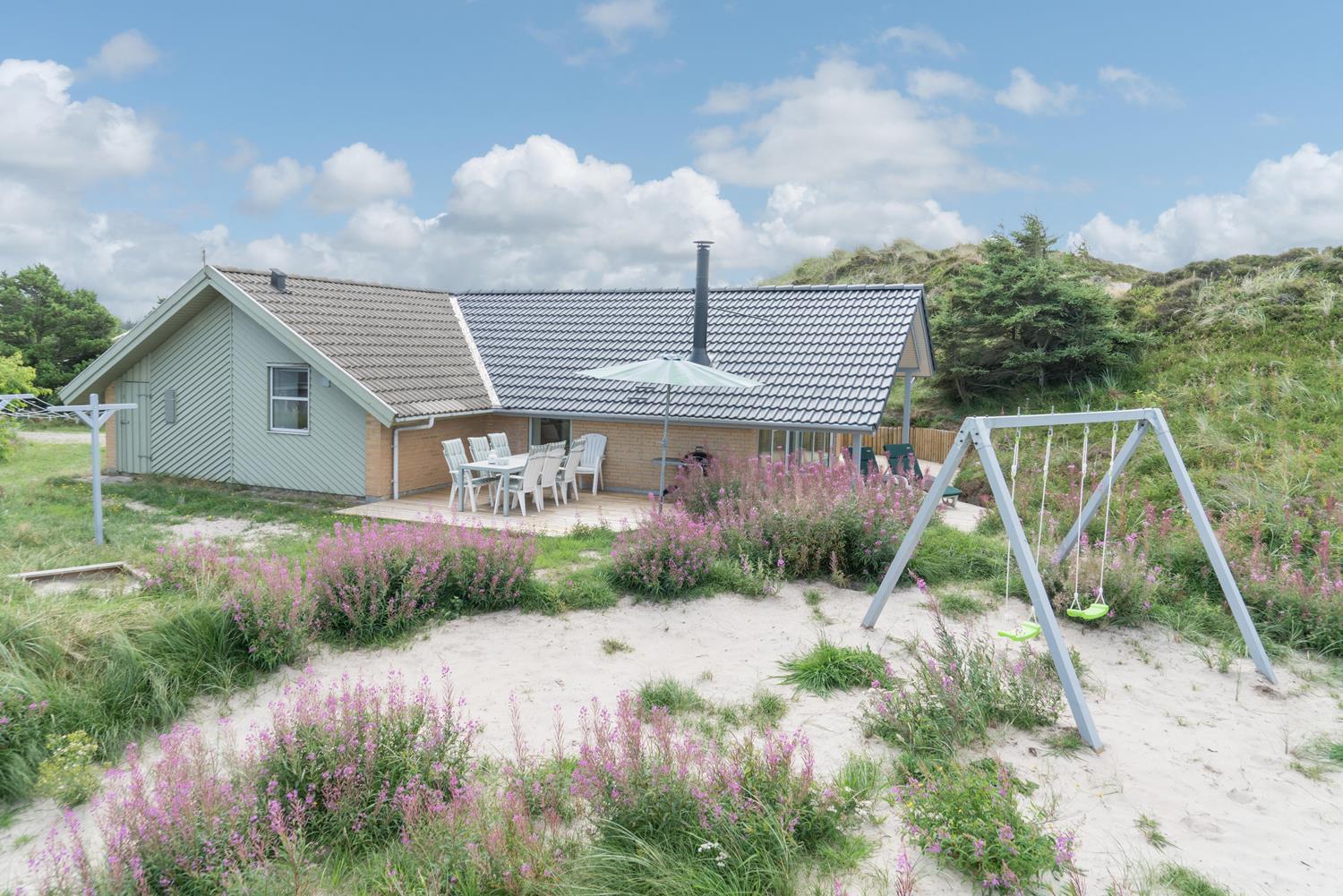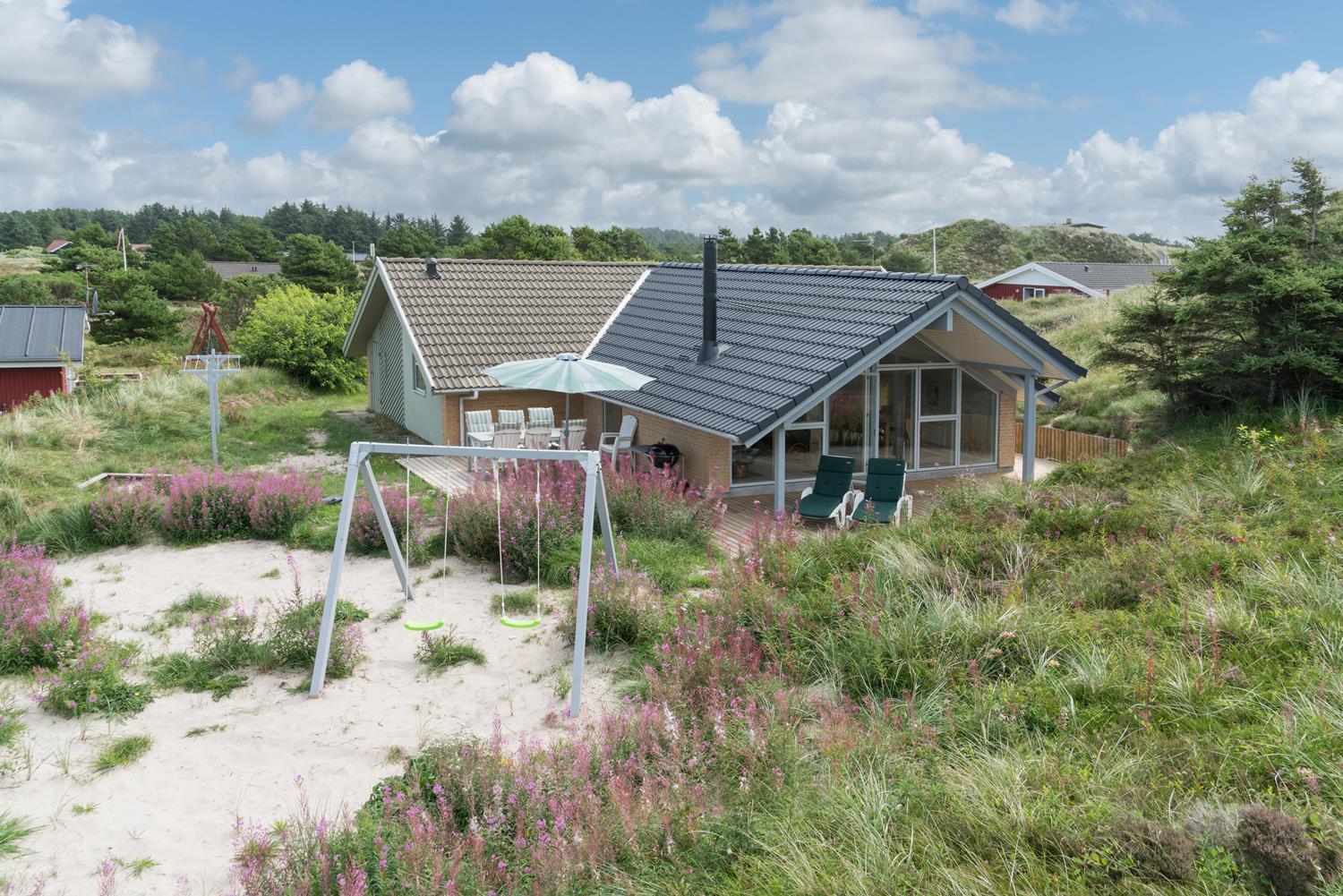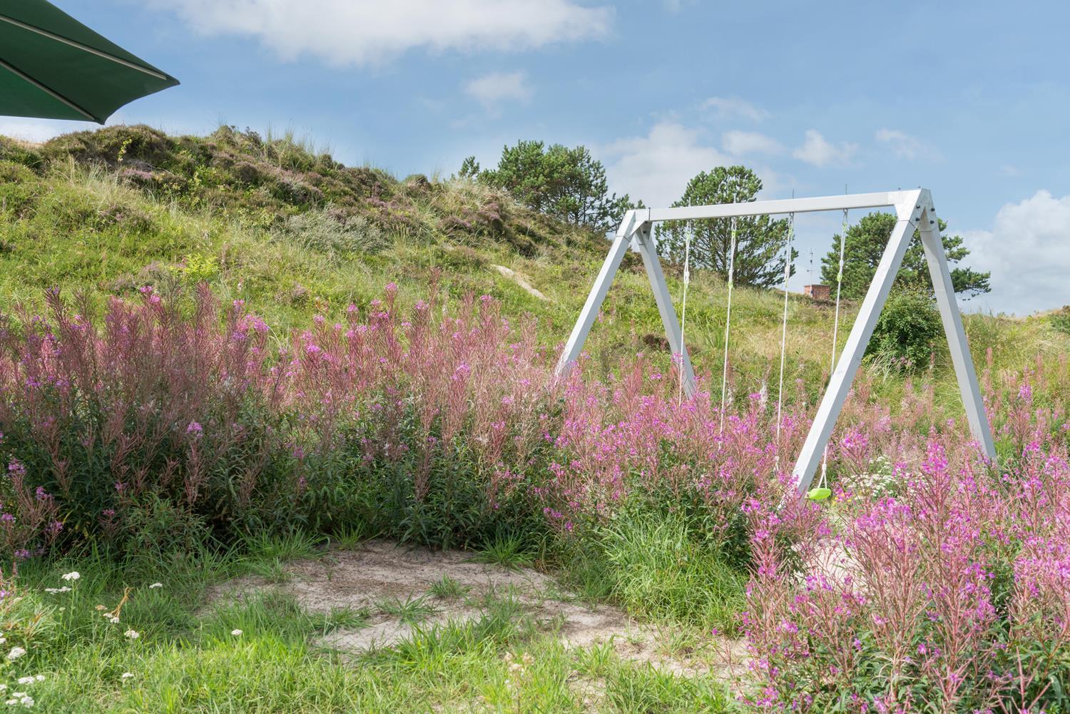 Ein Teil der Terrasse ist überdacht, so dass Sie sich bei Regenwetter unter dem Dach aufhalten können. Hinter dem Haus befindet sich eine hohe Düne, die der Terrasse Schutz bietet. Auch an die kleinen Gäste wurde gedacht. Es gibt sowohl Sandkasten als auch Schaukel.