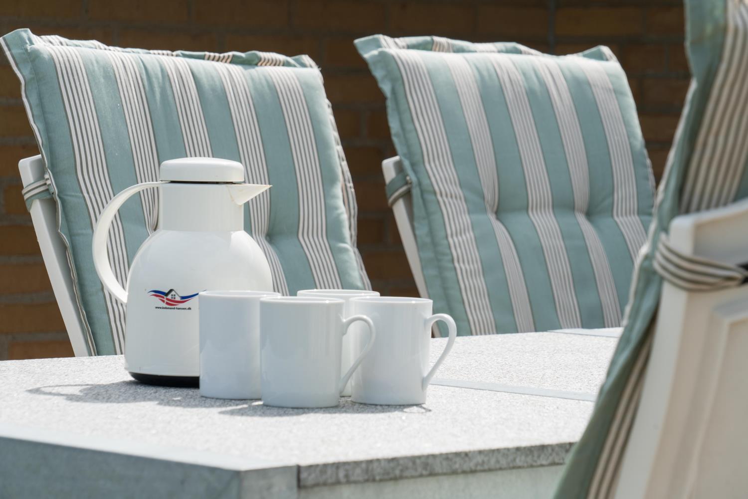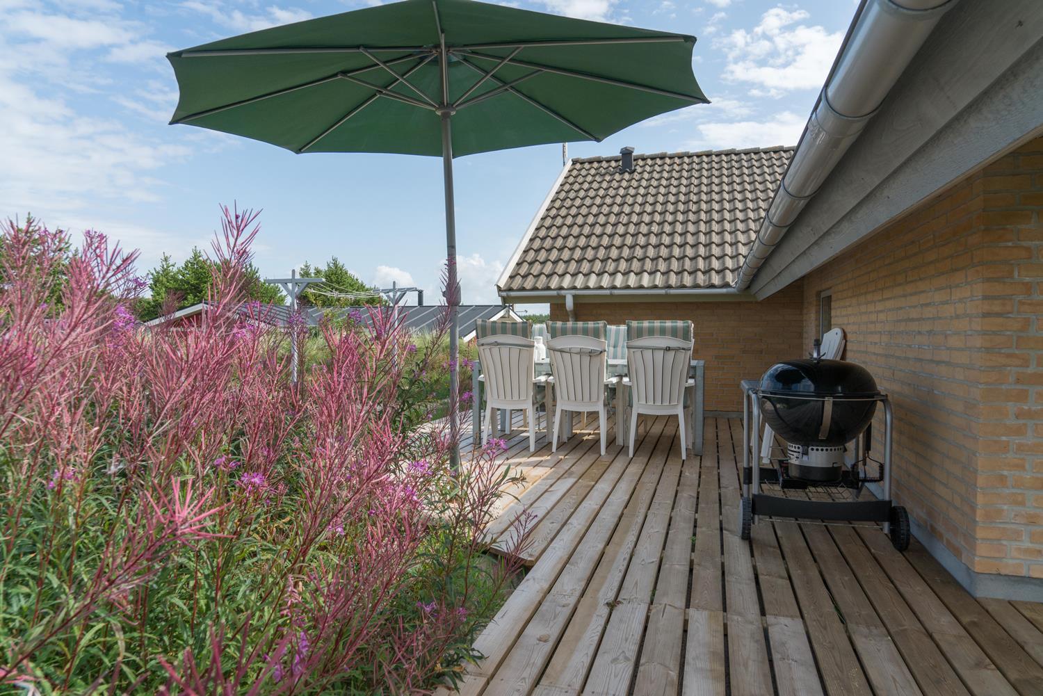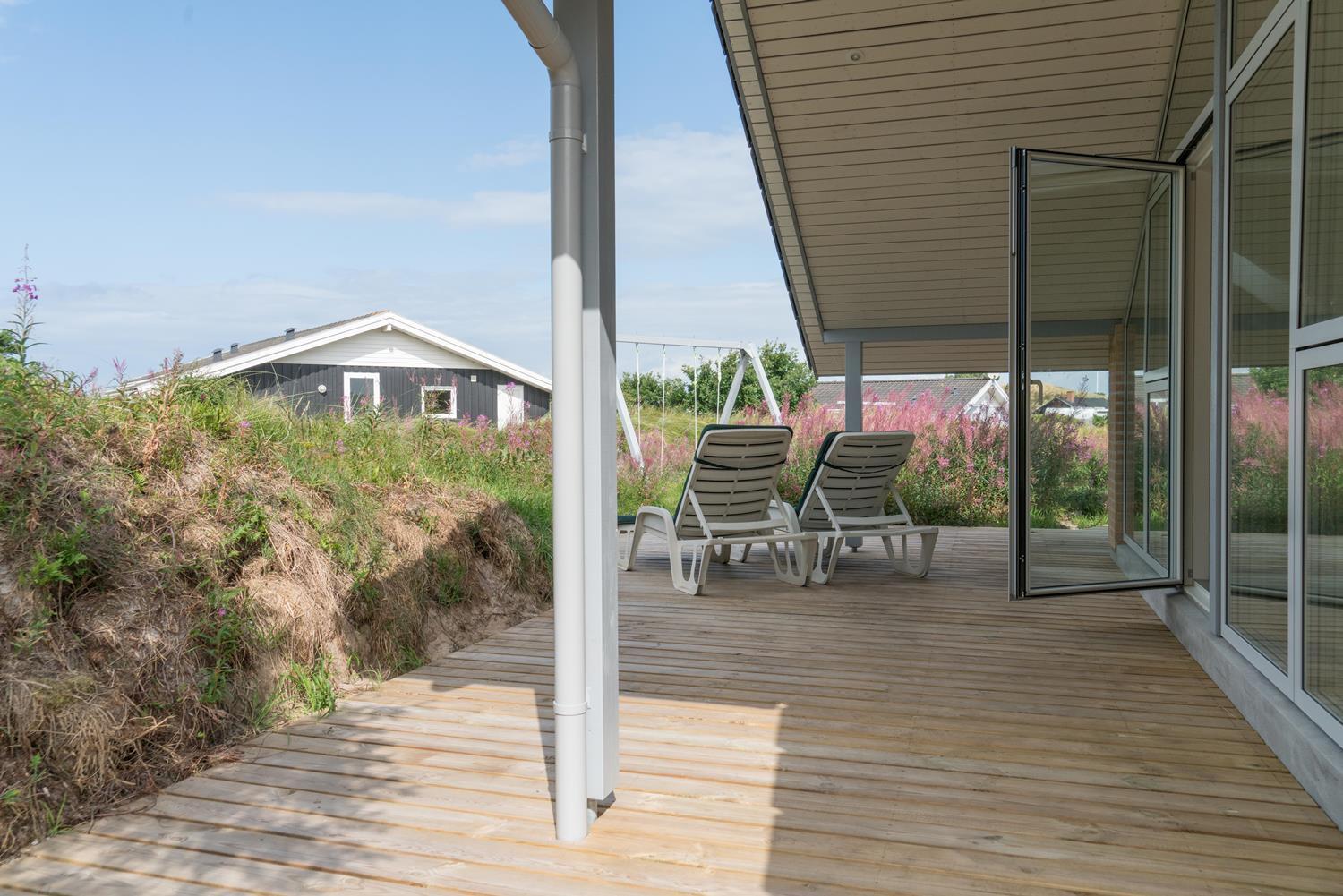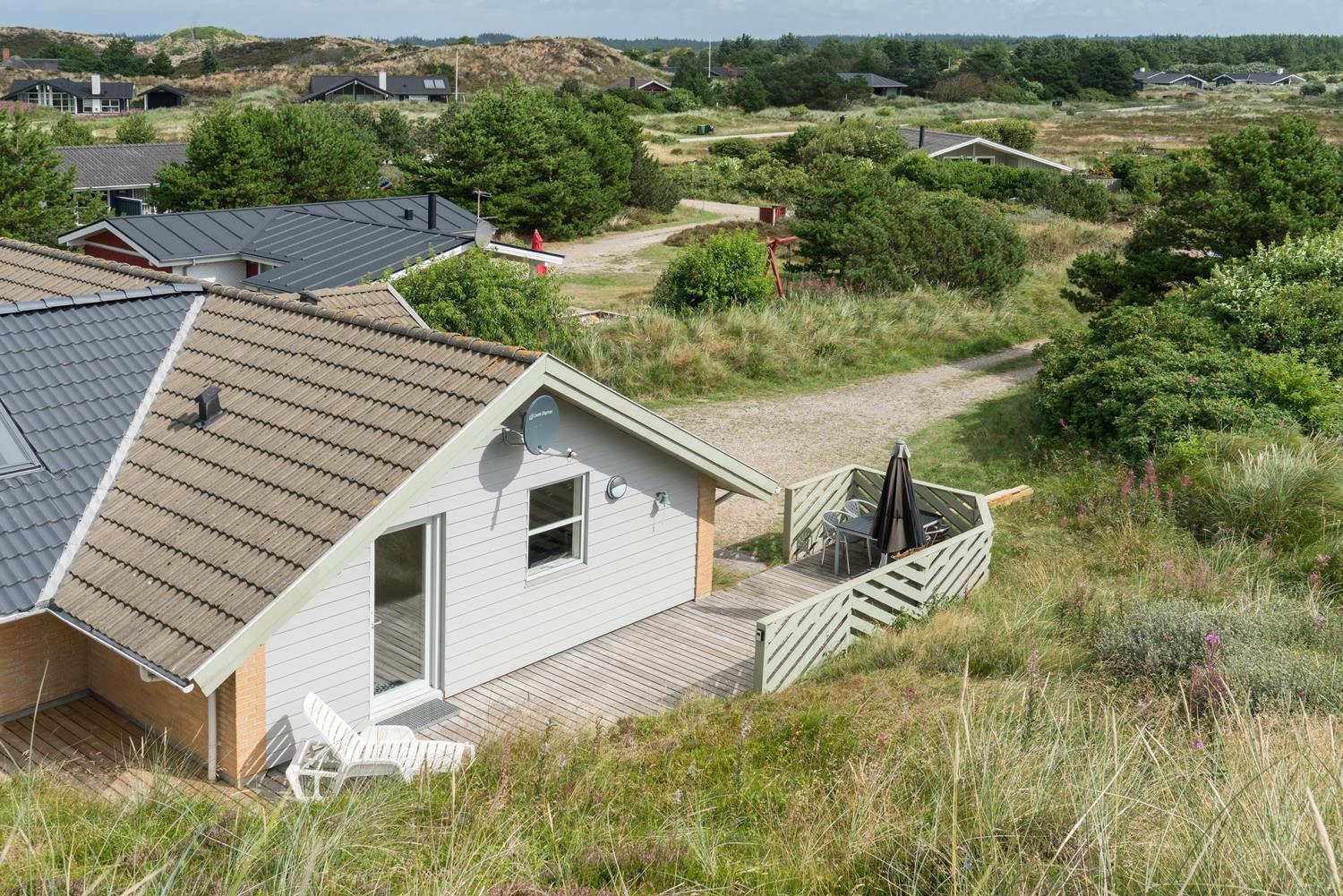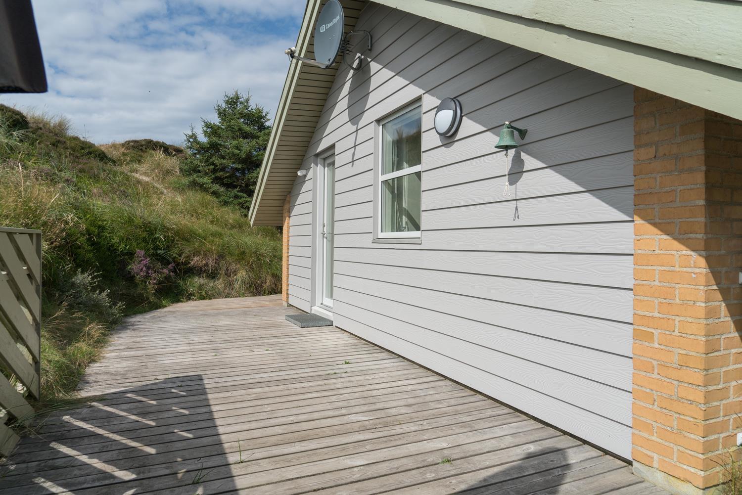 Ein Teil der Terrasse ist überdacht, so dass Sie sich bei Regenwetter unter dem Dach aufhalten können. Hinter dem Haus befindet sich eine hohe Düne, die der Terrasse Schutz bietet. Auch an die kleinen Gäste wurde gedacht. Es gibt sowohl Sandkasten als auch Schaukel.