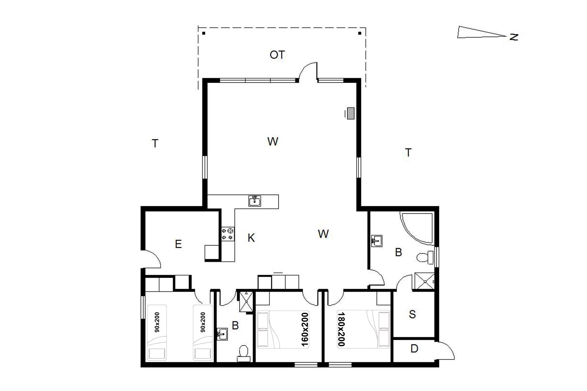 Bettengrößen: 1 Doppelbett: 180x200 cm, 1 Doppelbett: 160x200 cm, 2 Einzelbetten: 90x200 cm.