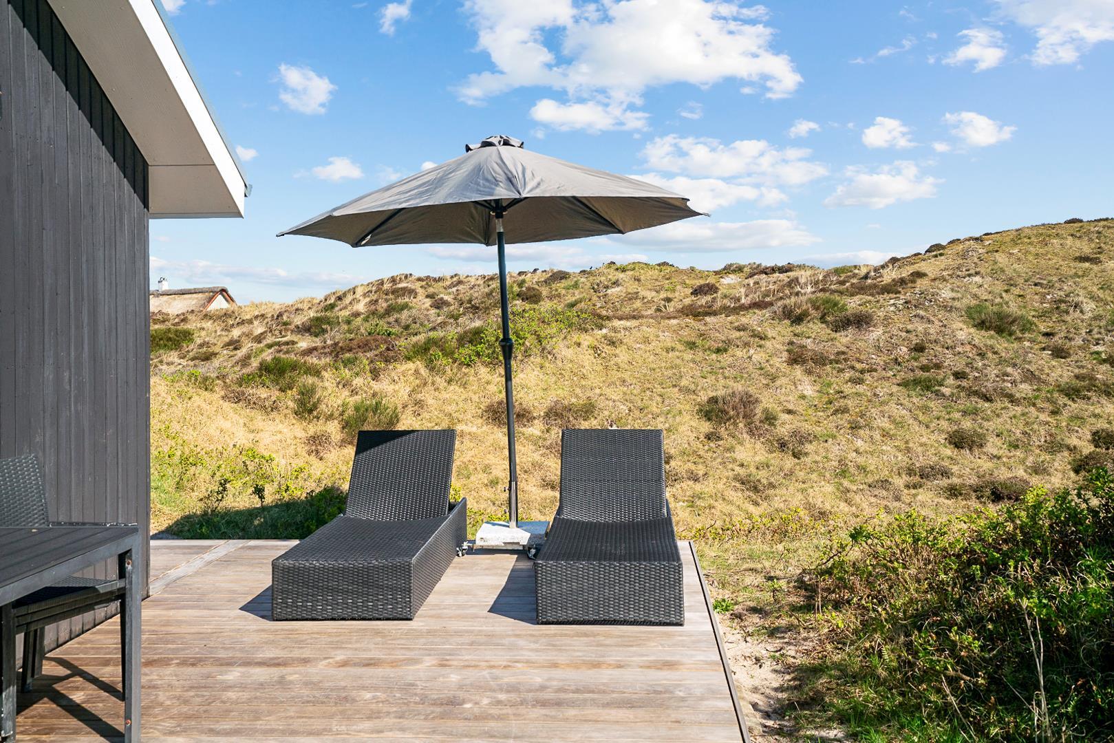Auf einem schönen Dünengrundstück in ruhiger Umgebung liegt dieses schöne, helle Ferienhaus. Das Haus ist sehr gepflegt und mit guten Möbeln eingerichtet. Die hübsche Küche ist mit dem Wohnbereich kombiniert. Vom schönen Wintergarten aus kann man wunderbar die Aussicht über die Umgebung genießen. Auf der schönen Holzterrasse die das Haus umgibt findet man immer eine windgeschützte Ecke.