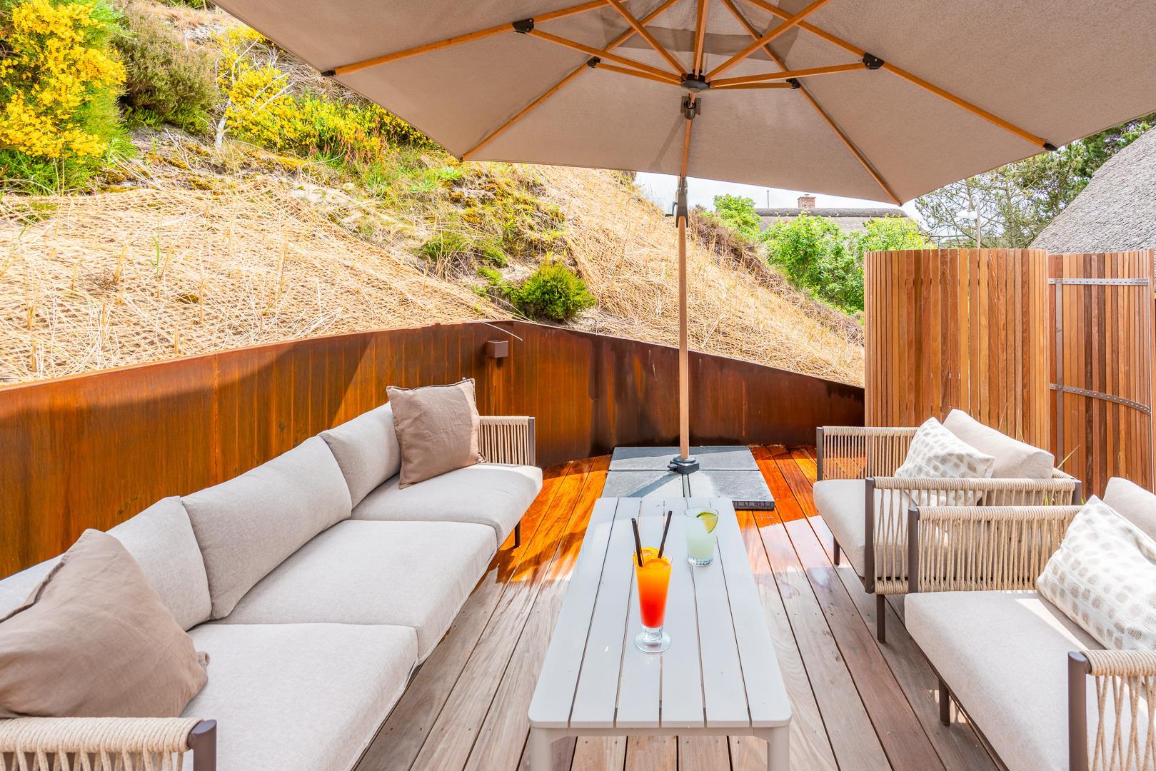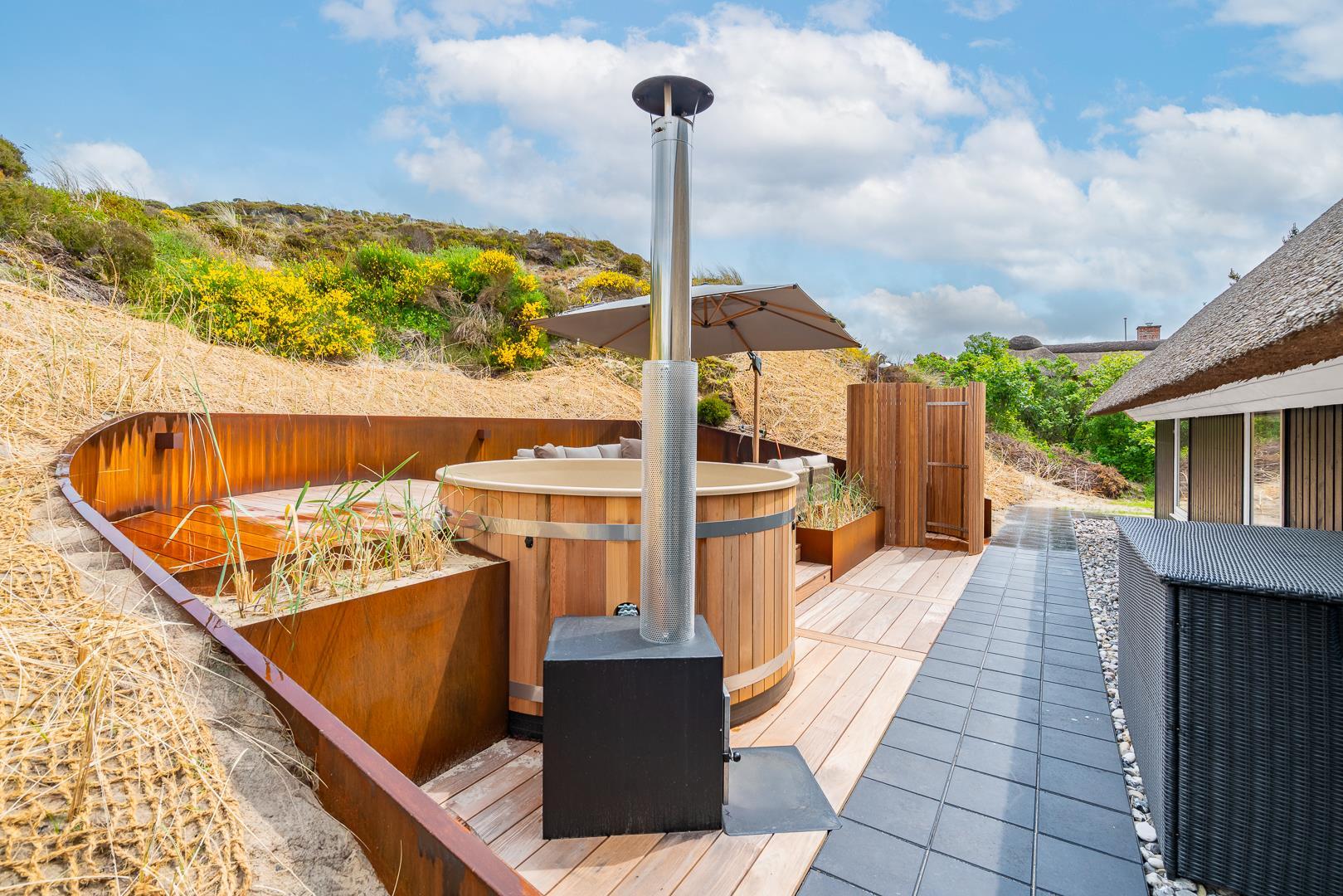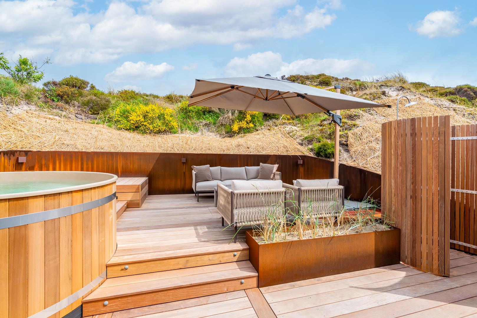 Das Haus steht auf einem großen Naturgrundstück mit bewachsenen Dünen, das nicht nur Ruhe, sondern auch schöne Ausblicke bietet. Im Sommer laden mehrere gut platzierte Terrassen dazu ein, das milde Klima und die herrliche Umgebung in vollen Zügen zu genießen.