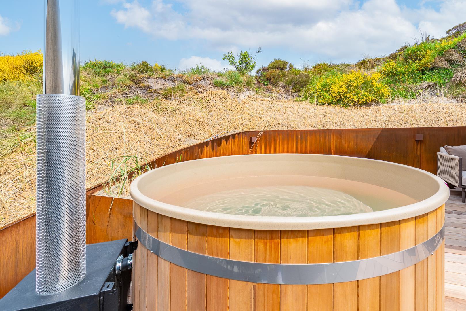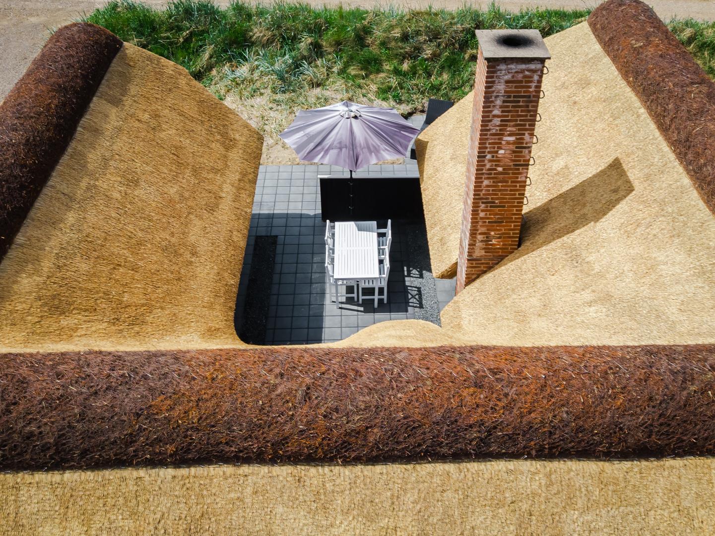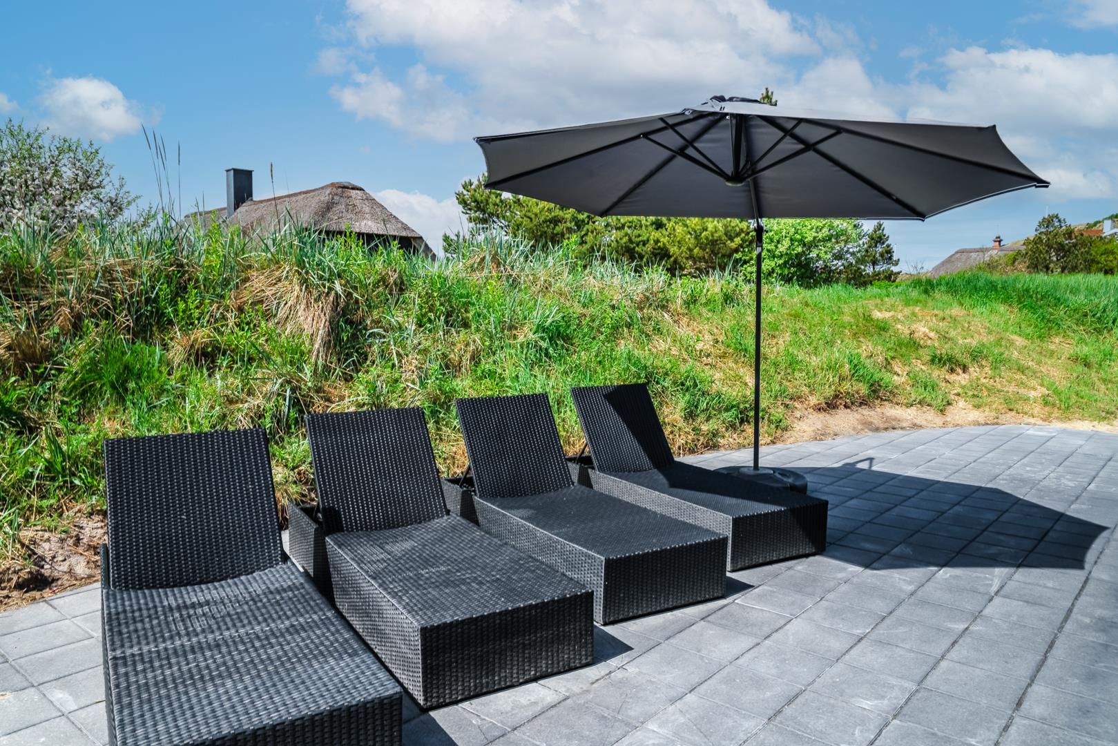 Das Haus steht auf einem großen Naturgrundstück mit bewachsenen Dünen, das nicht nur Ruhe, sondern auch schöne Ausblicke bietet. Im Sommer laden mehrere gut platzierte Terrassen dazu ein, das milde Klima und die herrliche Umgebung in vollen Zügen zu genießen.
