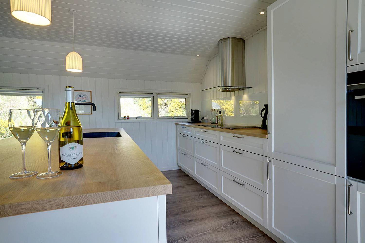 Die offene Küche ist in den Wohnraum integriert und begeistert durch die luftige Architektur mit sichtbaren Balken und offenem Giebel. Die neue Holzofen unterstreicht das gemütliche Ambiente.