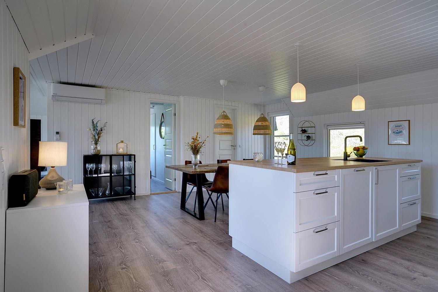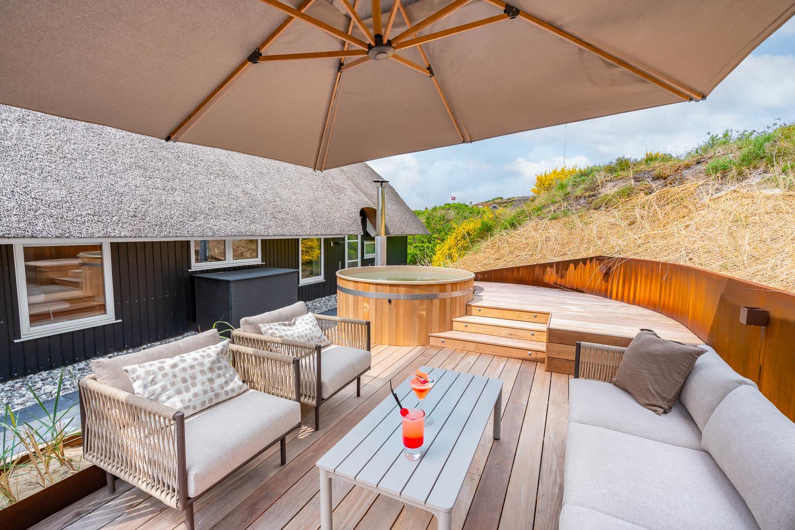 Hier gibt es sowohl einen schönen und einladenden Loungebereich mit Loungemöbeln und einem Wildnisbad -als auch eine große überdachte Terrasse nach Westen. Die große, überdachte Westterrasse ist ideal für Nachmittage mit Kartenspielen oder kühler Buttermilch, Grillabende oder einen Gin Tonic bei Sonnenuntergang. Vom großzügigen Wohnbereich gelangt man direkt hinaus.