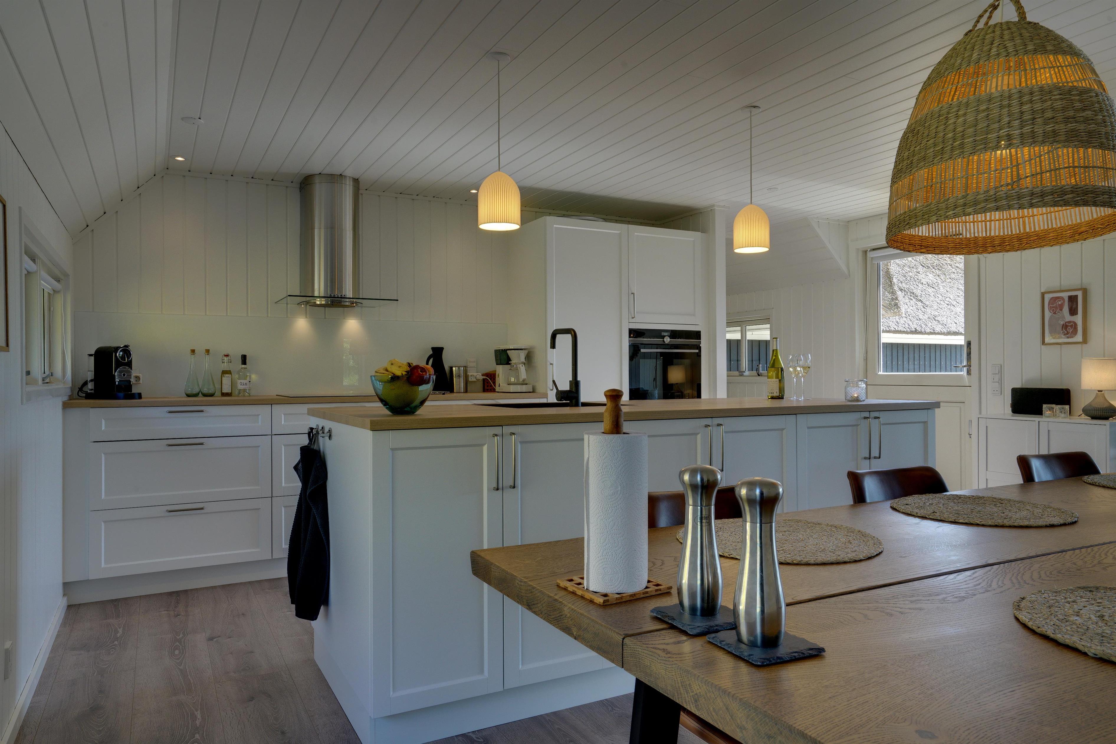 Der Wohnbereich selbst ist ein echtes Highlight: hell, einladend und mit skandinavischem Interieur, das durch hochwertige Materialien, ein stilvolles Sofa-Arrangement, einen großen Esstisch und bequeme Stühle überzeugt. Ein Sonos-System sorgt für den passenden Klang zu jeder Gelegenheit.