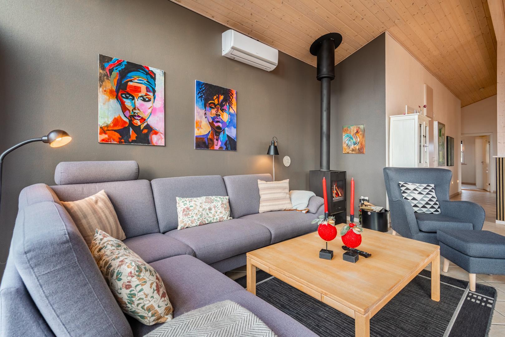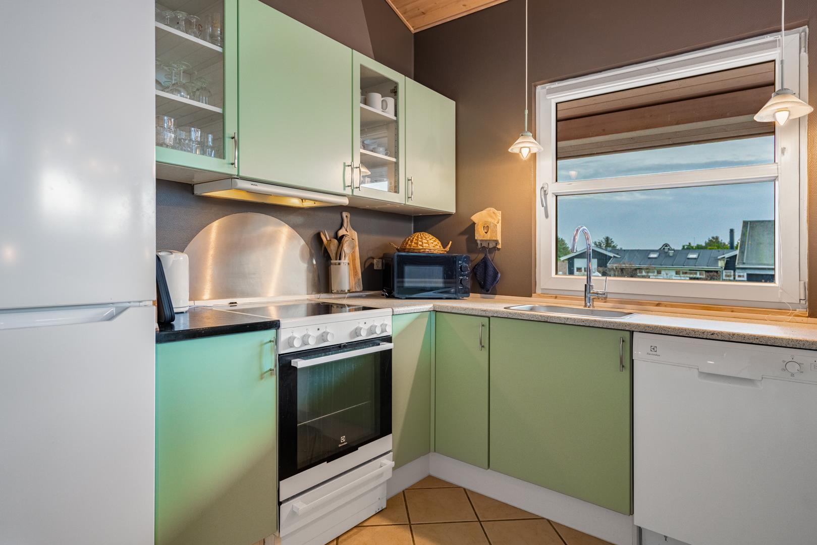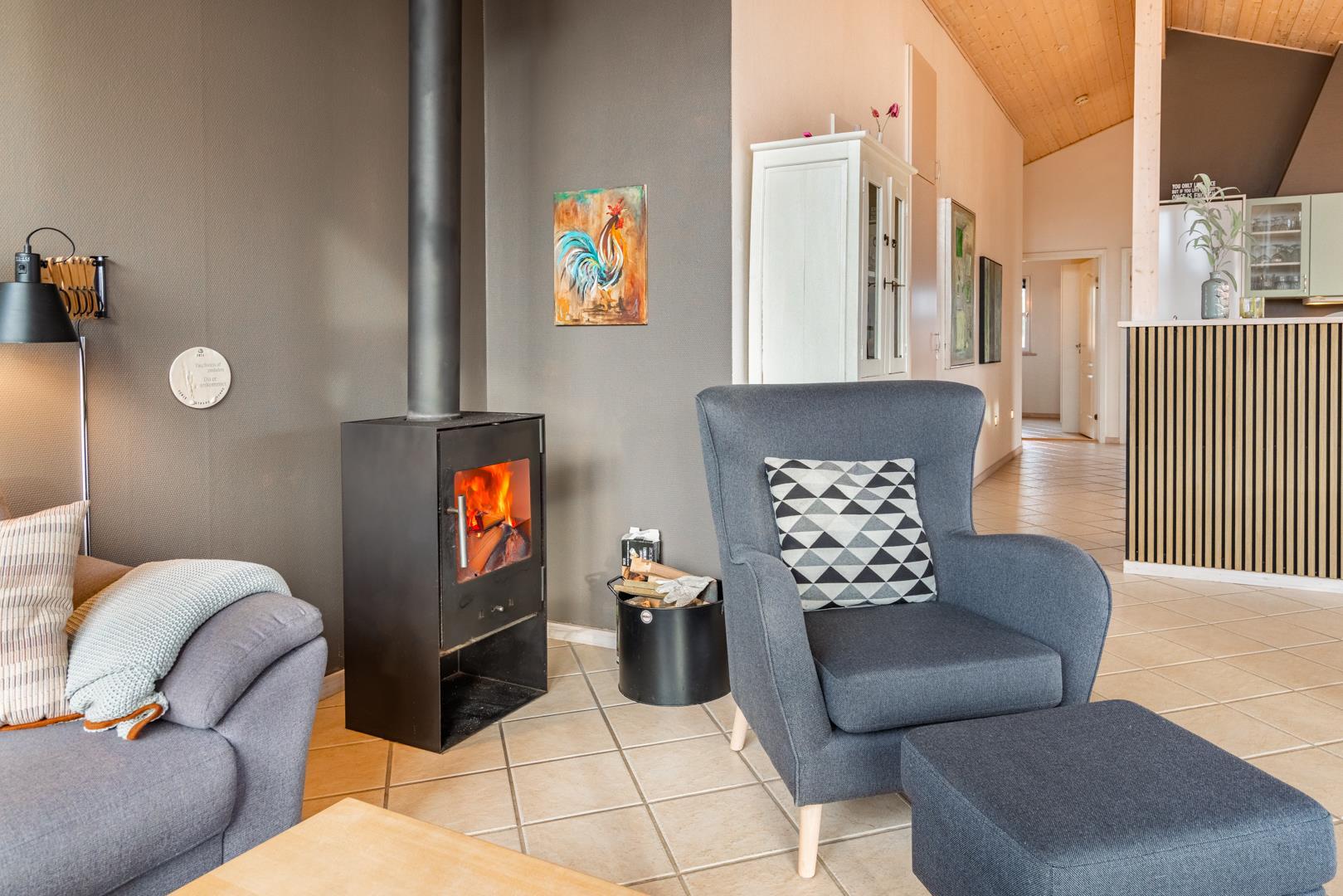 Die gut ausgestattete Küche ist offen mit dem hellen eingerichteten Wohnzimmer verbunden. Hier können Sie gemeinsame Mahlzeiten genießen und sich in den komfortablen Möbeln nach einem erlebnisreichen Tag entspannen. Der offene Grundriss sorgt für eine einladende Atmosphäre und macht das Haus zum natürlichen Treffpunkt.