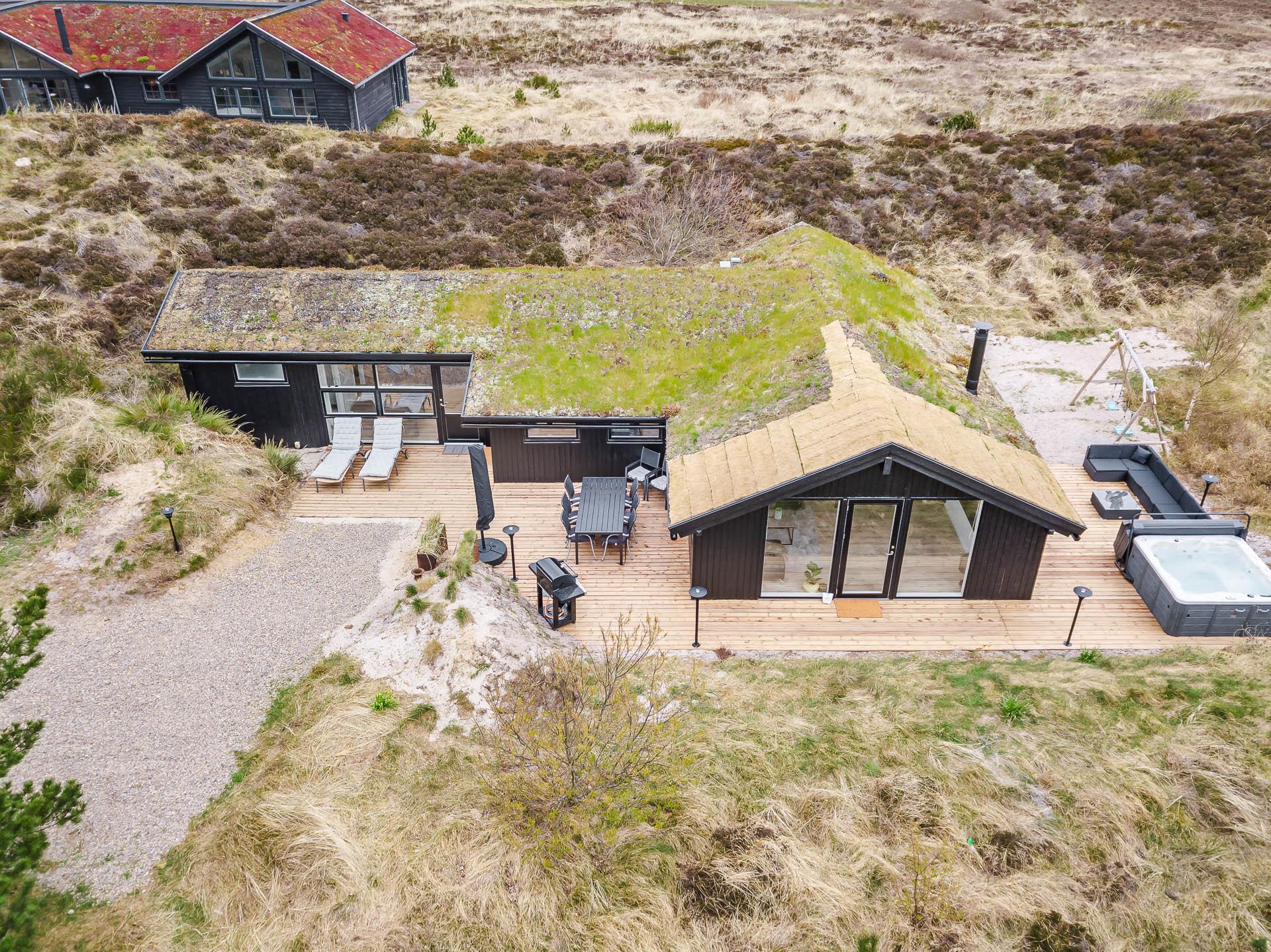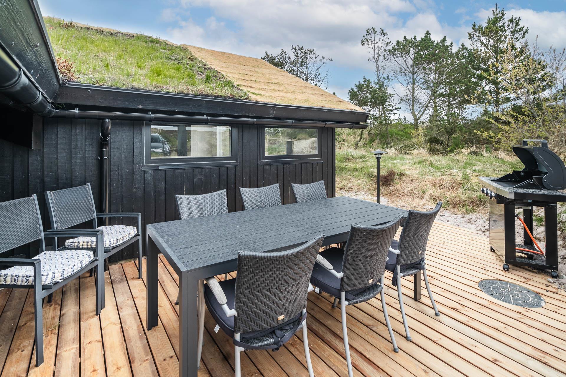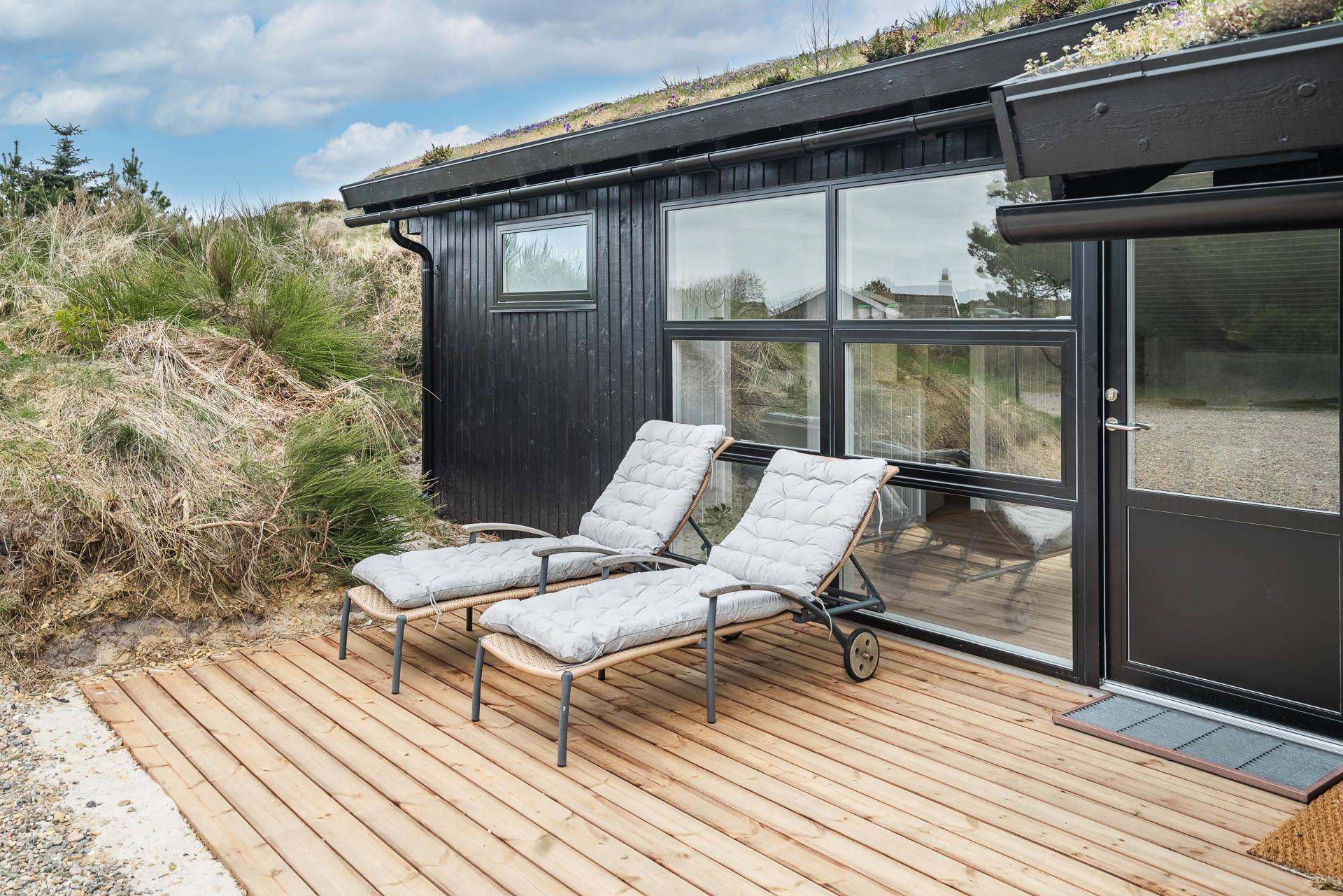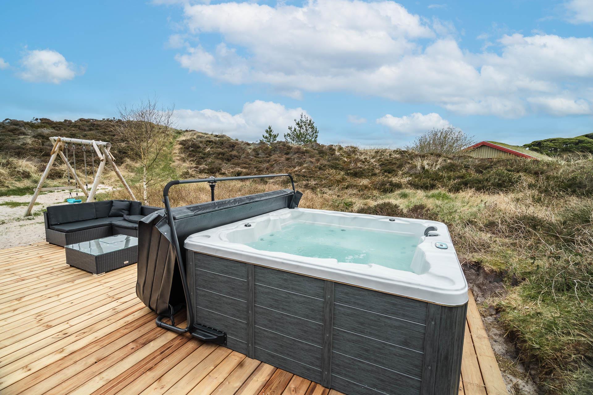 Vom Wohnzimmer aus gelangt man auf eine große, ungestörte Holzterrasse mit Lounge-Gartenmöbeln, - hier kann man die Ruhe in vollen Zügen genießen oder einen Ausflug in den Aussen-Whirlpool unternehmen kann. Der gemütliche Urlaubsort Henne Strand kann gut zu Fuss erreicht werden, hier können Sie die guten Cafés und Restaurants genießen oder in den Geschäften des Ortes einkaufen.