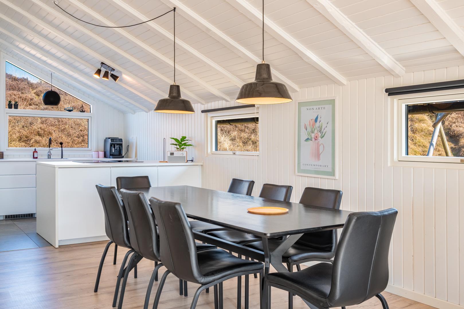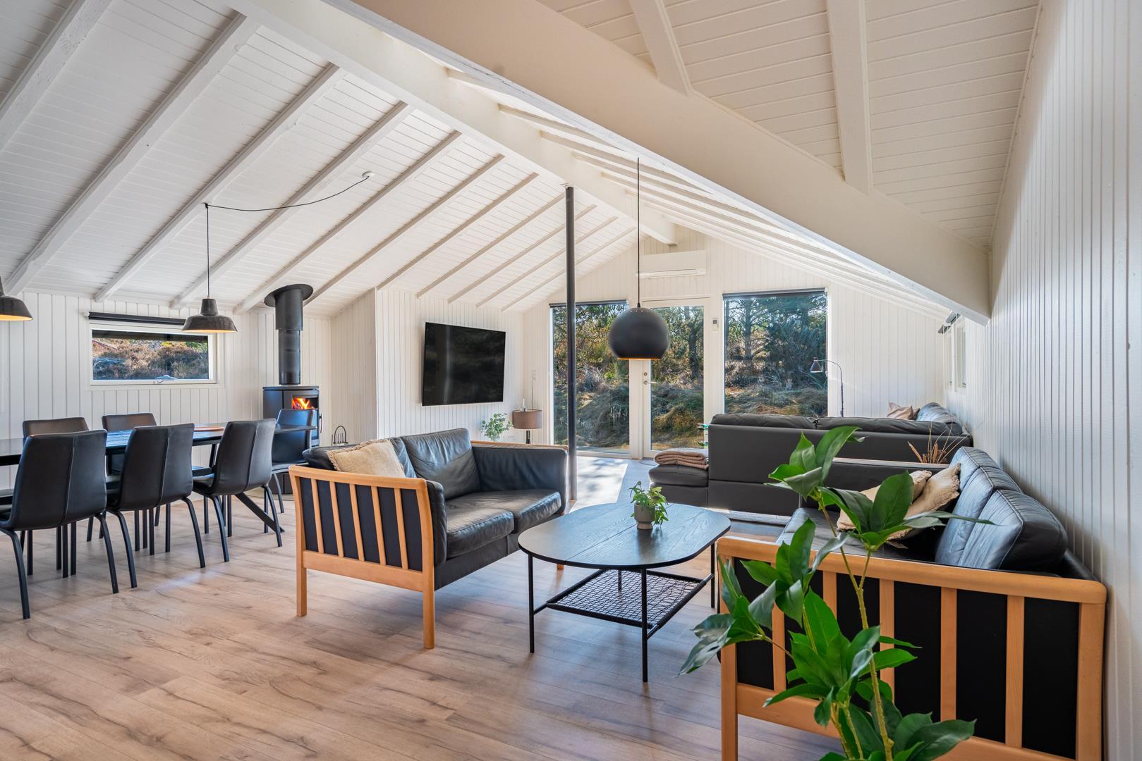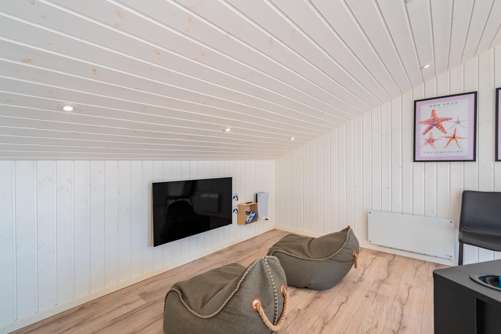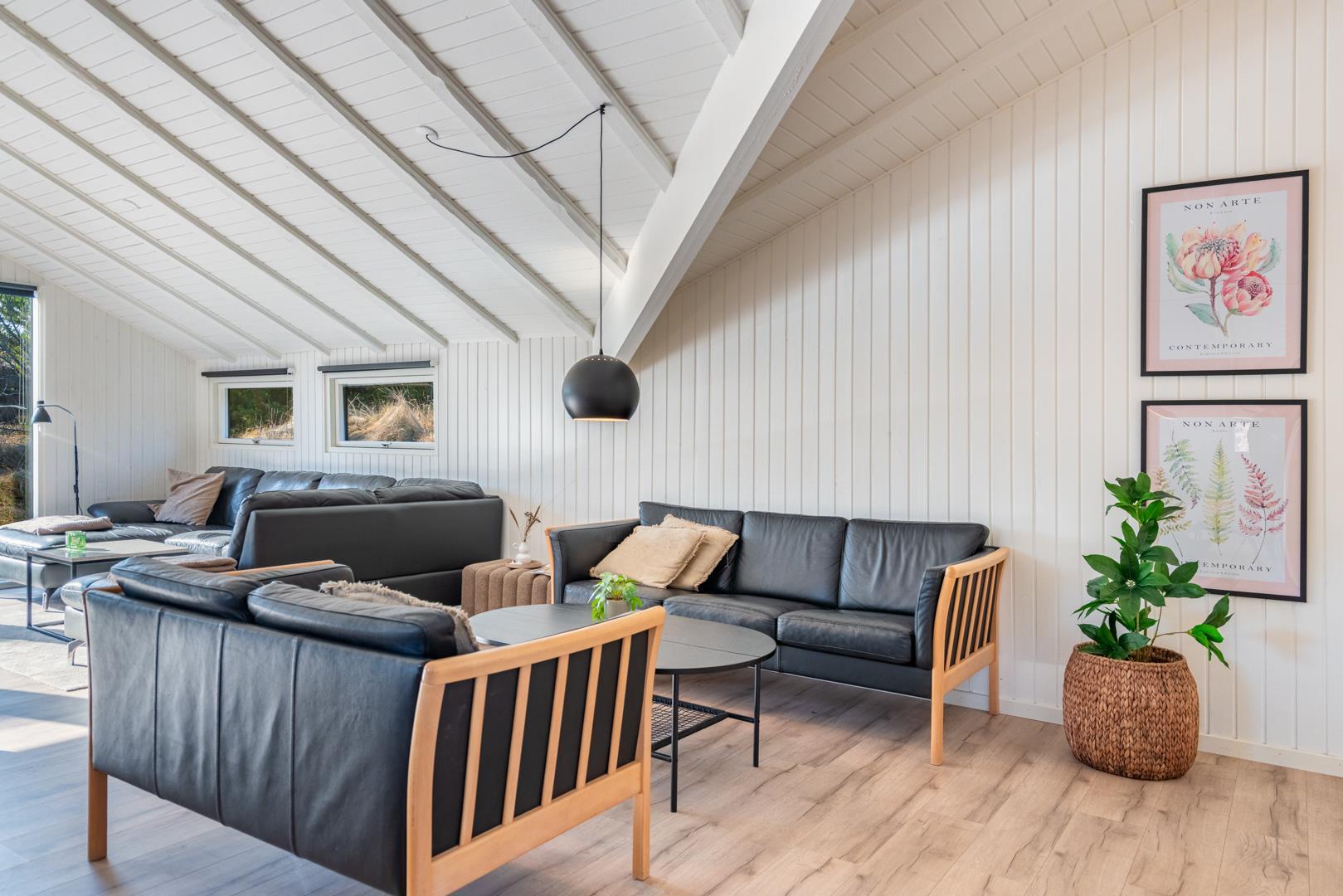 Auf einem schönen hügeligen Naturgrundstück und zurückgelegen von der Straße liegt dieses stilvolle und komplett renovierte Ferienhaus mit Platz für 8 Personen. Es gibt eine große Aktivitätsabteilung mit Billardtisch, Dart, Tischtennis und Playstation 5 mit dazugehörigen Spielen. Eine moderne Einrichtung mit hellen Farben und bequemen Möbeln schafft eine gemütliche Sommerhausatmosphäre, in der Sie im Winter auch vor dem Holzofen entspannen können. Zudem gibt es auch eine energiesparende Wärmepumpe im Haus. Das Haus ist mit 2 guten Badezimmern mit Dusche und 4 Schlafzimmern ausgestattet.