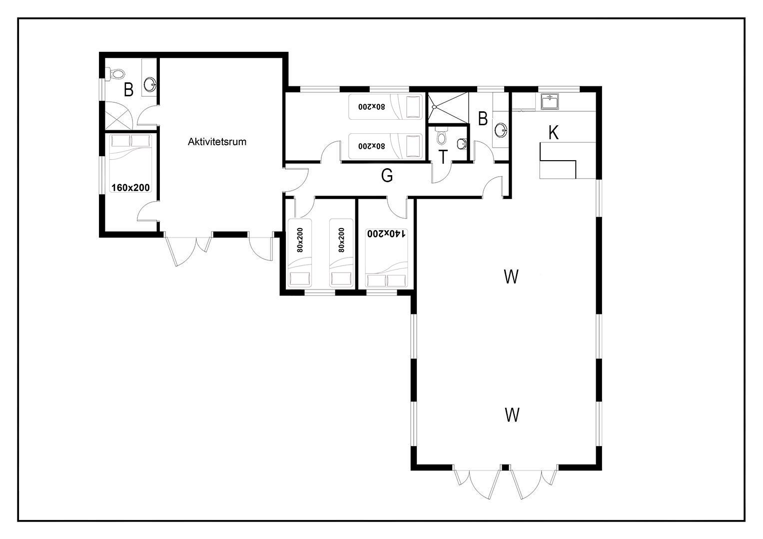 Bettengrösse: 1 Doppelbett 160 x 200 cm + 1 Doppelbett 140 x 200 cm + 4 Einzelbetten 80 x 200 cm