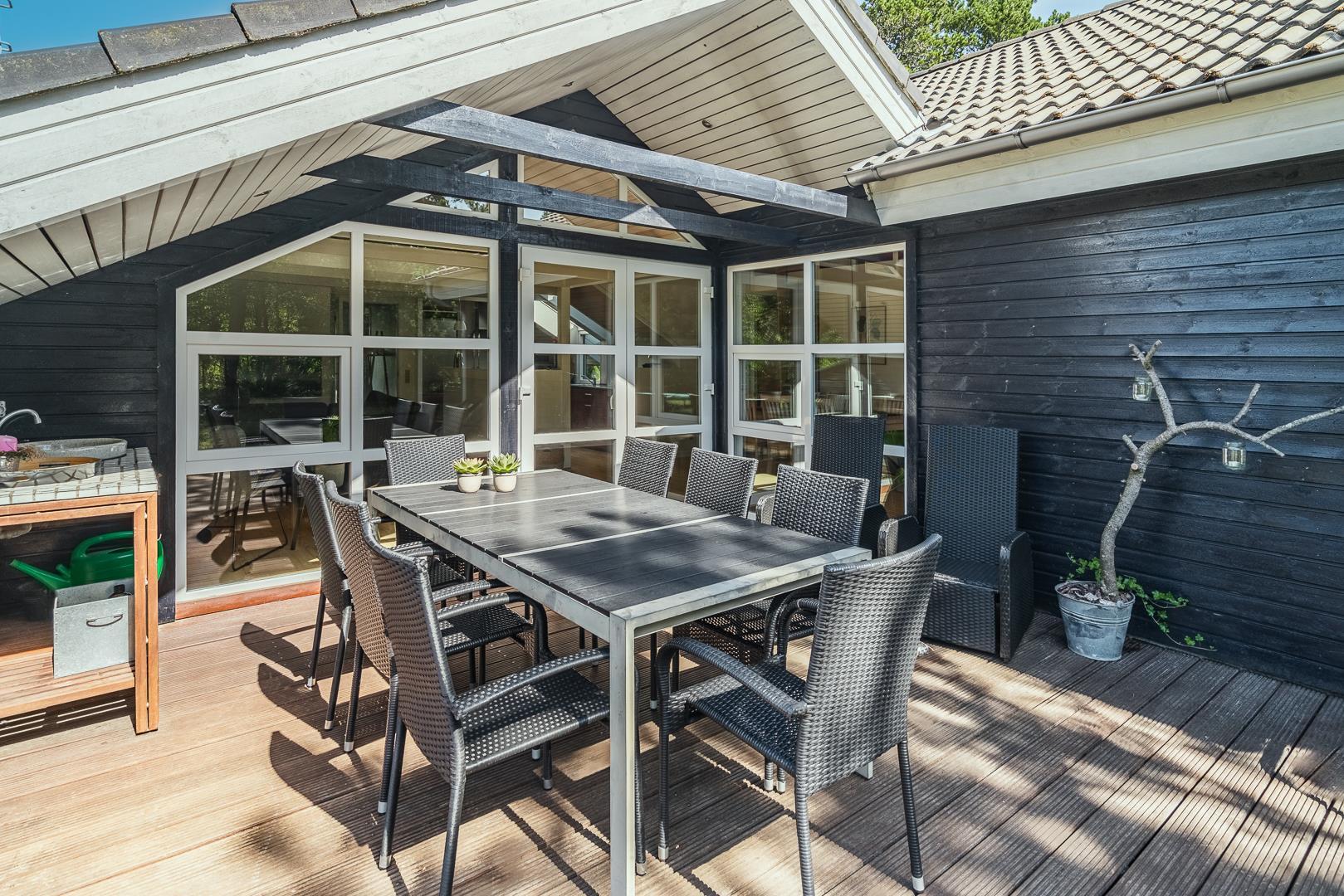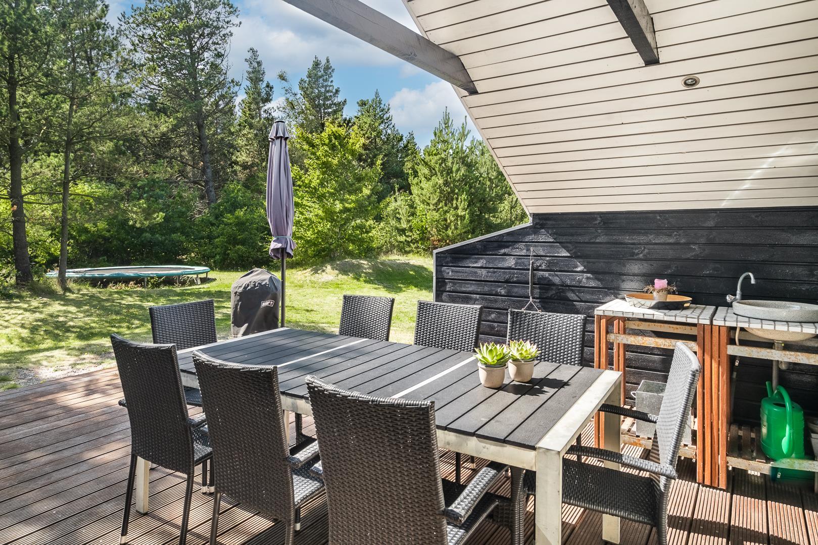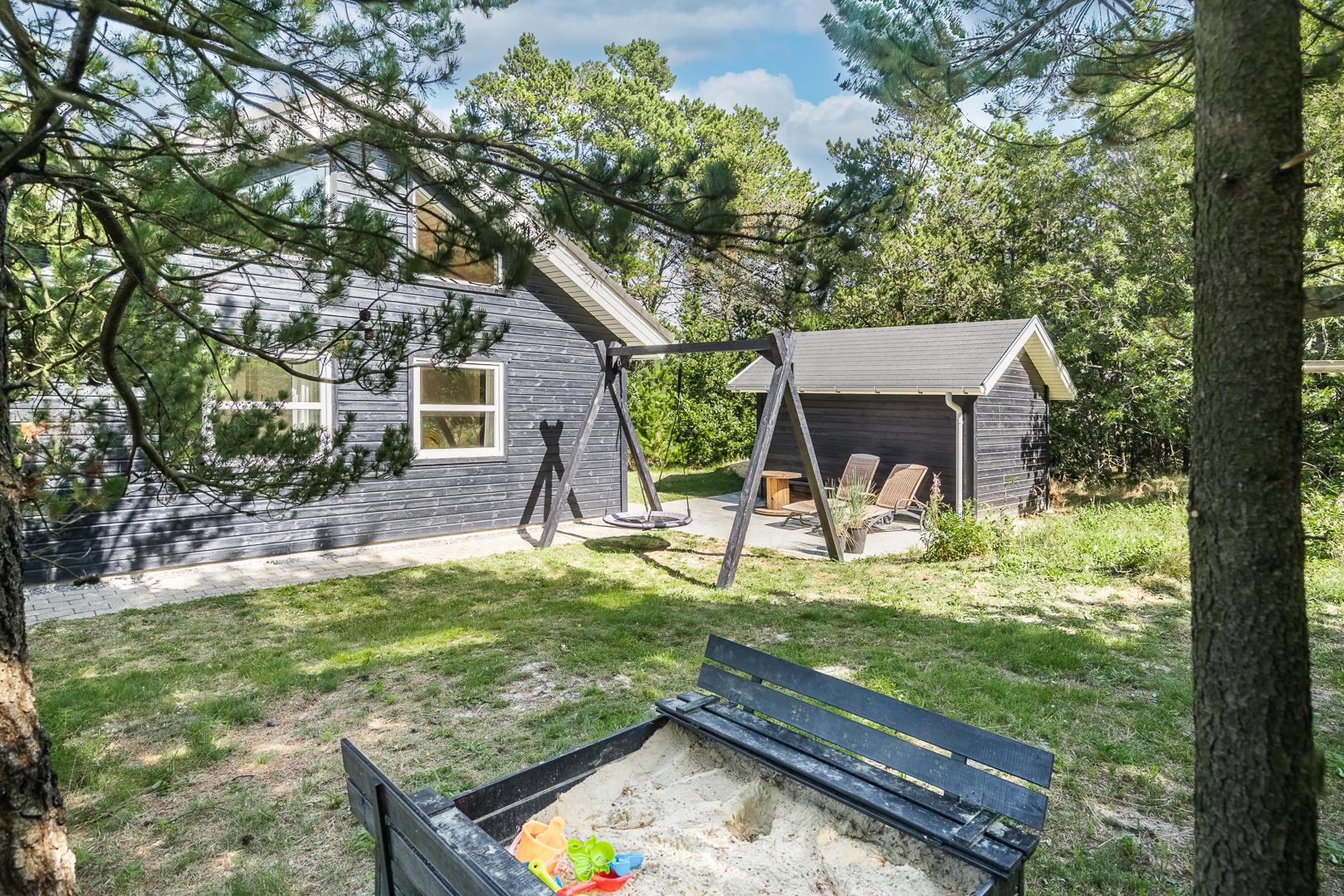 Von den Holzterrassen können Sie weiter in den Garten hinein gehen. Er ist umgeben von wunderschön gewachsenen Pflanzen mit Bäumen und Sträuchern, so dass es viele schöne Ecken gibt, in denen Sie das dänische Sommerwetter ungestört genießen können.