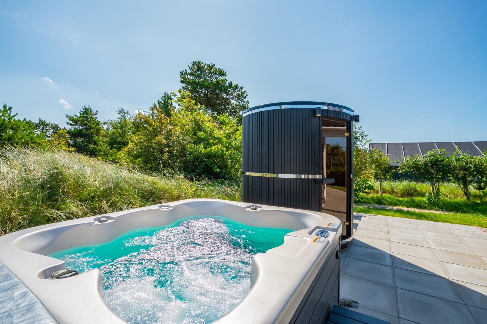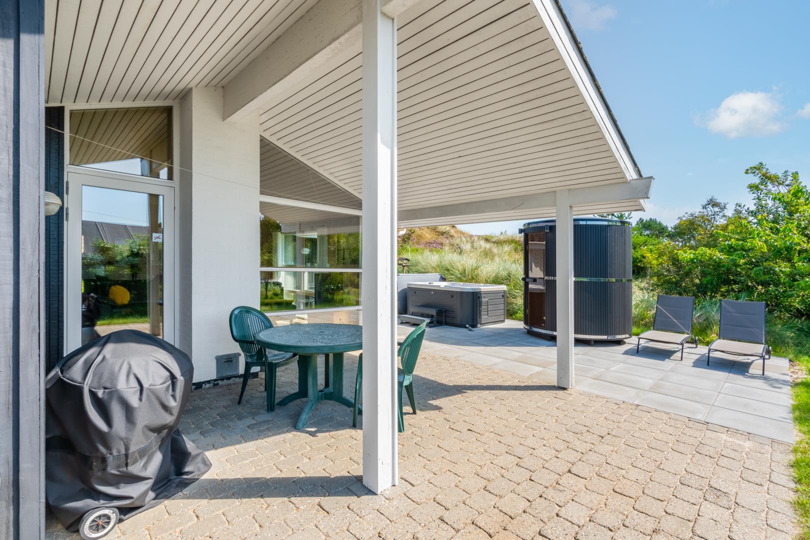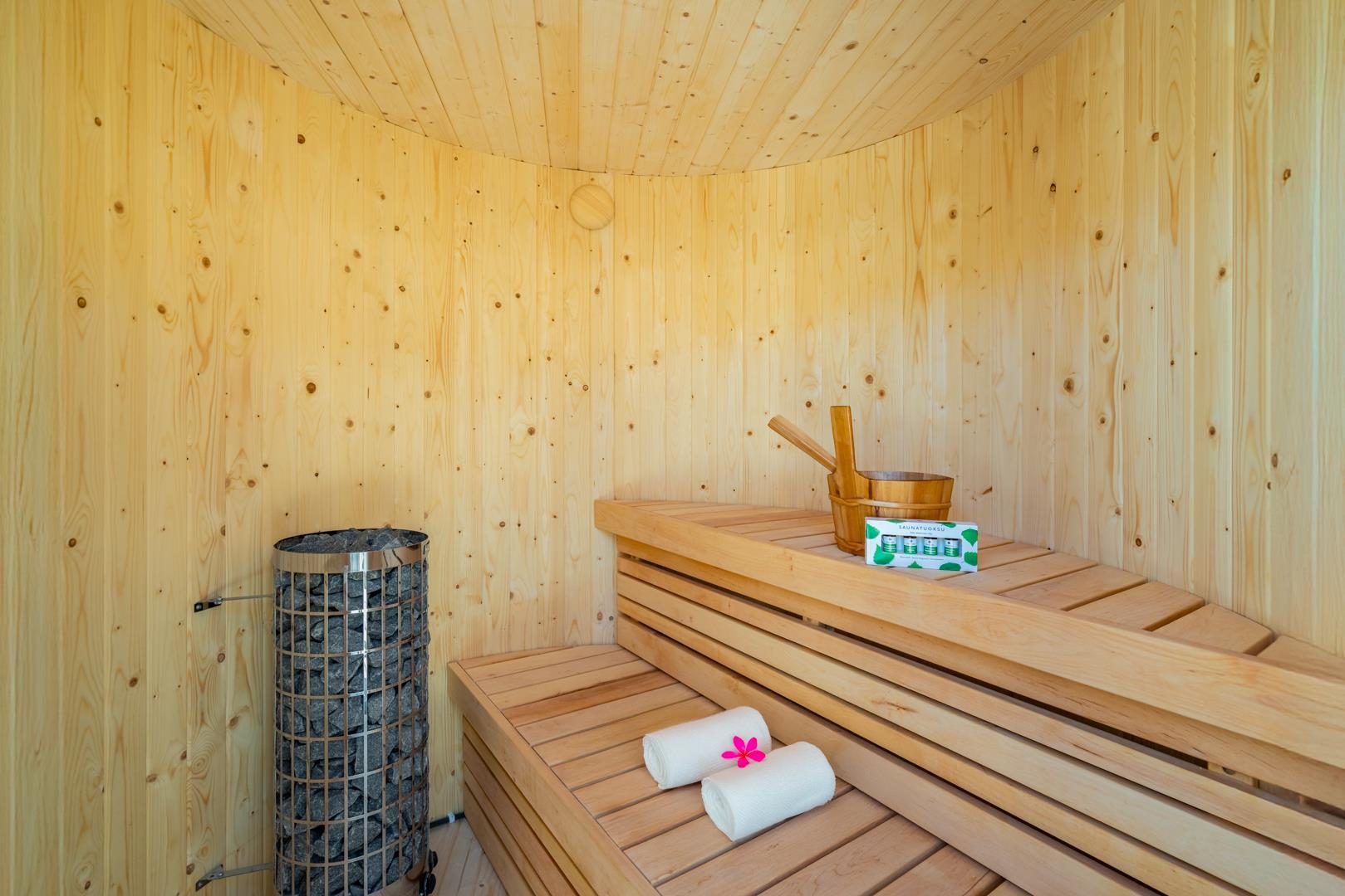 Draußen gibt es mehrere sonnige Terrassen, auf denen man den ganzen Tag Sonne und Windschutz genießen kann – perfekt für den Morgenkaffee, die Mittagsruhe oder das Abendessen unter freiem Himmel. Hier befinden sich auch der Whirlpool und die Sauna des Hauses.