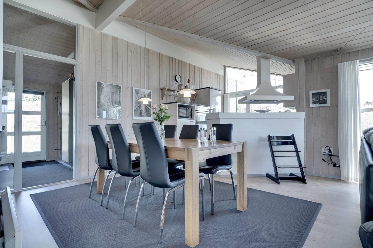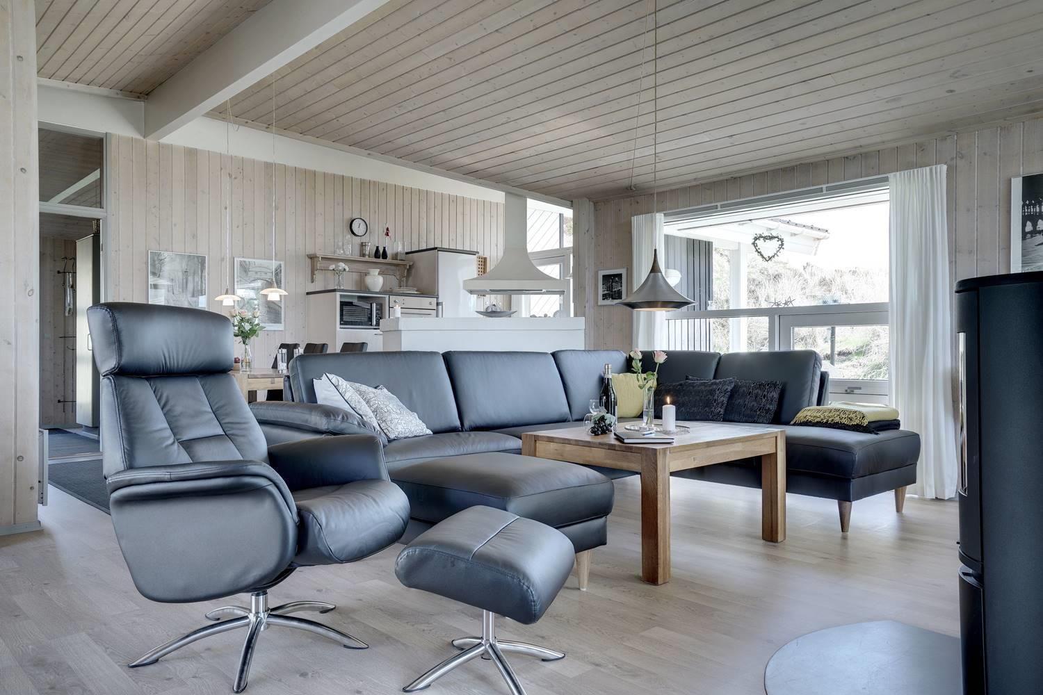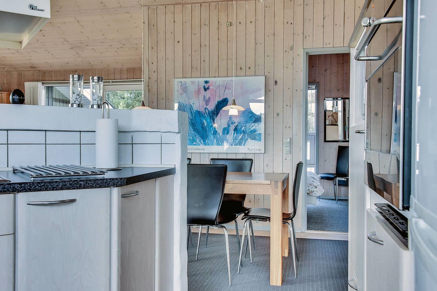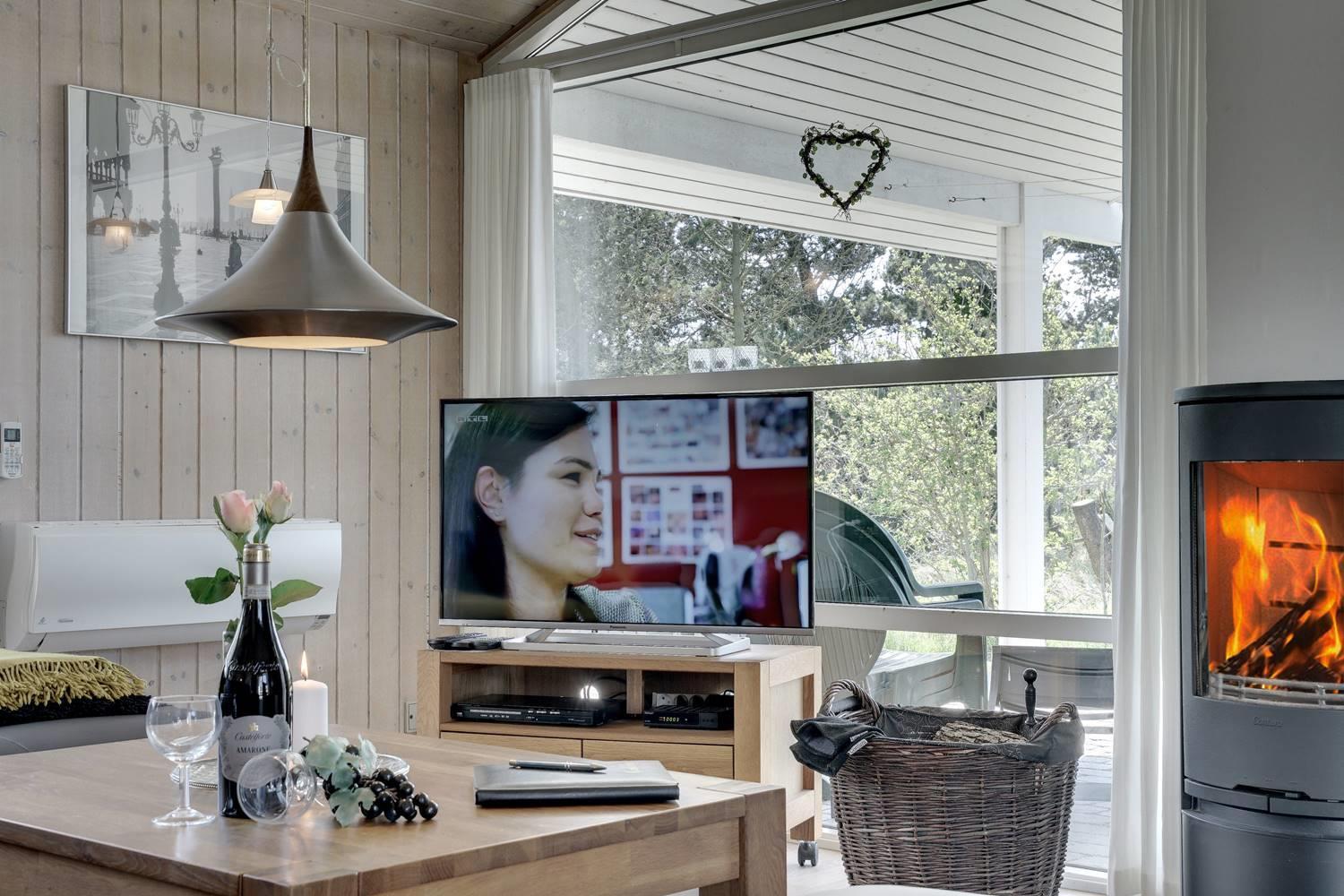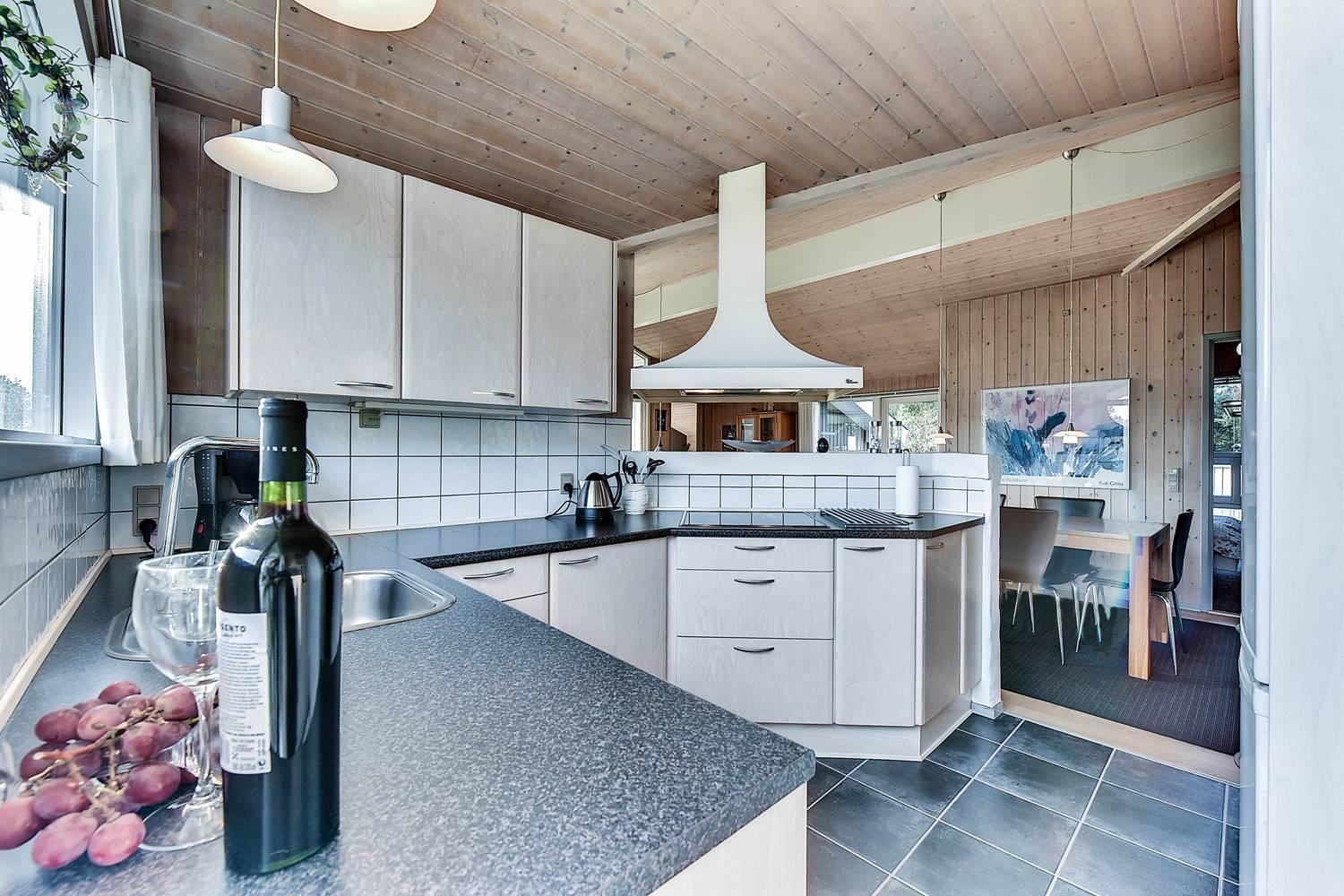 Das Haus ist ausgestattet mit einer hellen, gut eingerichteten Küche, die offen mit dem gemütlichen Wohnzimmer verbunden ist. Ein Kaminofen und eine Wärmepumpe sorgen für Wohlfühlklima das ganze Jahr über. Hohe Decken und große Fensterfronten lassen viel Licht herein und schaffen eine freundliche und luftige Atmosphäre im gesamten Haus.