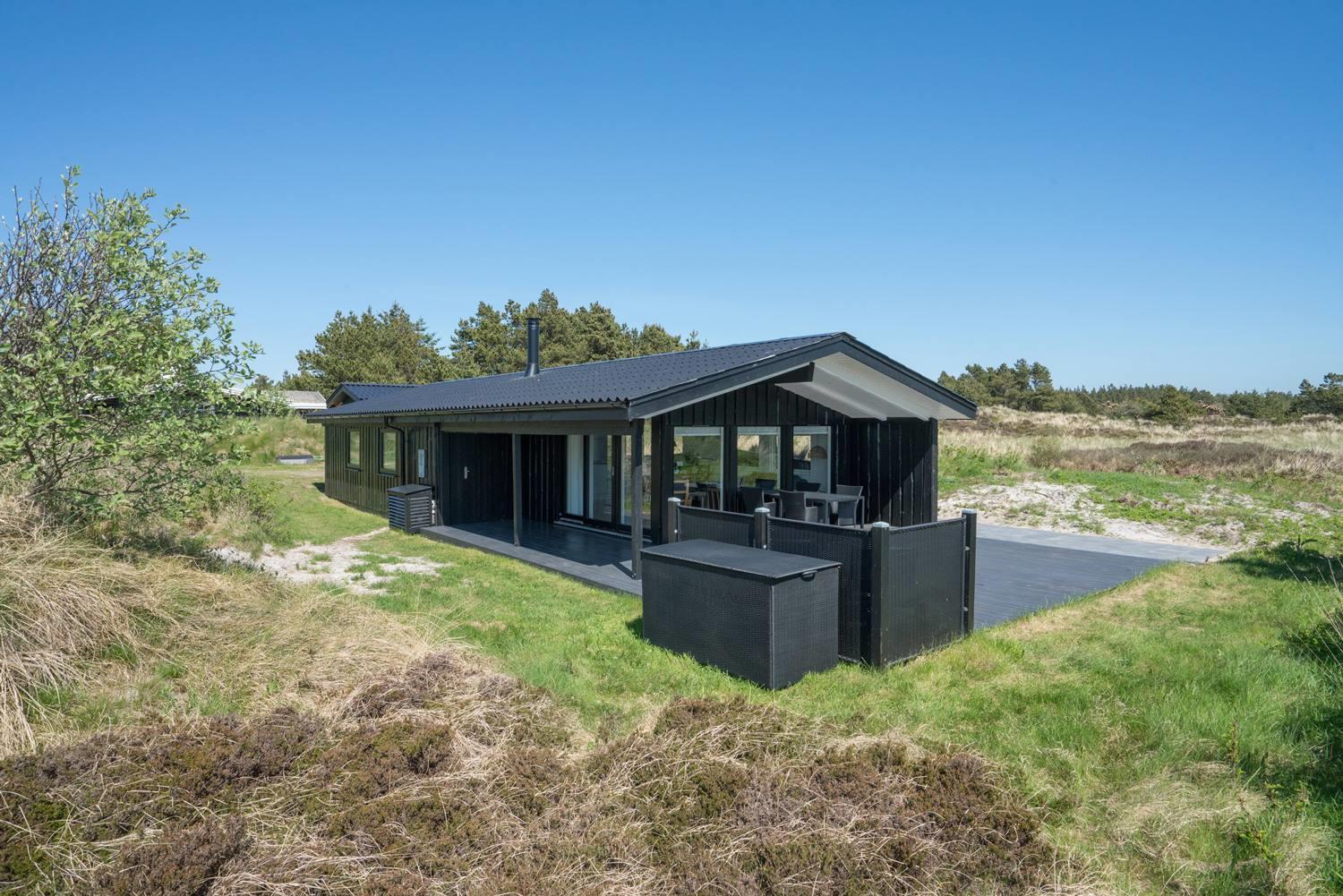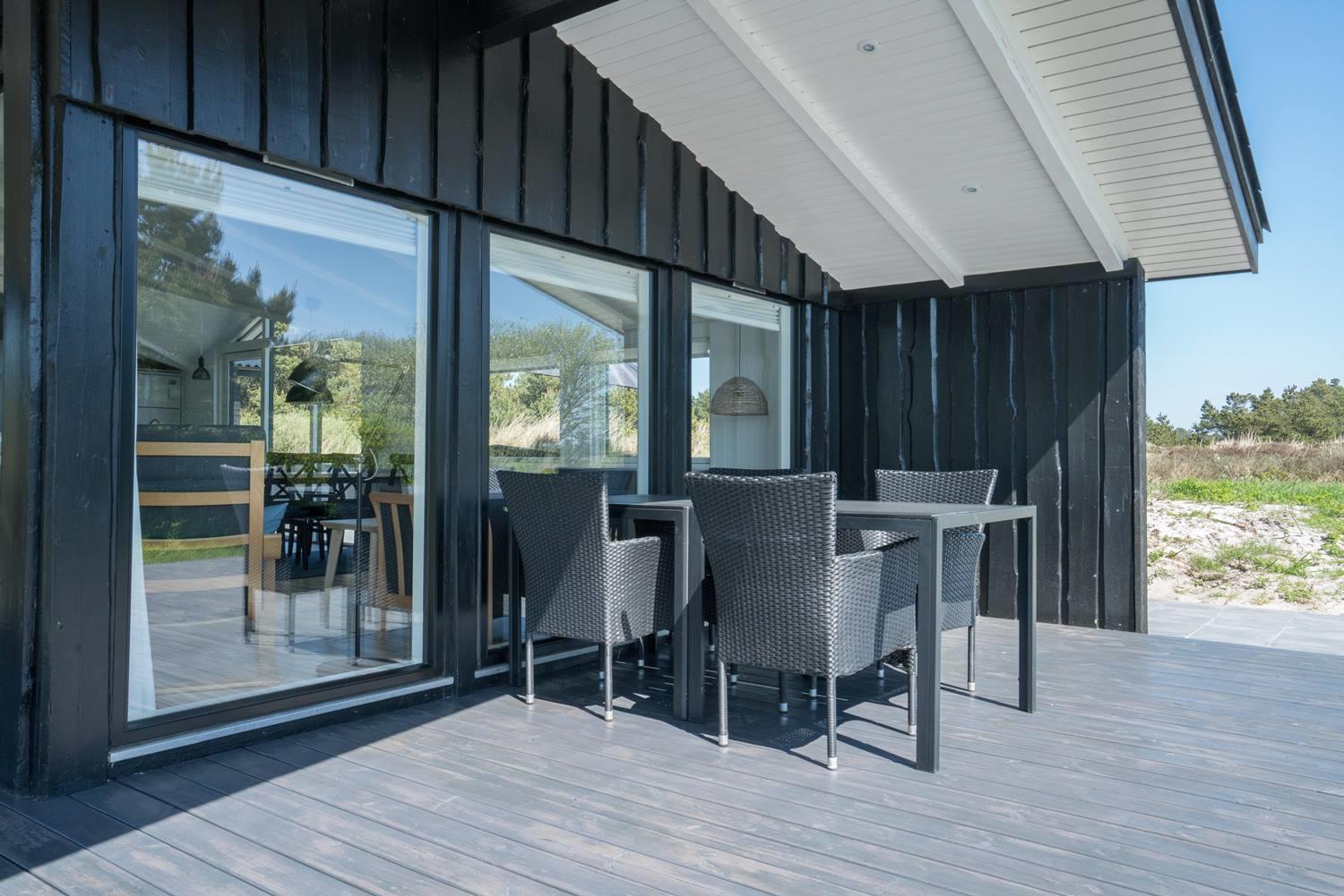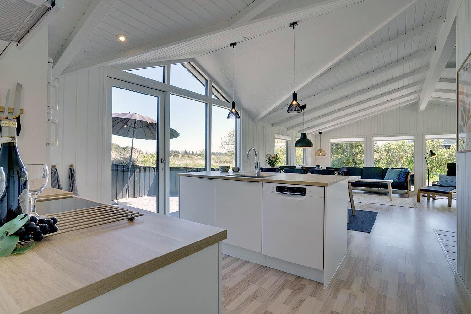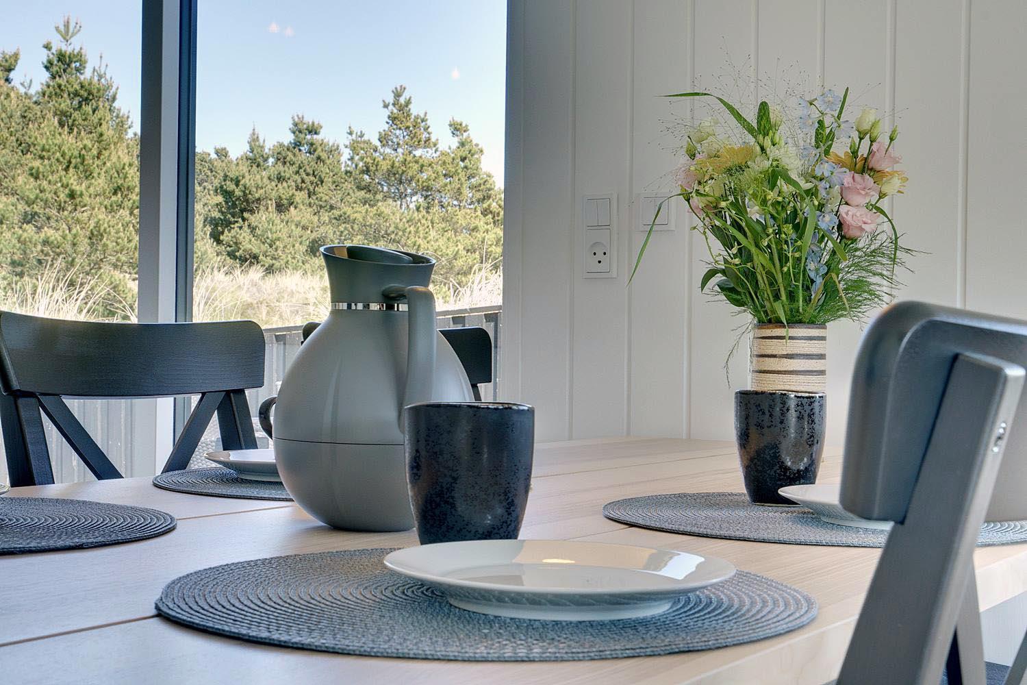 Schönes, helles und freundliches Ferienhaus auf einem tollen, hügeligen Naturgrundstück direkt an einer geschützten Dünen - / Waldumgebung. Von der Terrasse kann man die prachtvolle Aussicht genießen. Schöne Küche die mit der gemütlichen Stube verbunden ist. Ab 2021 schönes neues Badezimmer