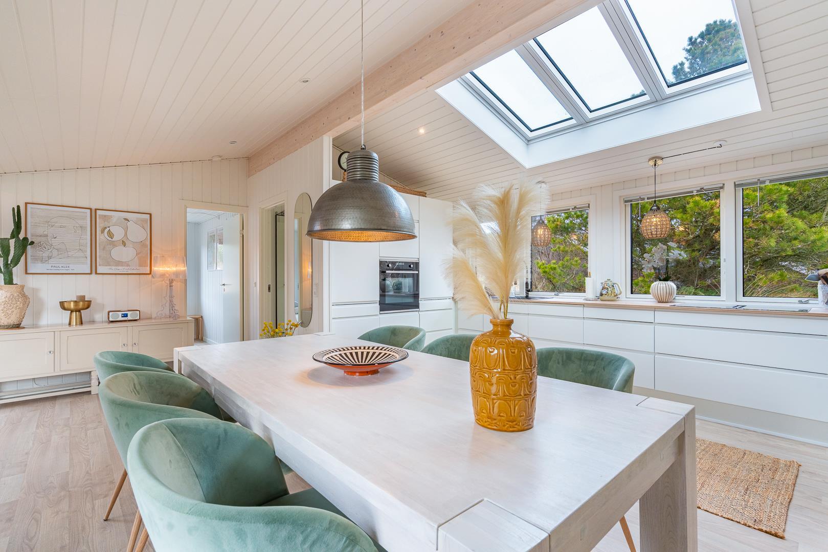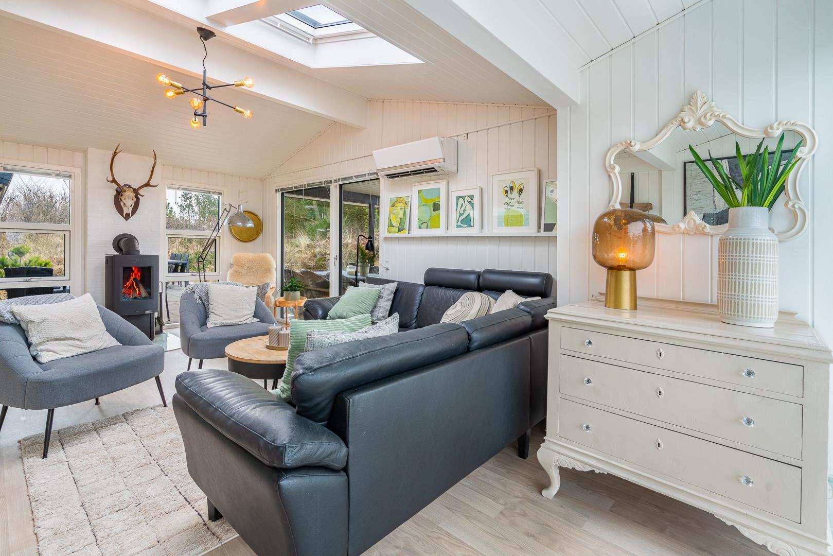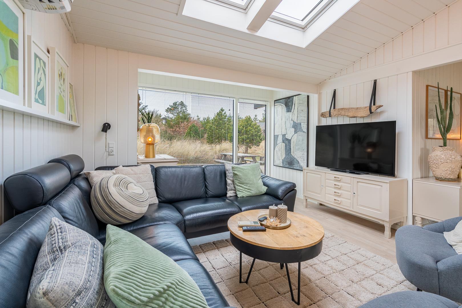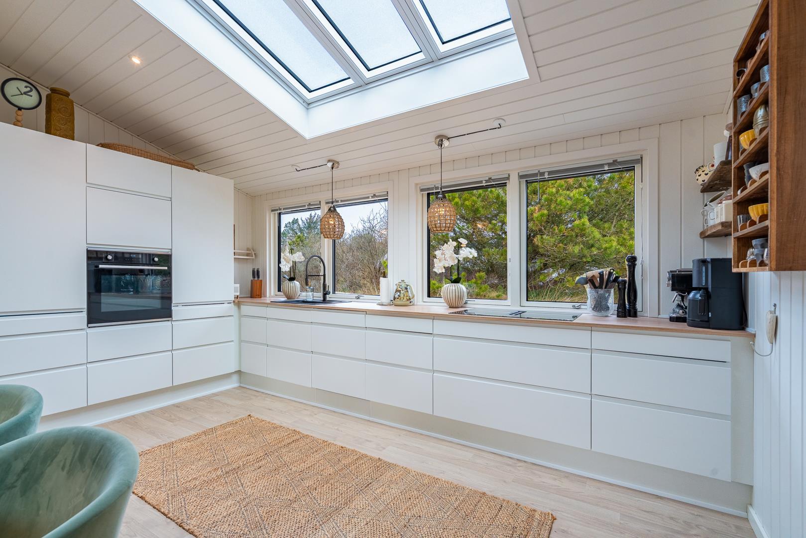 Im Inneren erwartet Sie ein stilvoll kombiniertes Küchen- und Wohnzimmer. Hier finden Sie alles, was Sie für die Zubereitung Ihrer Urlaubsmahlzeiten benötigen, sowie einen Kaminofen, der an kühlen Abenden Wärme und Gemütlichkeit verbreitet. Große Fensterfronten und Dachfenster lassen viel natürliches Licht in den Raum und schaffen eine luftige Atmosphäre. Das Ferienhaus ist mit drei hellen und geräumigen Schlafzimmern sowie einem schönen Badezimmer ausgestattet – ideal für Entspannung nach einem Tag voller Ausflüge.