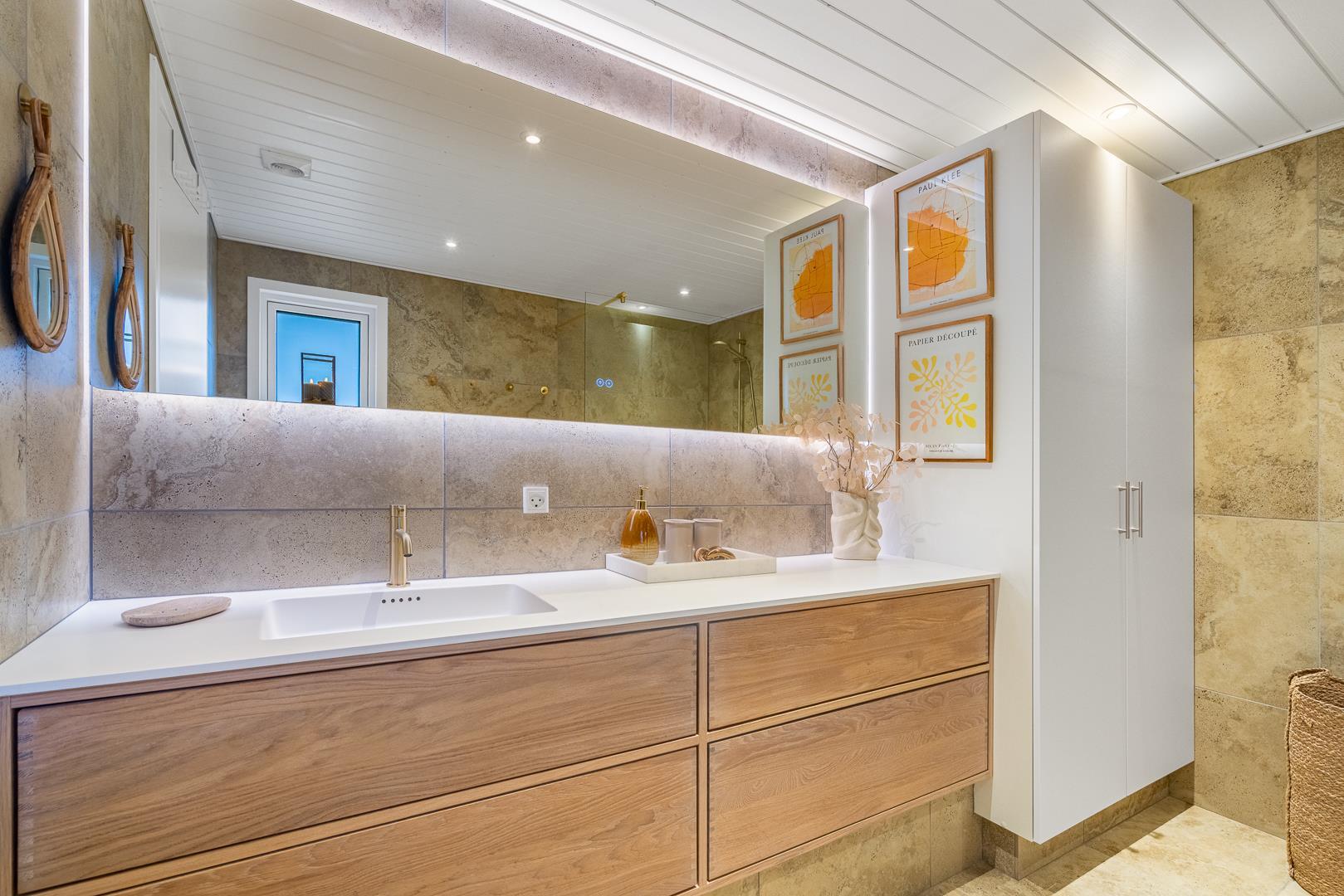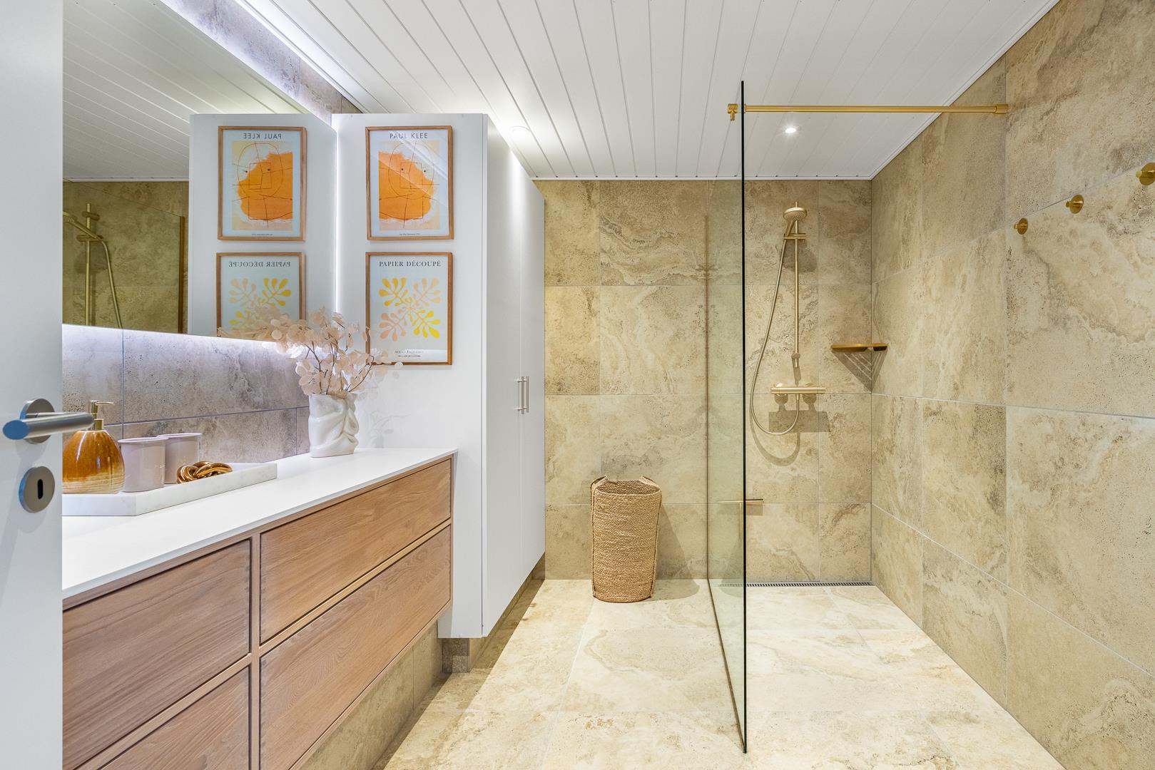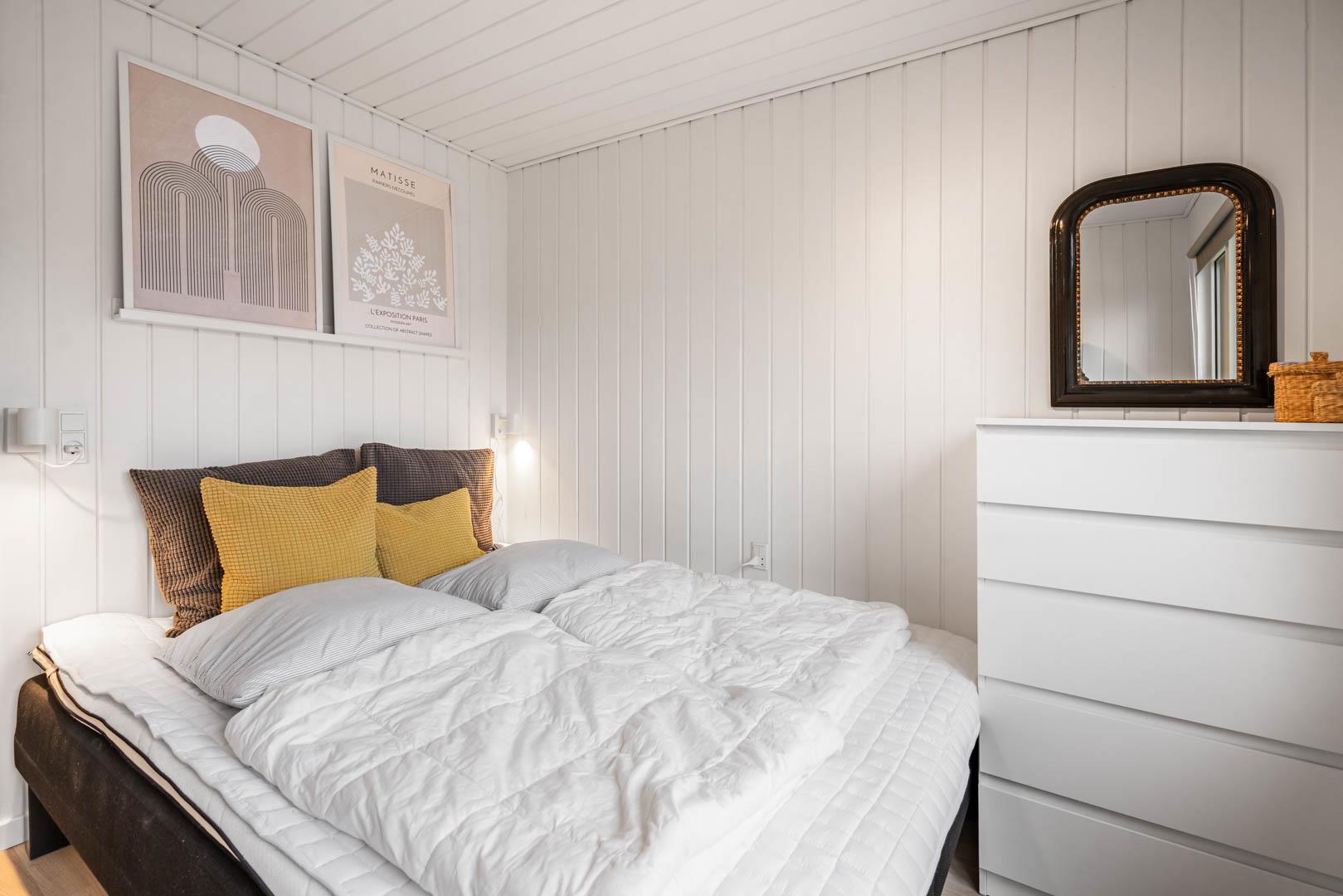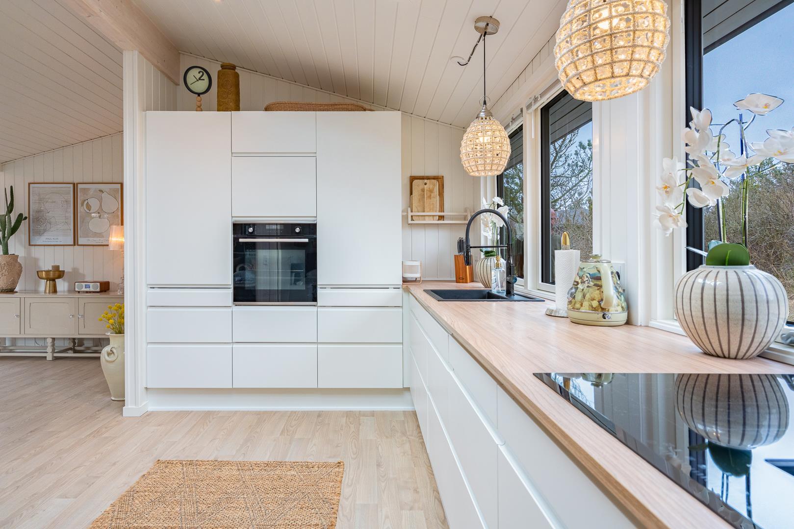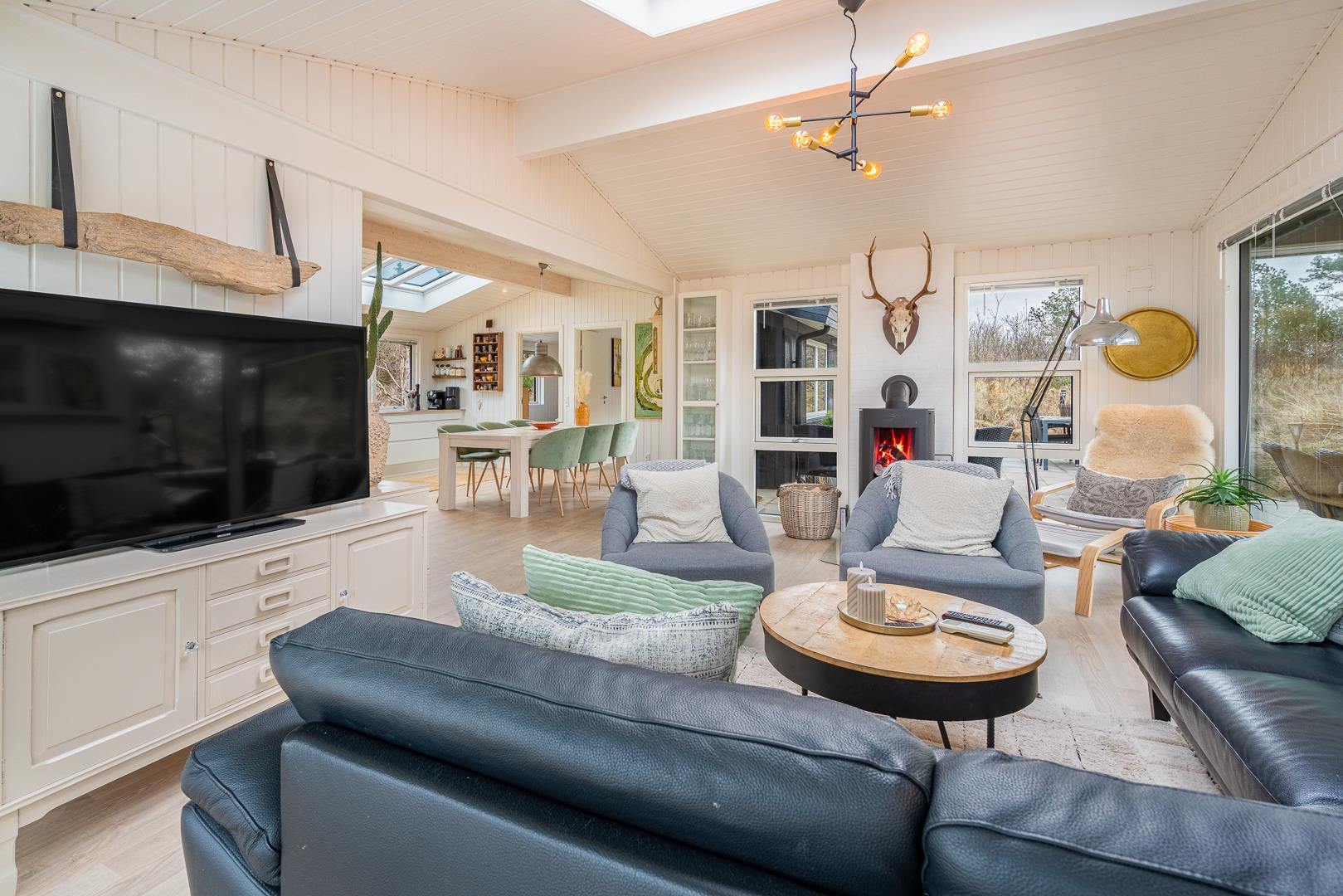 Im Inneren erwartet Sie ein stilvoll kombiniertes Küchen- und Wohnzimmer. Hier finden Sie alles, was Sie für die Zubereitung Ihrer Urlaubsmahlzeiten benötigen, sowie einen Kaminofen, der an kühlen Abenden Wärme und Gemütlichkeit verbreitet. Große Fensterfronten und Dachfenster lassen viel natürliches Licht in den Raum und schaffen eine luftige Atmosphäre. Das Ferienhaus ist mit drei hellen und geräumigen Schlafzimmern sowie einem schönen Badezimmer ausgestattet – ideal für Entspannung nach einem Tag voller Ausflüge.