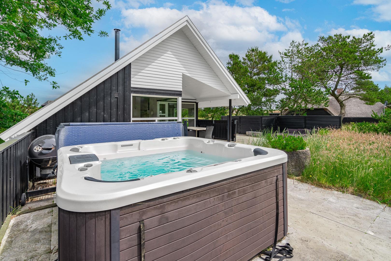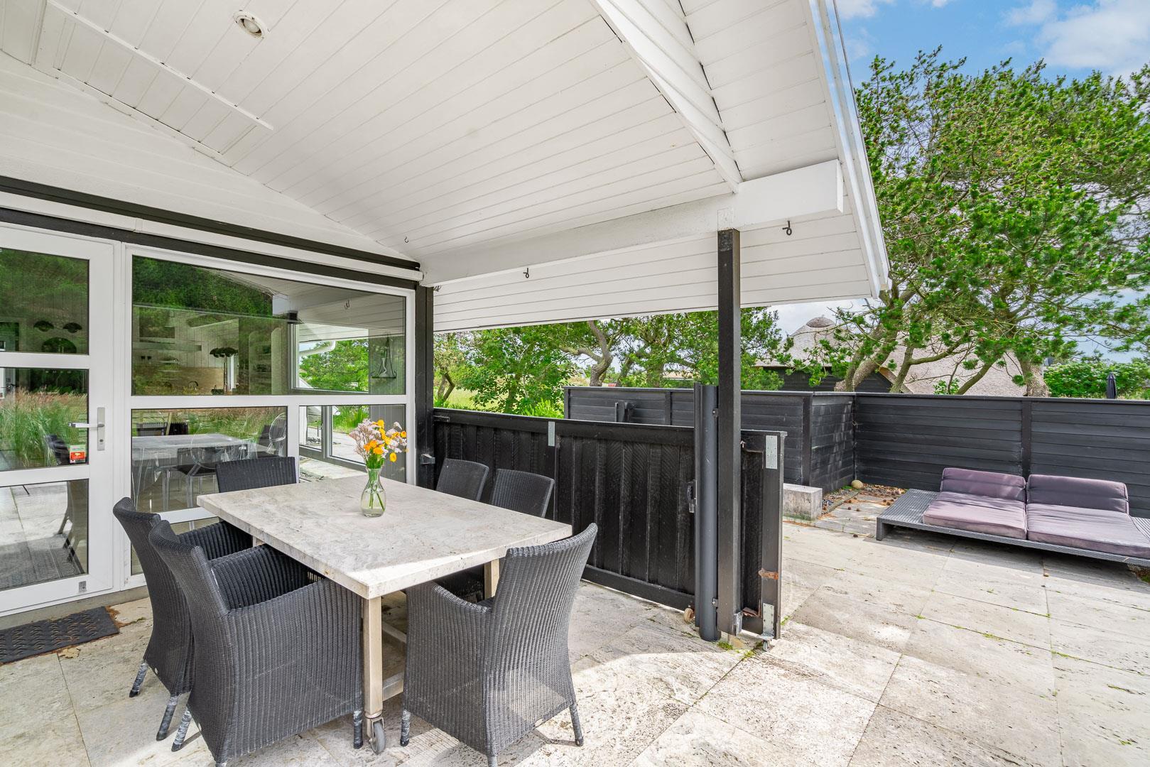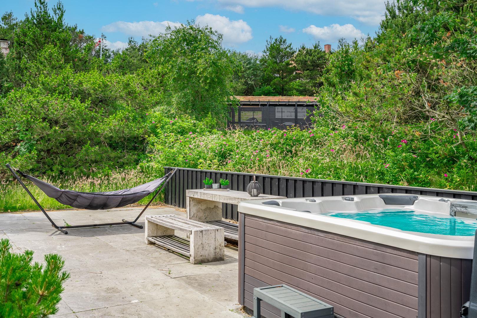 Das Haus liegt auf einem geschützten Dünengrundstück und bietet eine teilweise überdachte Terrasse und einen großzügigen Außenwhirlpool, der die atemberaubende Außenumgebung abrundet.