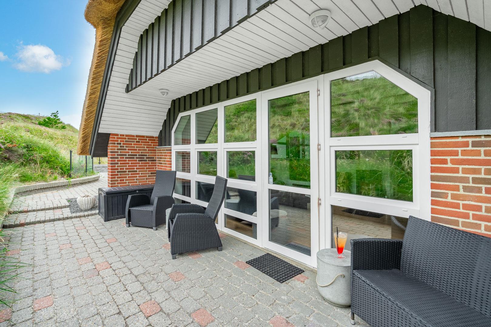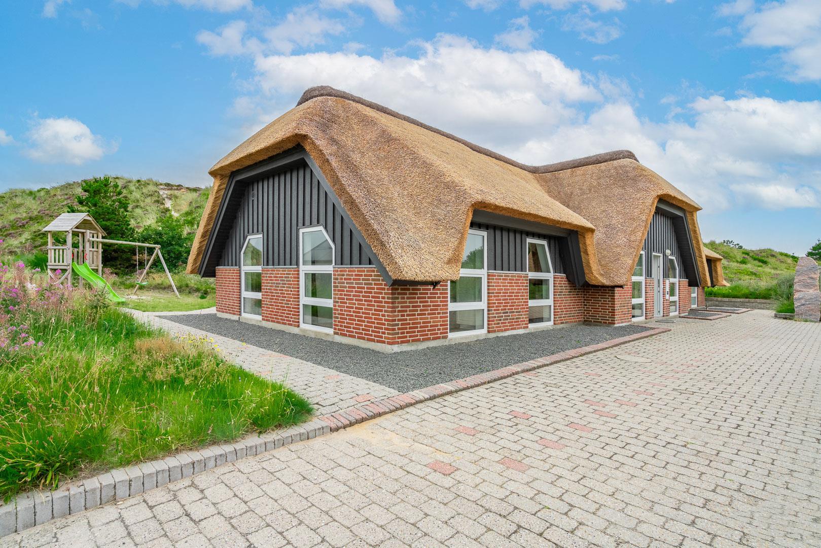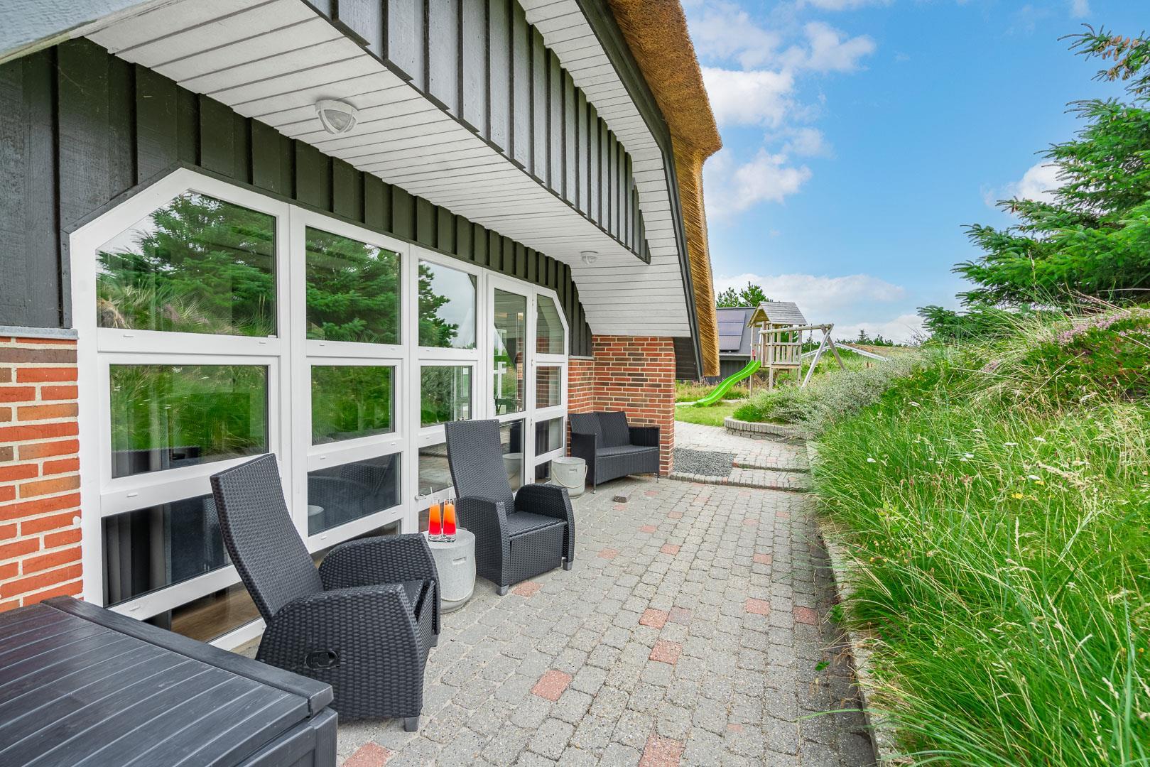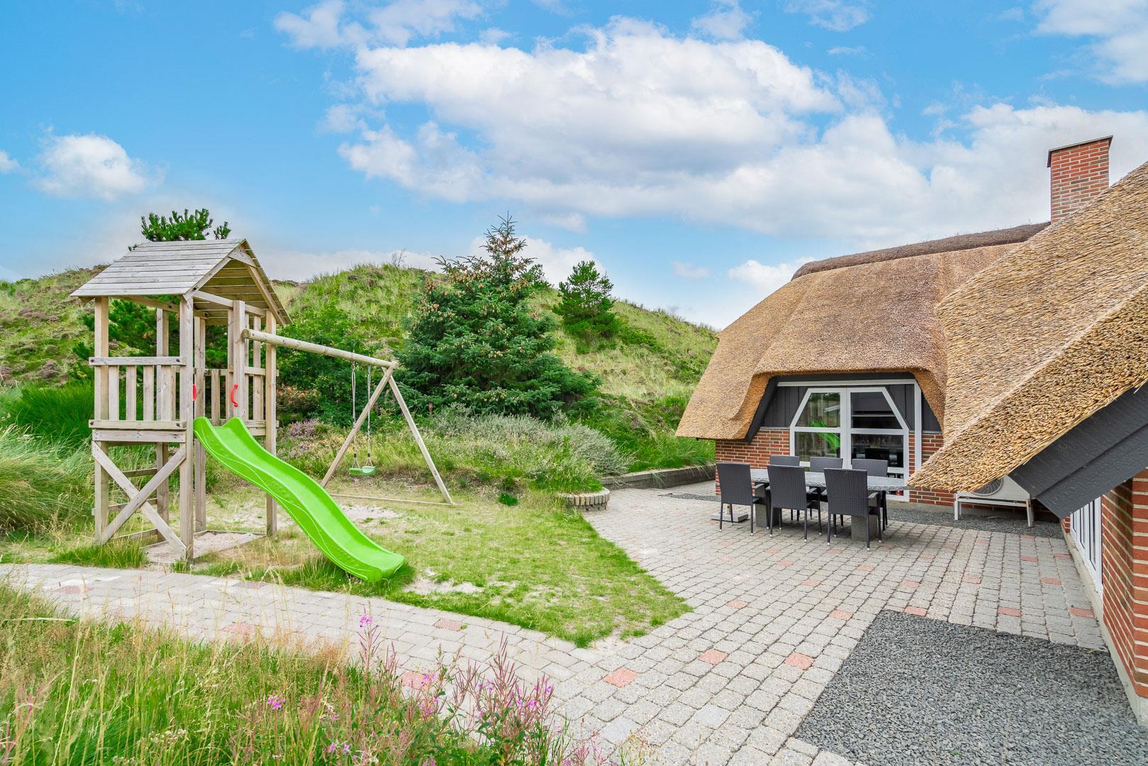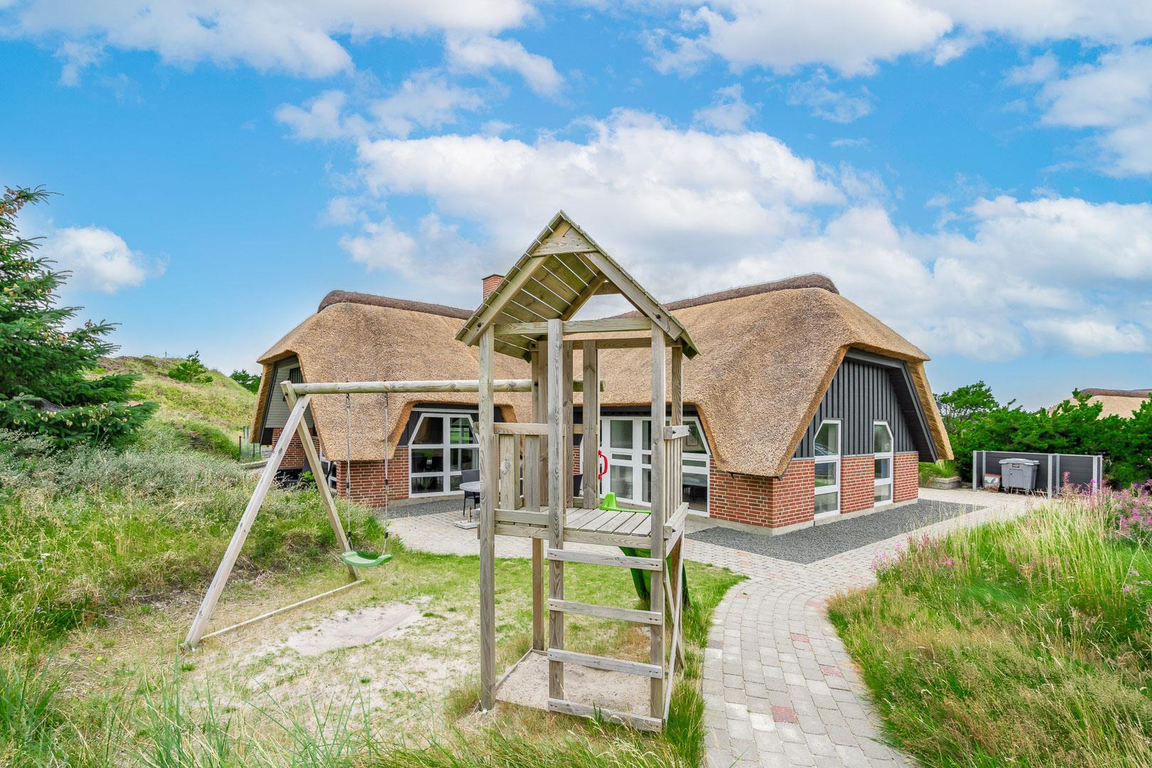 4 schöne Terrassen (davon 2 teilweise überdacht) mit modernen Gartenmöbeln, Sonnenliegen und einem Grill stehen zur Verfügung. Dank des Zauns und der Düne vor dem Haus sind die Terrassen geschützt. Auf die kleinen Gäste warten hier eine Schaukel, ein Spielturm mit Rutsche und ein Sandkasten. Zugang zum neuen Lager für die Aufbewahrung.