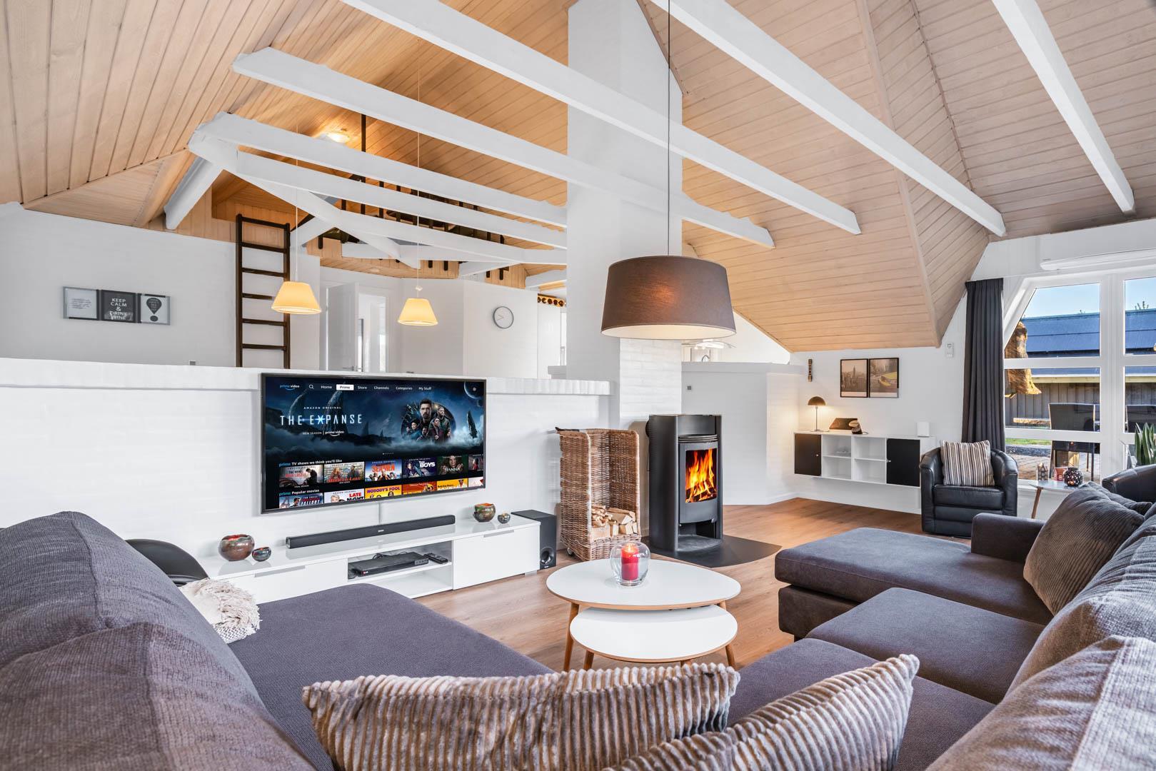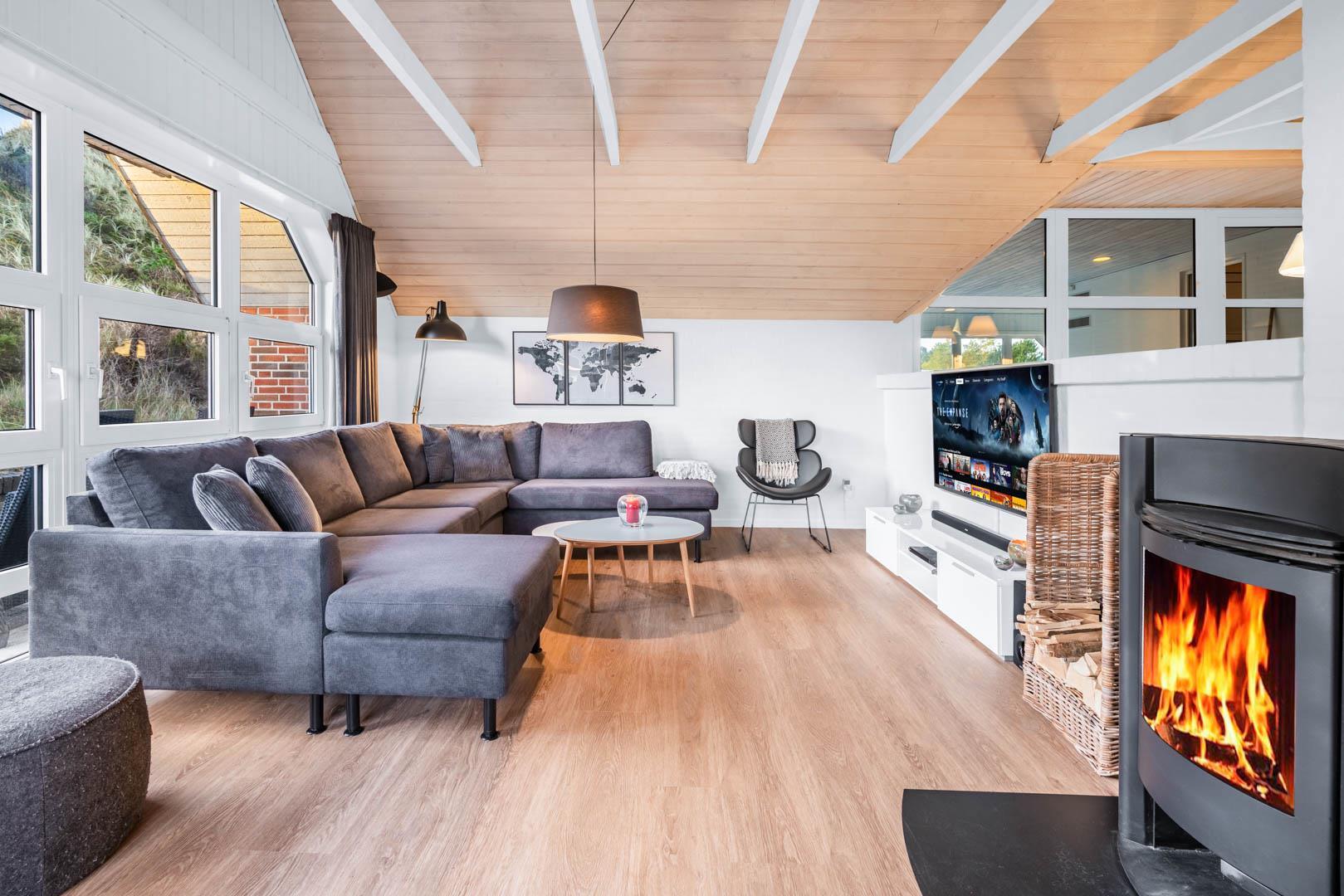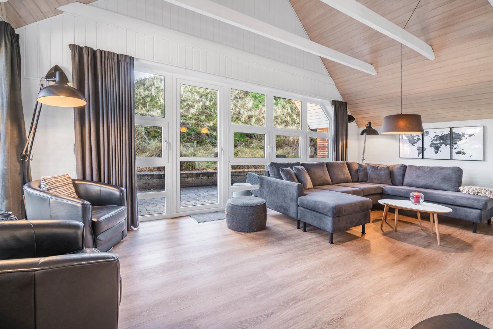Vom Eingang aus betreten Sie das große Wohnzimmer, wo Küche, Esszimmer und Wohnzimmer einen großen Raum bilden. Die Fußböden sind ausgestattet mit Parkett bzw. Fliesen. Wo Fliesenboden ist, gibt es Fußbodenheizung. In der großen, offenen und gut ausgestatteten Küche werden, wie überall im Haus, hochwertige Materialien verwendet. Extra Kühlschrank für Getränke. Das Wohnzimmer ist geschmackvoll eingerichtet, darunter ein Holzofen und ein großer Flachbild-TV und Sonos Bluetooth. Gewölbte Holzdecken und große Fensterpartien mit Blick auf die Dünenlandschaft verleihen dem Wohnzimmer eine zusätzliche Dimension.