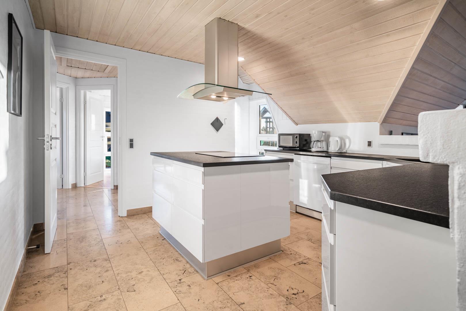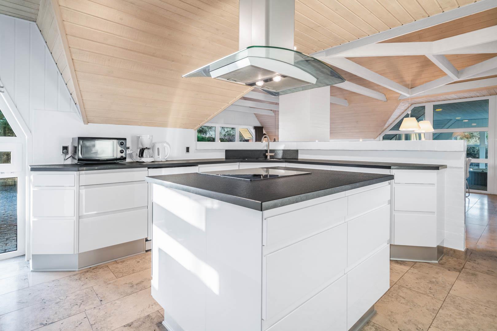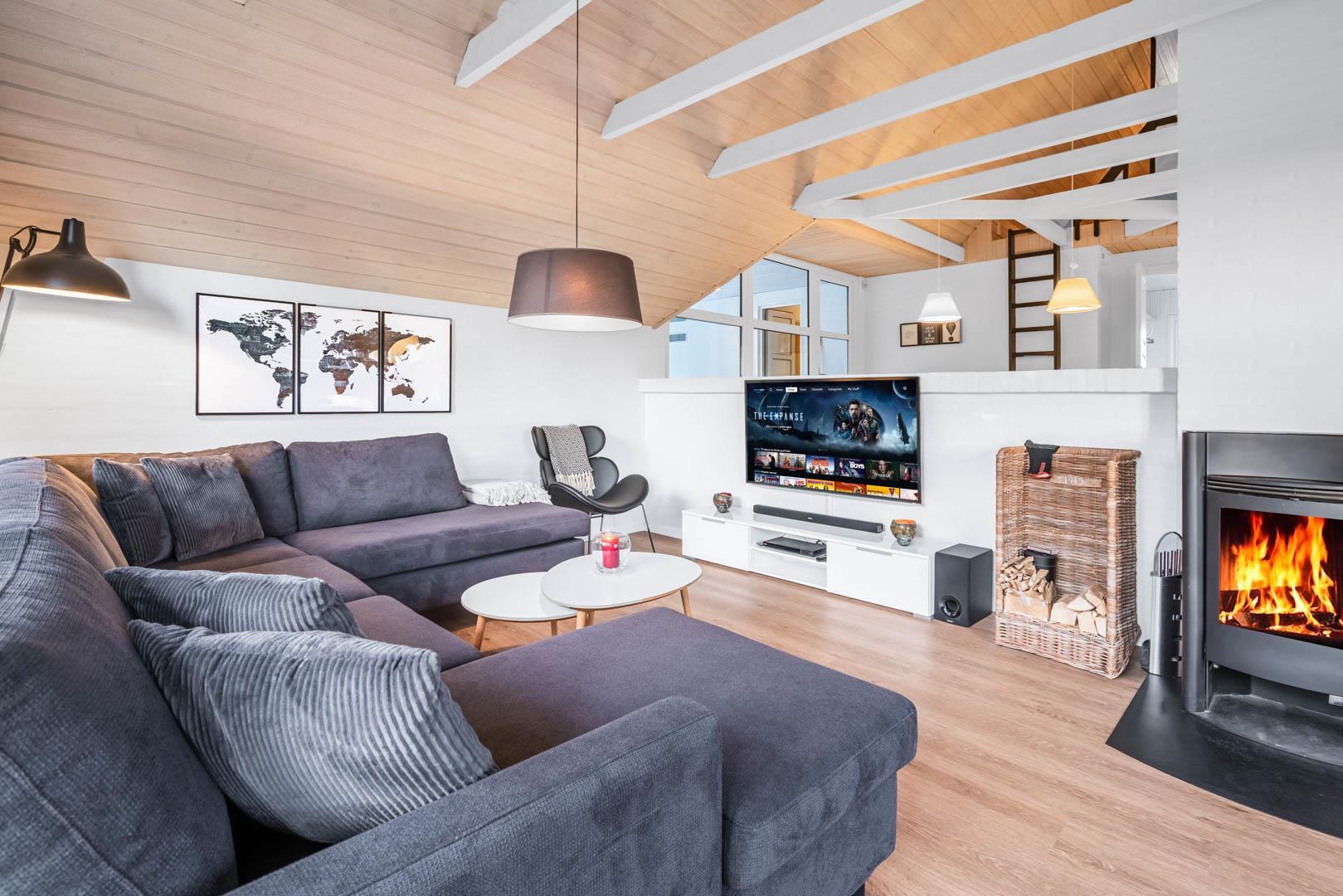 Vom Eingang aus betreten Sie das große Wohnzimmer, wo Küche, Esszimmer und Wohnzimmer einen großen Raum bilden. Die Fußböden sind ausgestattet mit Parkett bzw. Fliesen. Wo Fliesenboden ist, gibt es Fußbodenheizung. In der großen, offenen und gut ausgestatteten Küche werden, wie überall im Haus, hochwertige Materialien verwendet. Extra Kühlschrank für Getränke. Das Wohnzimmer ist geschmackvoll eingerichtet, darunter ein Holzofen und ein großer Flachbild-TV und Sonos Bluetooth. Gewölbte Holzdecken und große Fensterpartien mit Blick auf die Dünenlandschaft verleihen dem Wohnzimmer eine zusätzliche Dimension.
