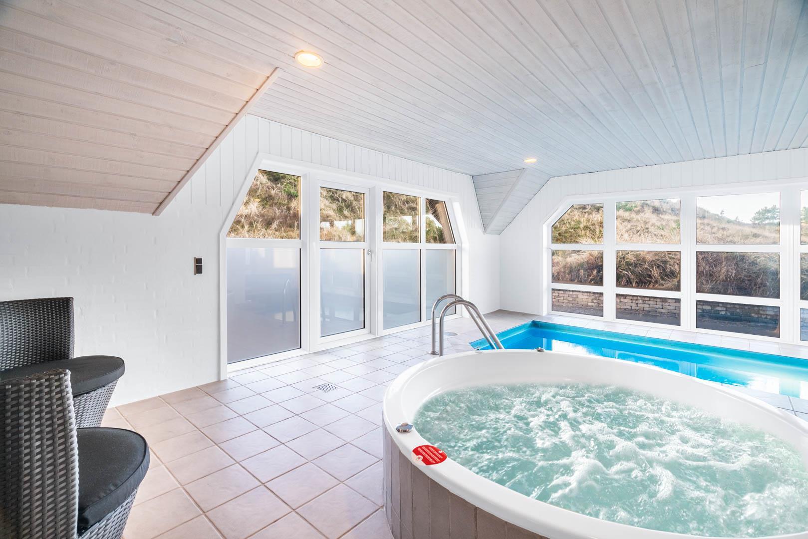 Es gibt 2 komplett in Marmor eingerichtete Badezimmer. Der große Poolraum mit Sauna und Spa lädt zum Entspannen ein. Vom Spa aus können Sie beim Entspannen den Blick auf die Dünenlandschaft genießen. Kurz gesagt: Hier sind alle Zutaten für einen guten Urlaub vorhaden.