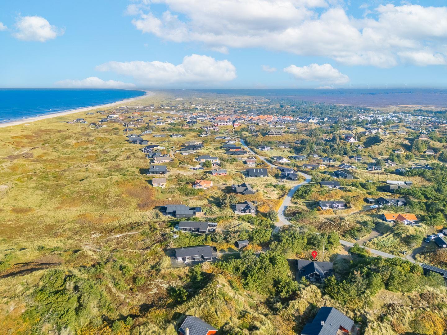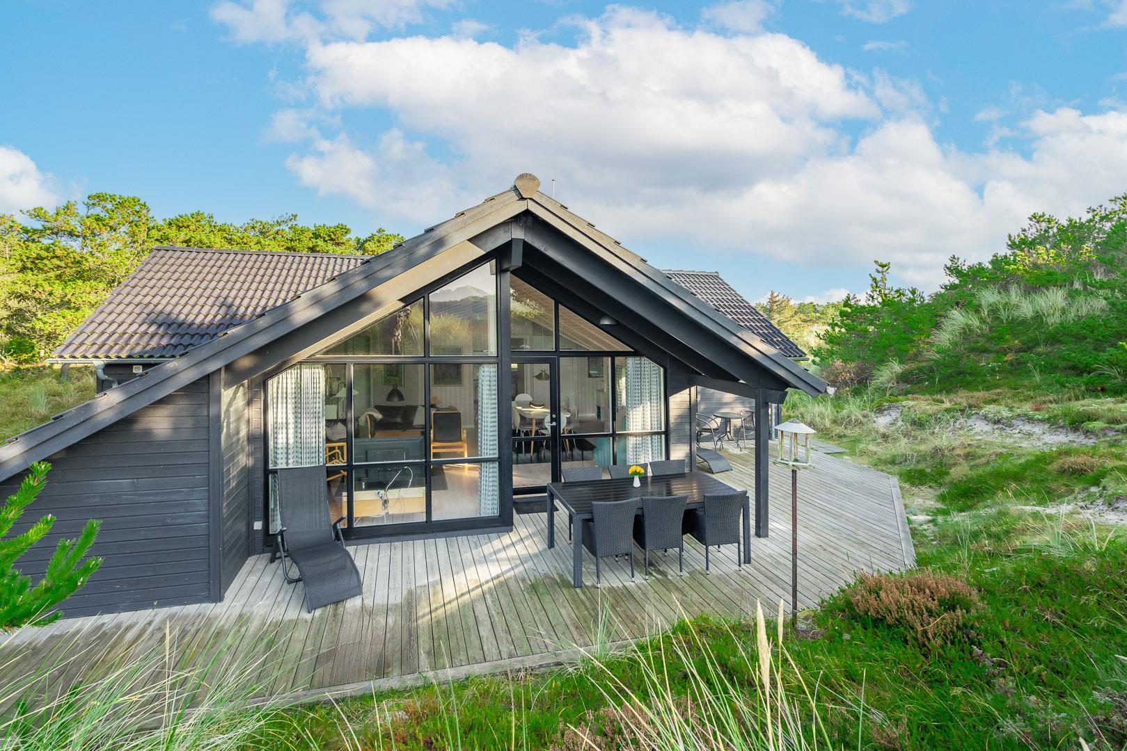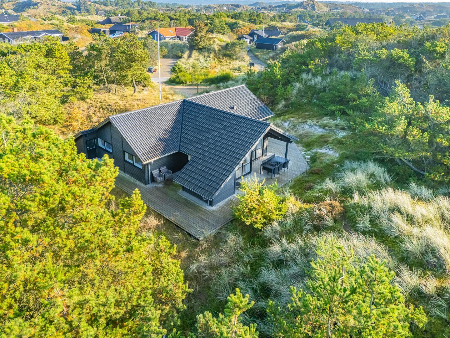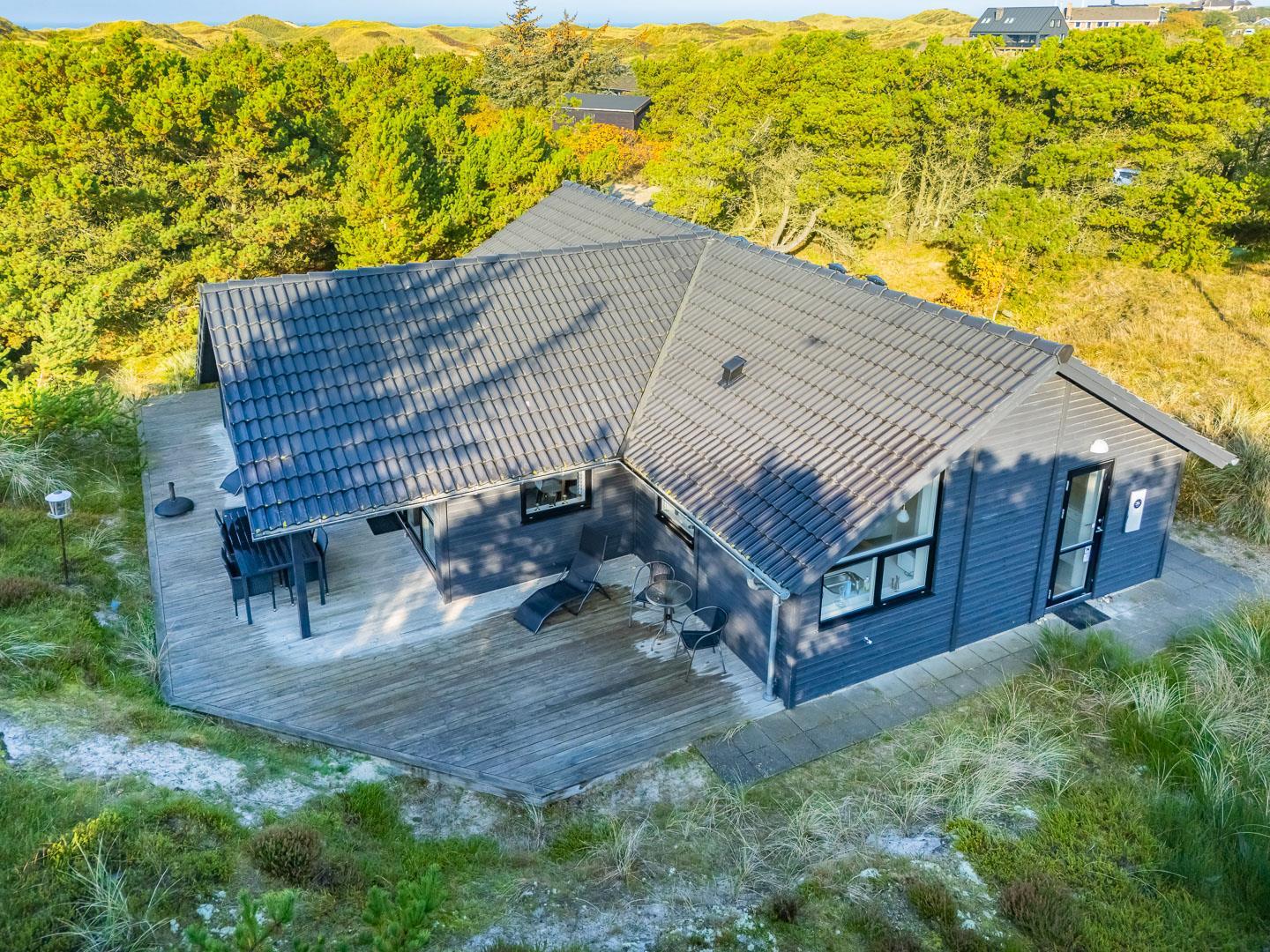Ferienhaus gelegen auf einem fantastischen und ungestörten Dünengrundstück ganz nah an der geschützten Dünenlandschaft und an der Nordsee. Im Eingang vom Haus gibt es eine Waschmaschine und einen Trockner. Großes und tolles Badezimmer mit Badewanne und Sauna. Extra Badezimmer mit Dusche. Große schöne Küche, die in offener Verbindung mit der gemütlich eingerichteten Stube liegt. Es gibt auch einen Alkoven in der Stube. Mehrere schöne Terrassen umgeben das Haus, von wo es Möglichkeiten gibt für Sonne und Windschutz. Gute Schlafzimmer mit reichlich Schrankplatz. Ein fantastisches Haus, wo der Rahmen für einen richtig schönen Urlaub geschaffen ist - das ganze Jahr über.