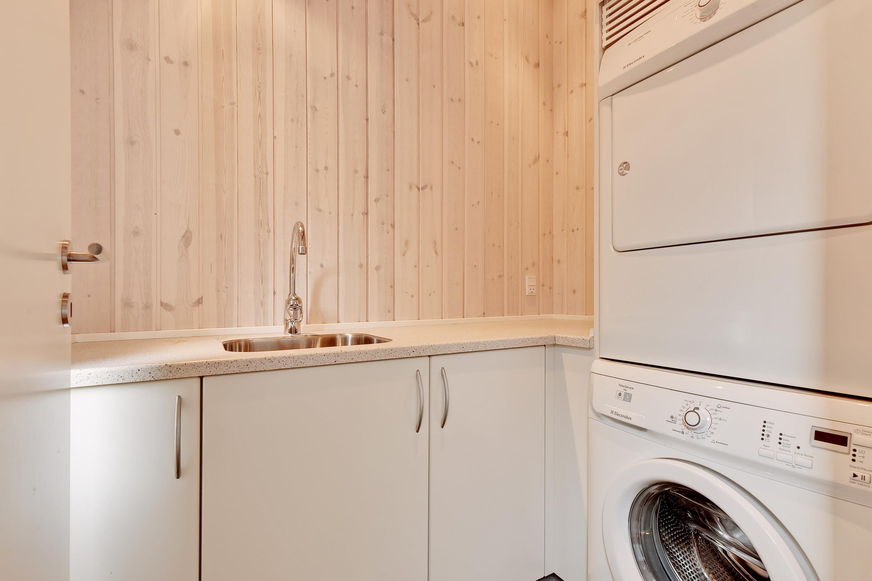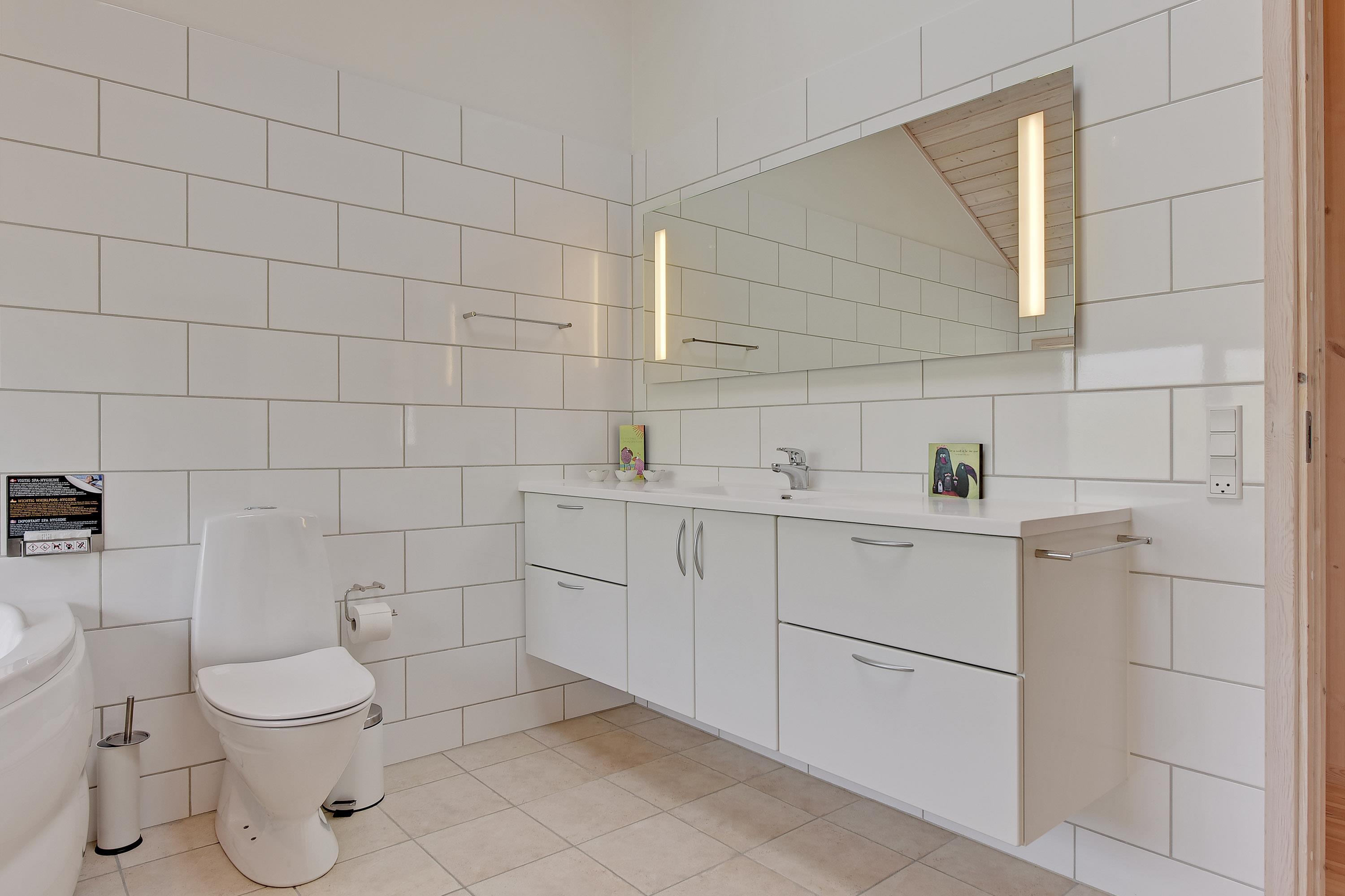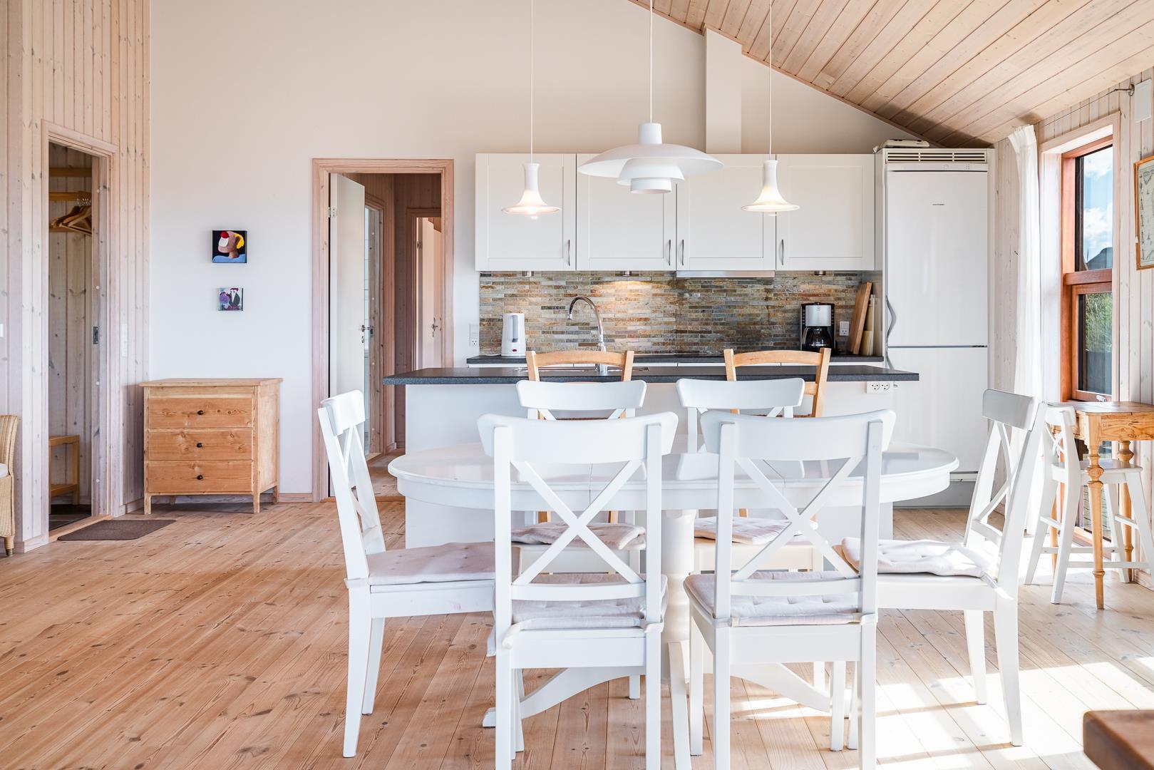 Helle Küche mit Spülmaschine und extra Gefrierschrank (ca.50L). Das Haus ist aufgeteilt in 2 Abschnitte mit 2 Schlafzimmern und Badezimmer in jedem Abschnitt. Das eine Badezimmer hat Whirlpool und Sauna. Beide Badezimmer mit Fußbodenheizung. Es gibt TV sowohl in der Stube, als auch in einem Schlafzimmer. Waschraum, mit Zugang vom Eingang, hat Waschmaschine und Trockner.