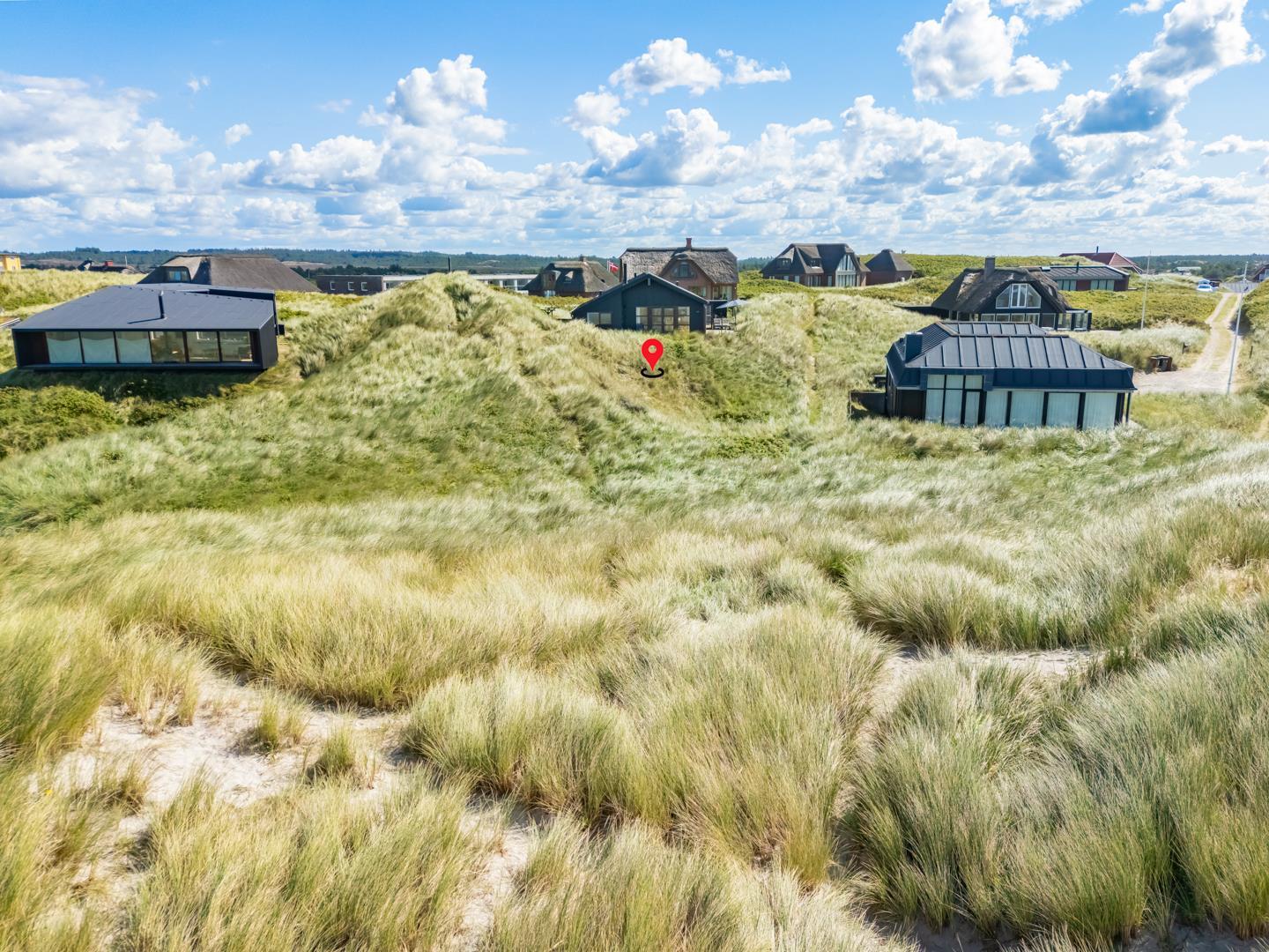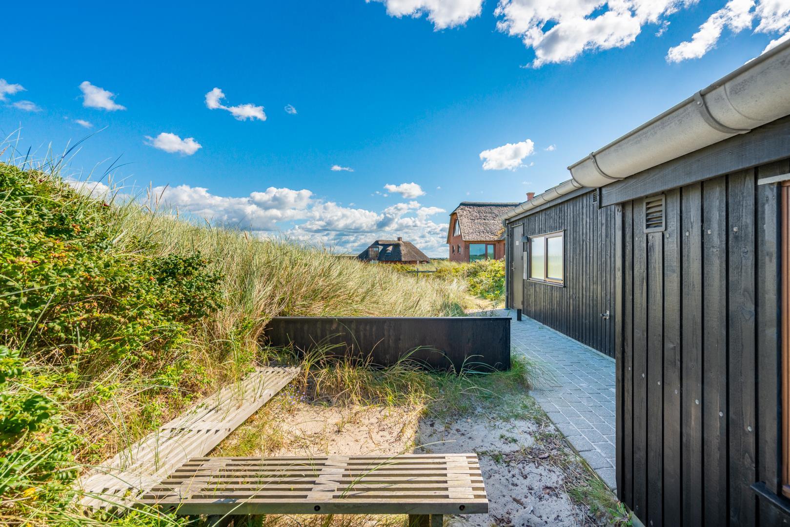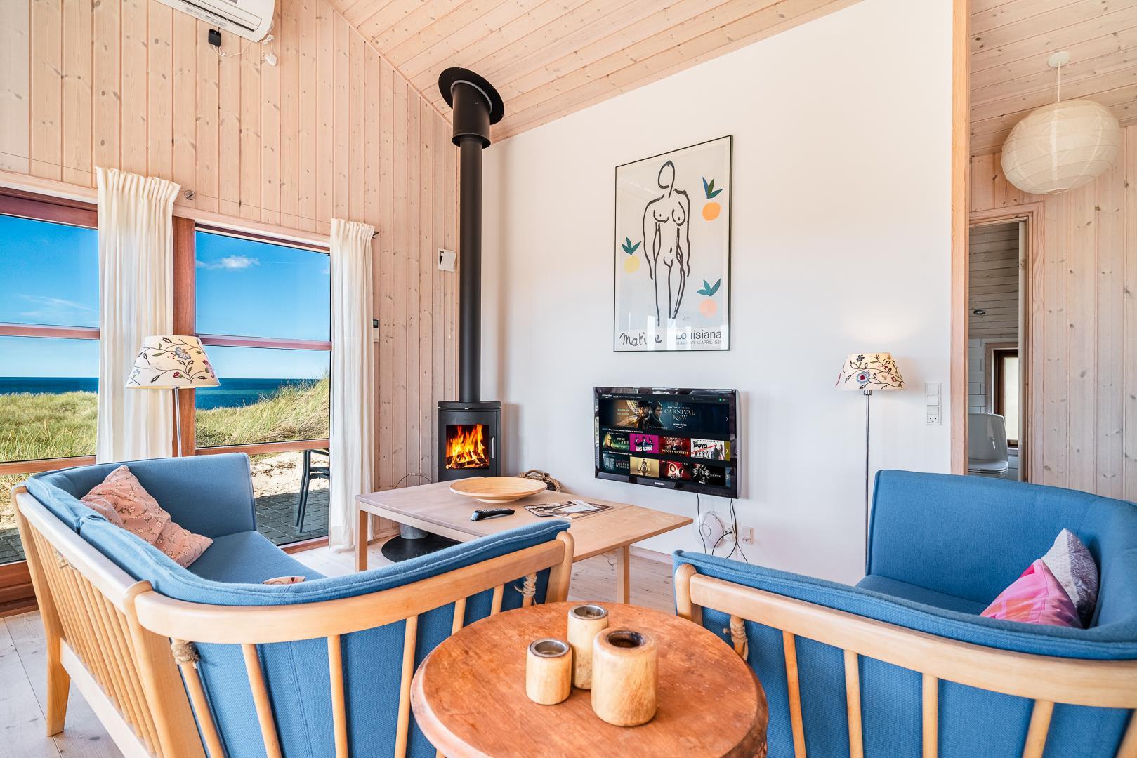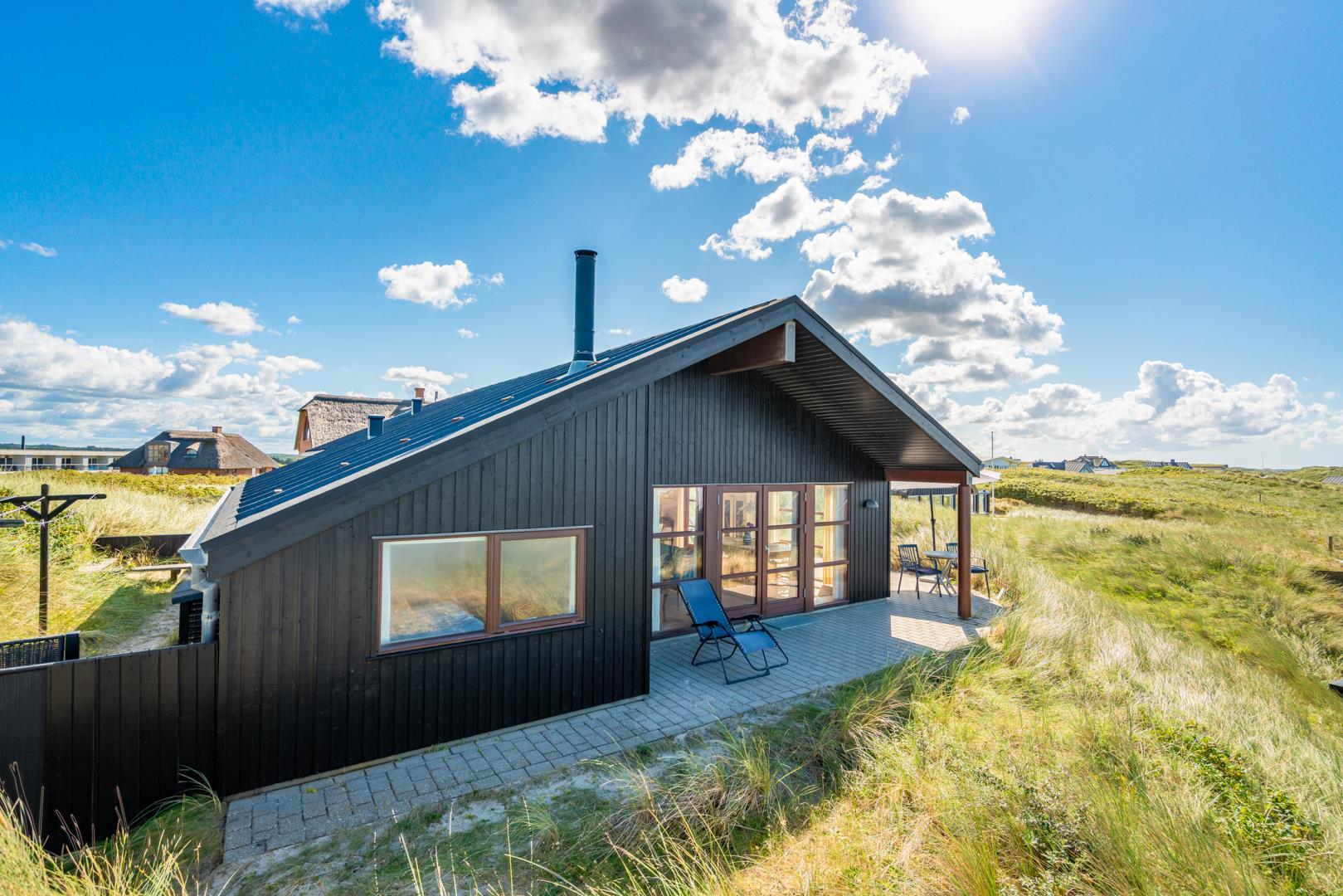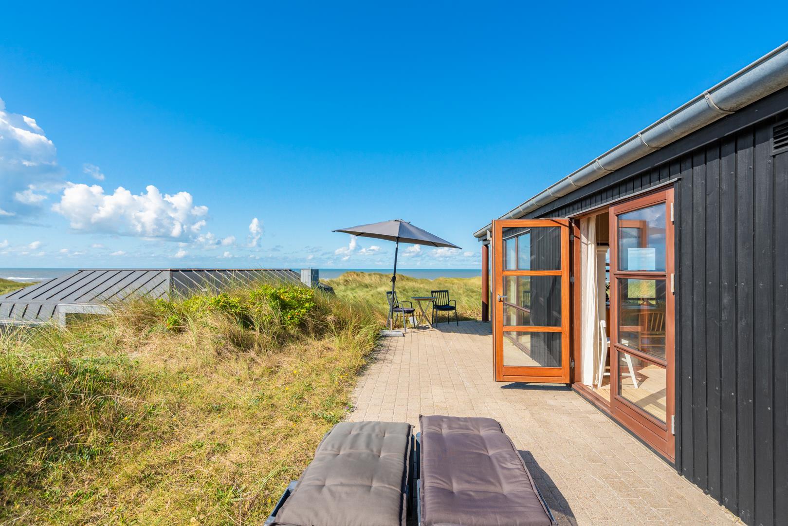 PANORAMA AUSSICHT. Auf einem der besten Grundstücke in Henne Strand mit Panoramaaussicht über die herrliche Nordsee und Dünen, liegt dieses neuere Holzferienhaus. Das Haus liegt ganz nah am Wasser, mit nur 50m vom Strand. Hier gibt es mehrere tolle Terrassen, von denen eine überdacht ist. Im Haus gibt es 4 Schlafzimmer, von denen 3 Zugang zur Terrasse haben. Schöne und gemütliche Stube mit großer Fensterfront mit fantastischer Aussicht über die grasbewachsenen Dünen.