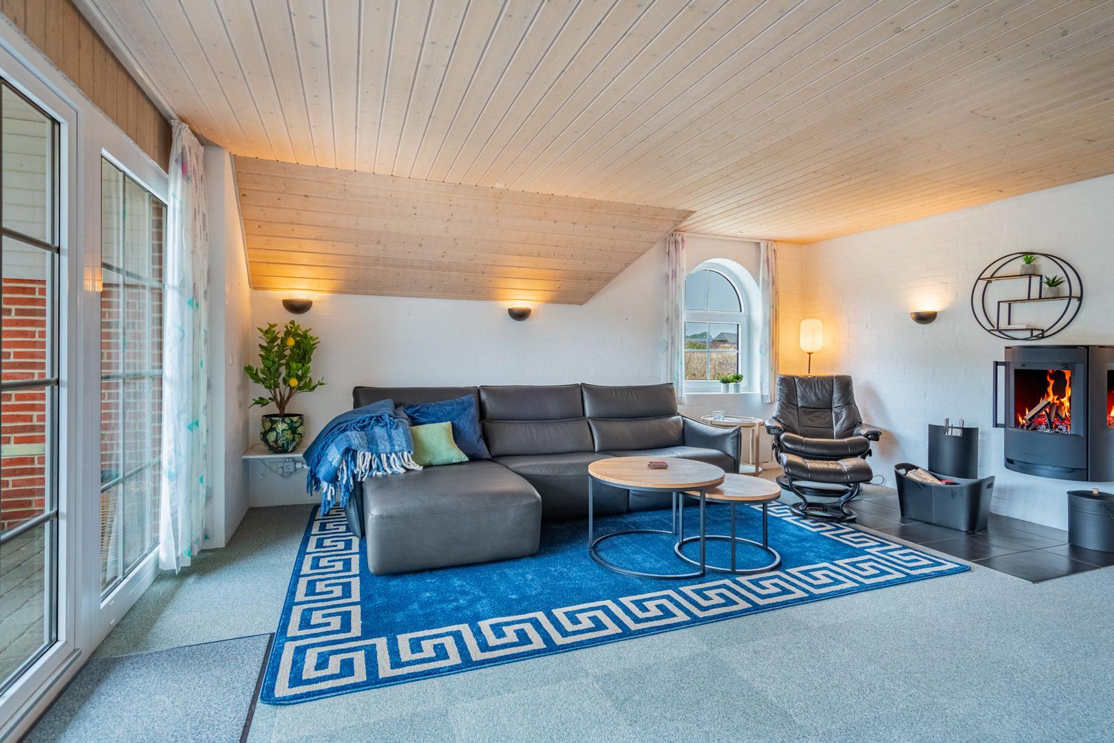 Der großzügige Wohnraum mit Kamin, neue Möbeln (2026) und Fußbodenheizung sorgt für eine gemütliche Atmosphäre – ideal, um nach Strandspaziergängen oder Ausflügen zur Ruhe zu kommen. Große Fenster lassen viel Licht herein und schaffen ein offenes, einladendes Raumgefühl.