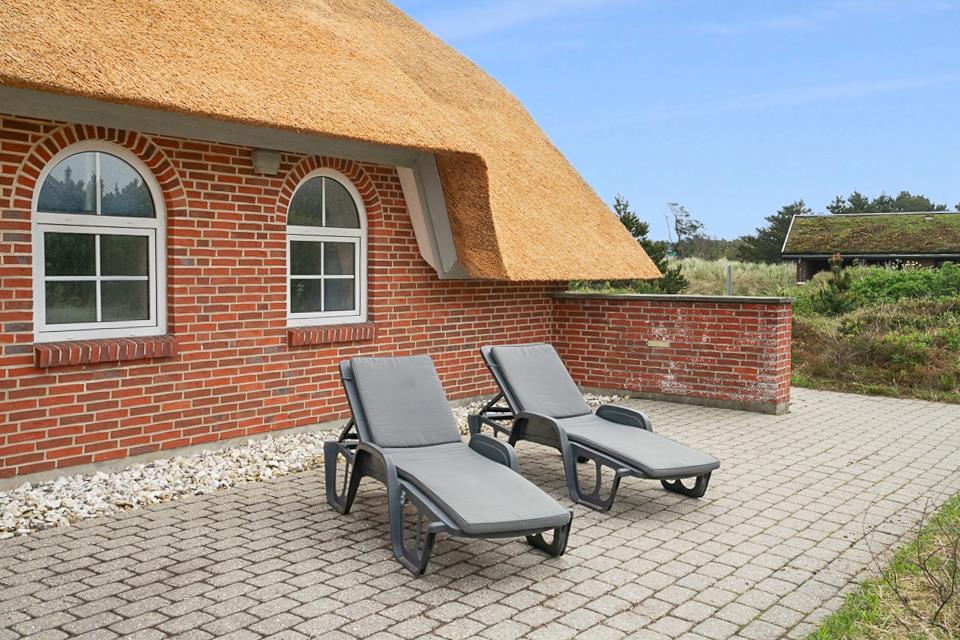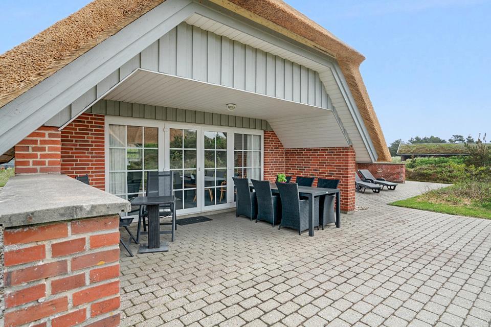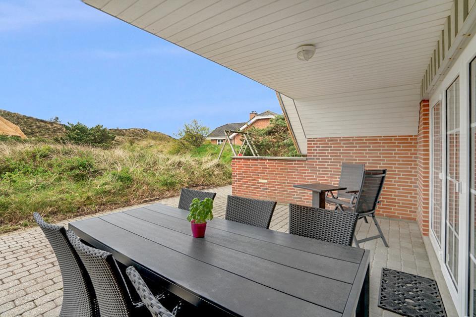 Der Außenbereich des Ferienhauses Porsevej 314 in Henne Strand bietet euch den perfekten Rahmen für entspannte Urlaubstage an der dänischen Westküste. Auf der überdachten Terrasse könnt ihr schon morgens die frische Nordseeluft genießen oder den Abend bei einem gemütlichen Essen ausklingen lassen. Durch die geschützte Lage sitzt ihr hier jederzeit angenehm – selbst, wenn der Wind einmal auffrischt. Der Blick in die umliegende schöne Natur von Henne Strand schafft sofort Ruhe und echtes Urlaubsgefühl.