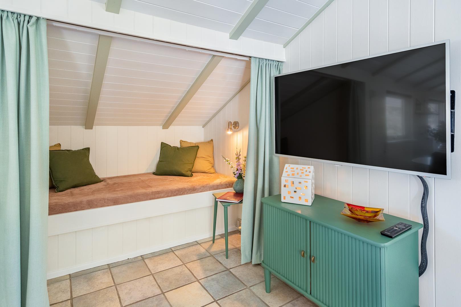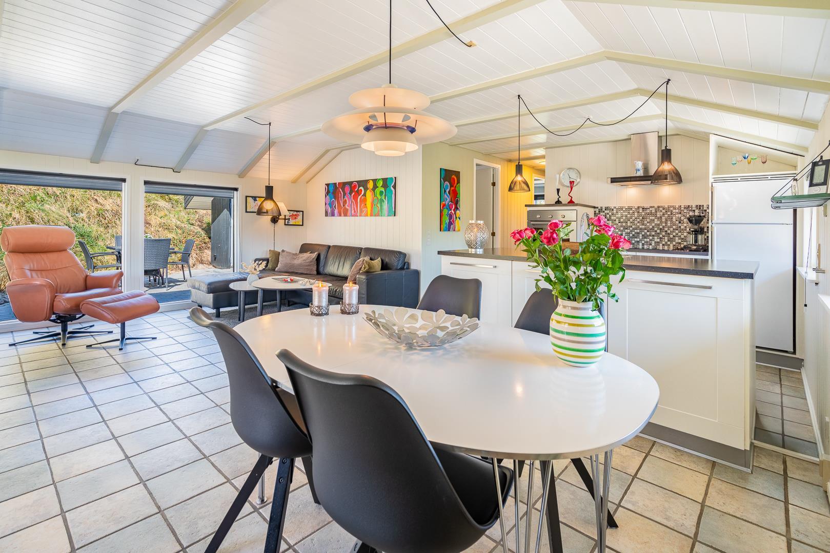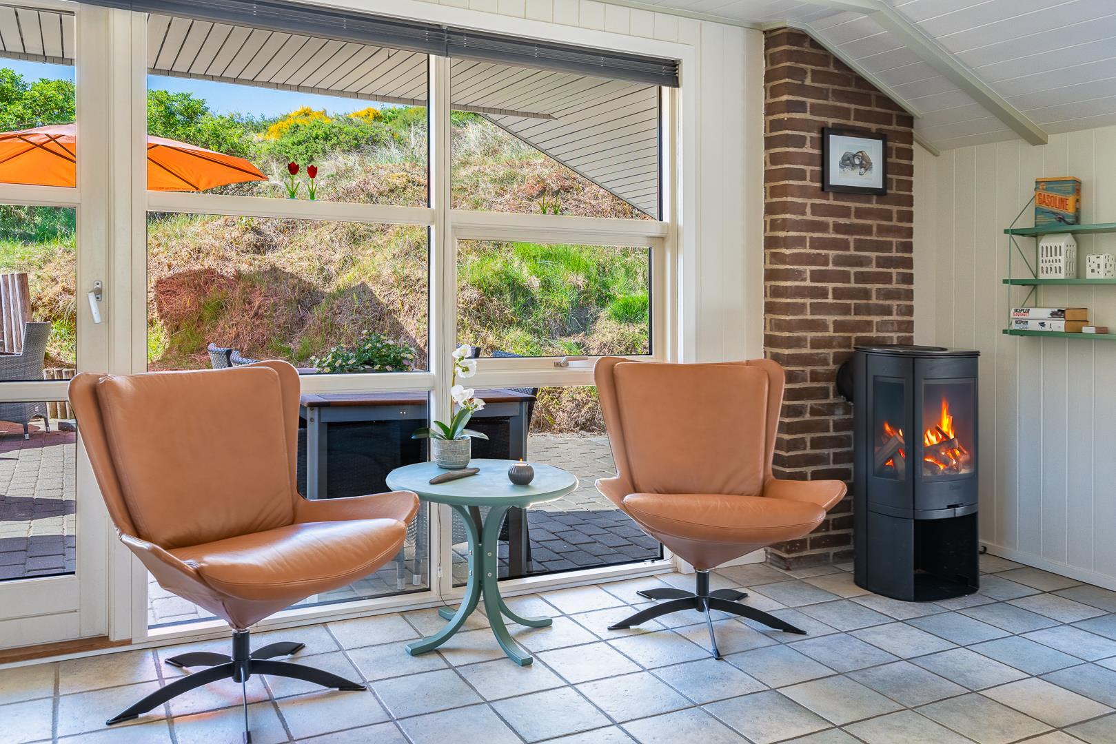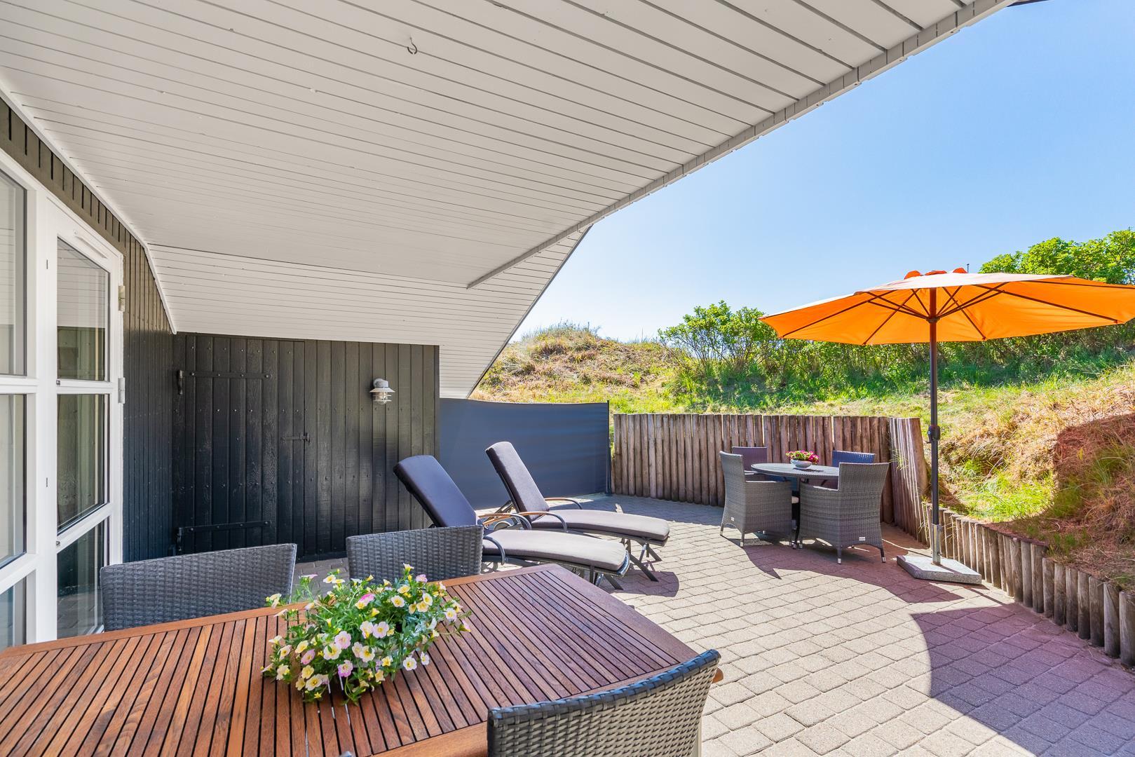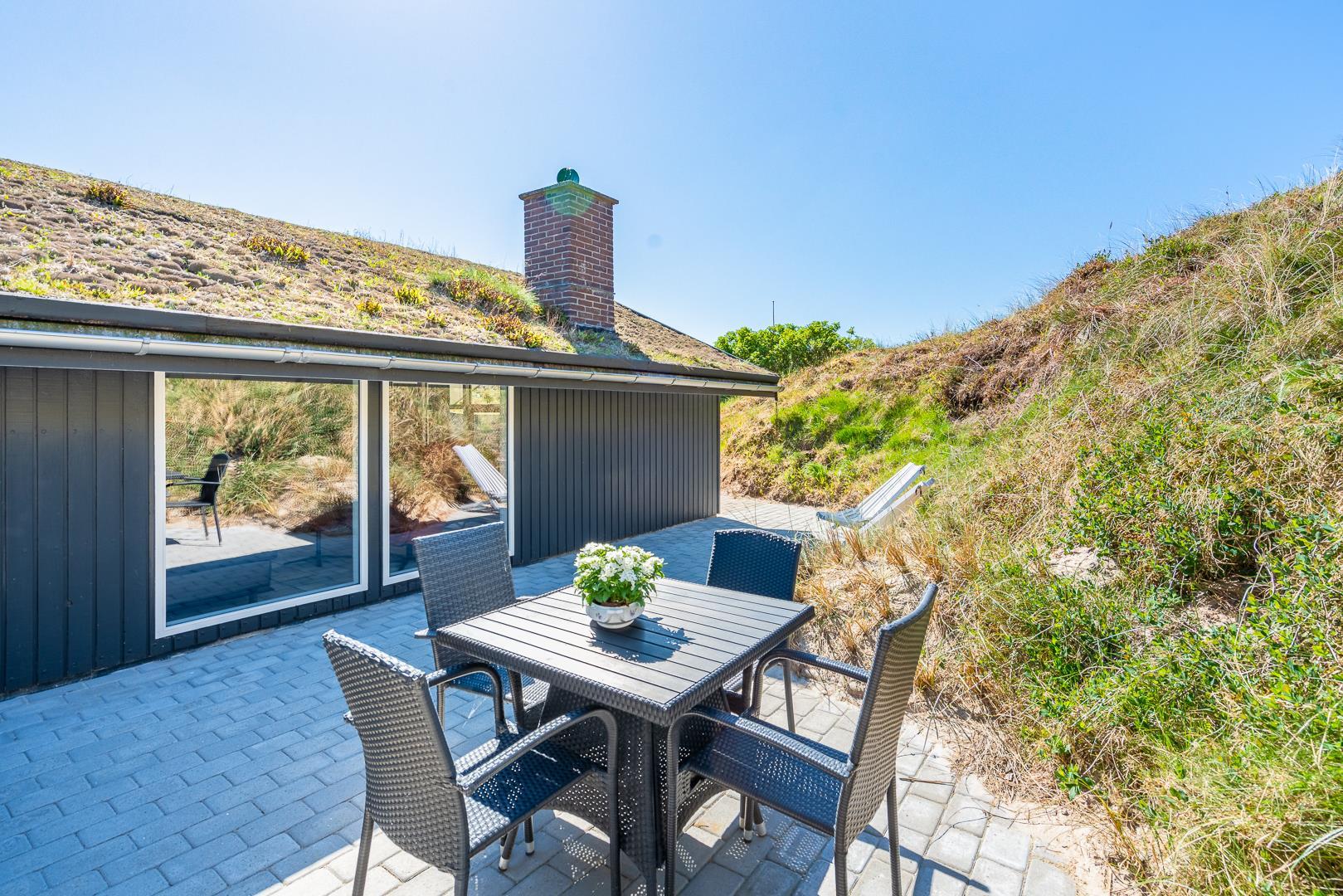 Dieses gemütliche und hübsches Ferienhaus befindet sich auf einem hügeligen Naturgrundstück. Die teilweise überdachte Steinterrasse ist durch die benachbarte Düne schön windgeschützt. Die Küche ist mit dem geräumigen, gut möblierten Wohnraum kombiniert. Der Wohnbereich und die Küche sind mit Klinkerboden mit Fußbodenheizung ausgelegt. Die Schlafzimmer verfügen über Holzboden.. Alles sind hell und freundlich.