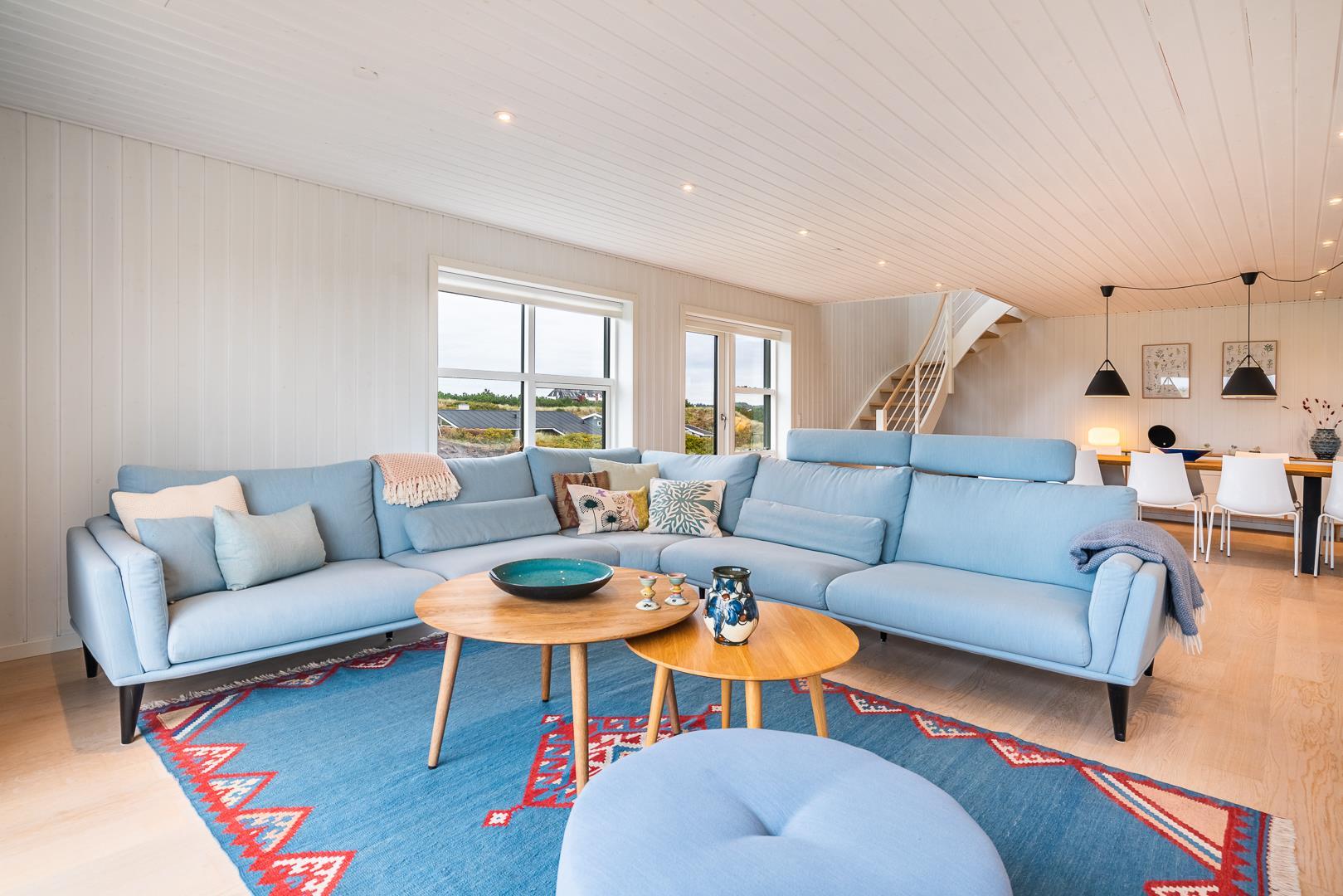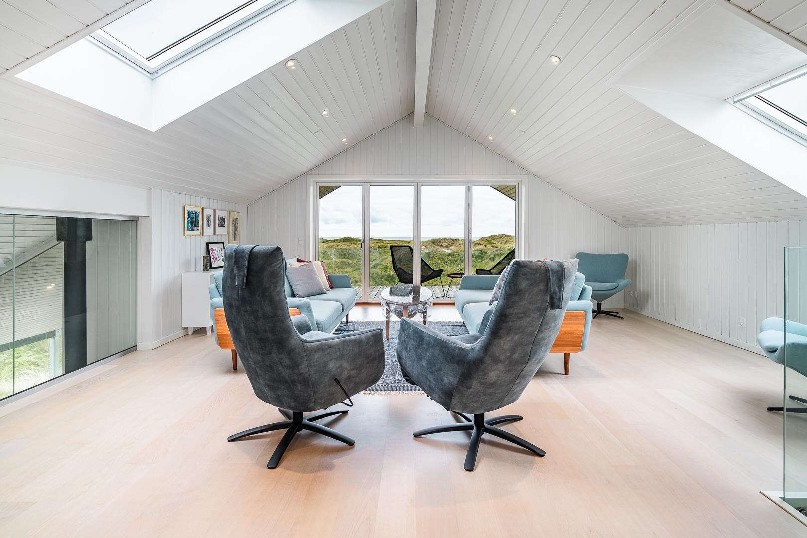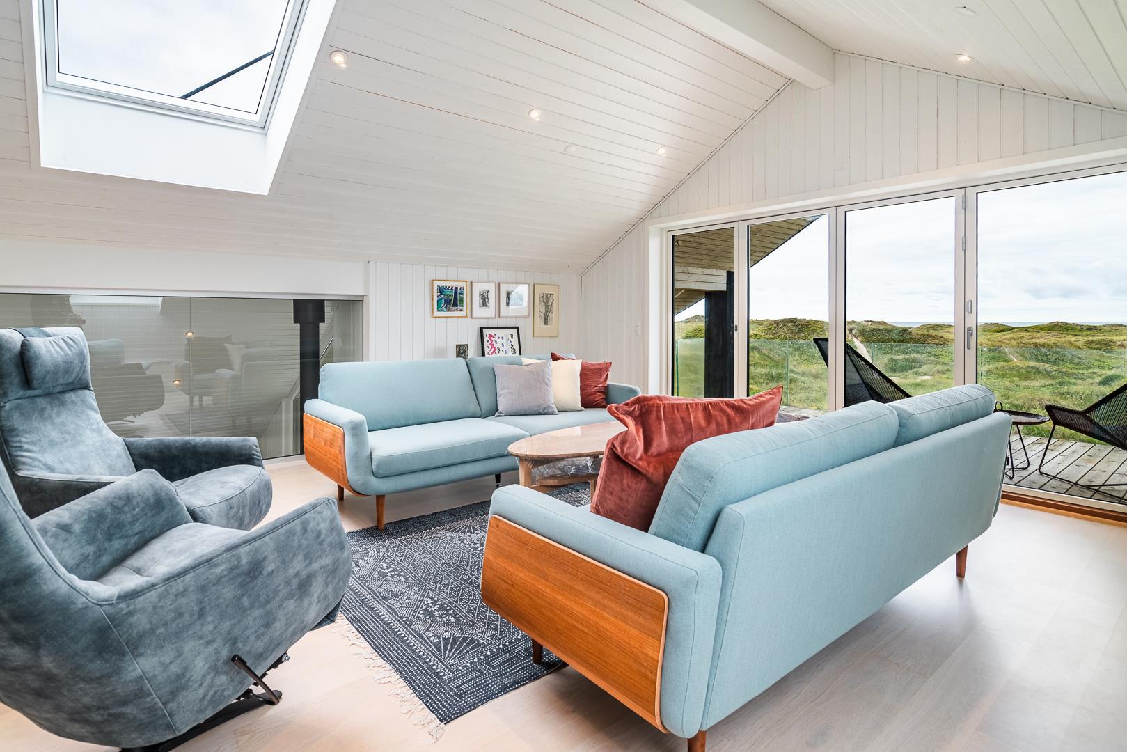 Große, helle und geräumige Küche/Esszimmer mit Holzofen und Wärmepumpe und mit großen Panoramafenstern mit Blick auf die großen Dünen. Im ersten Stock des Sommerhauses befindet sich der Aktivitätsraum mit Billard und Tischfussball sowie ein großes und sehr geräumiges, geschmackvoll eingerichtetes Wohnzimmer mit großen Panoramafenstern nach Westen.