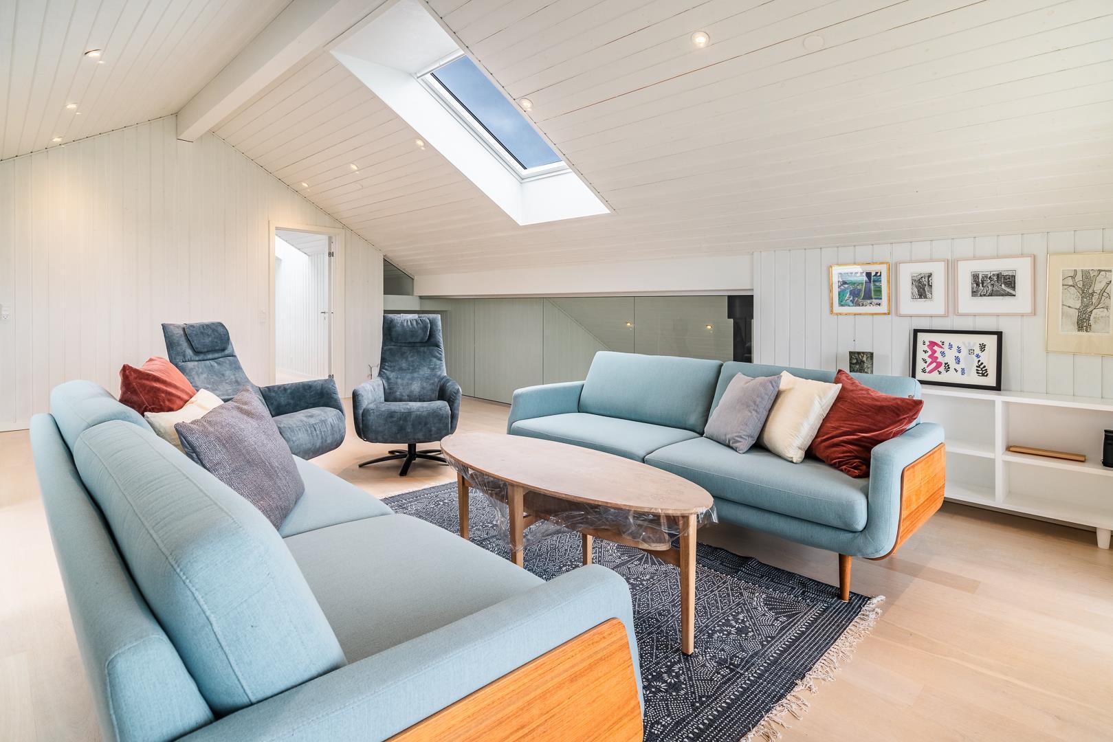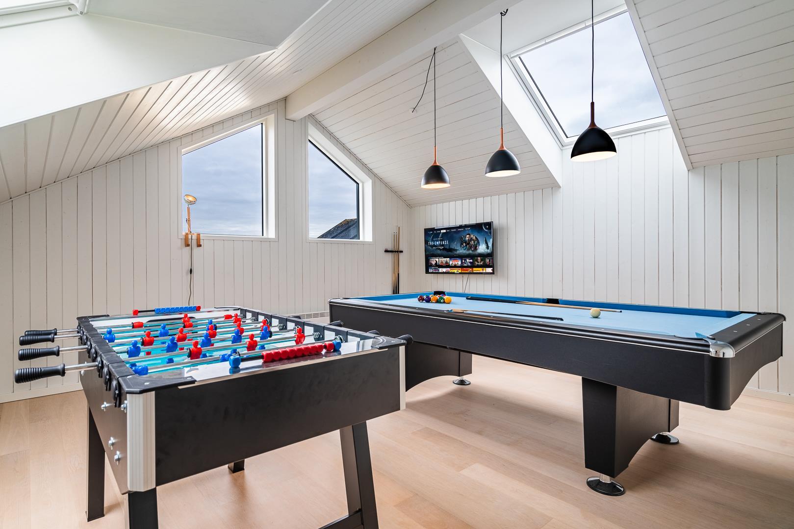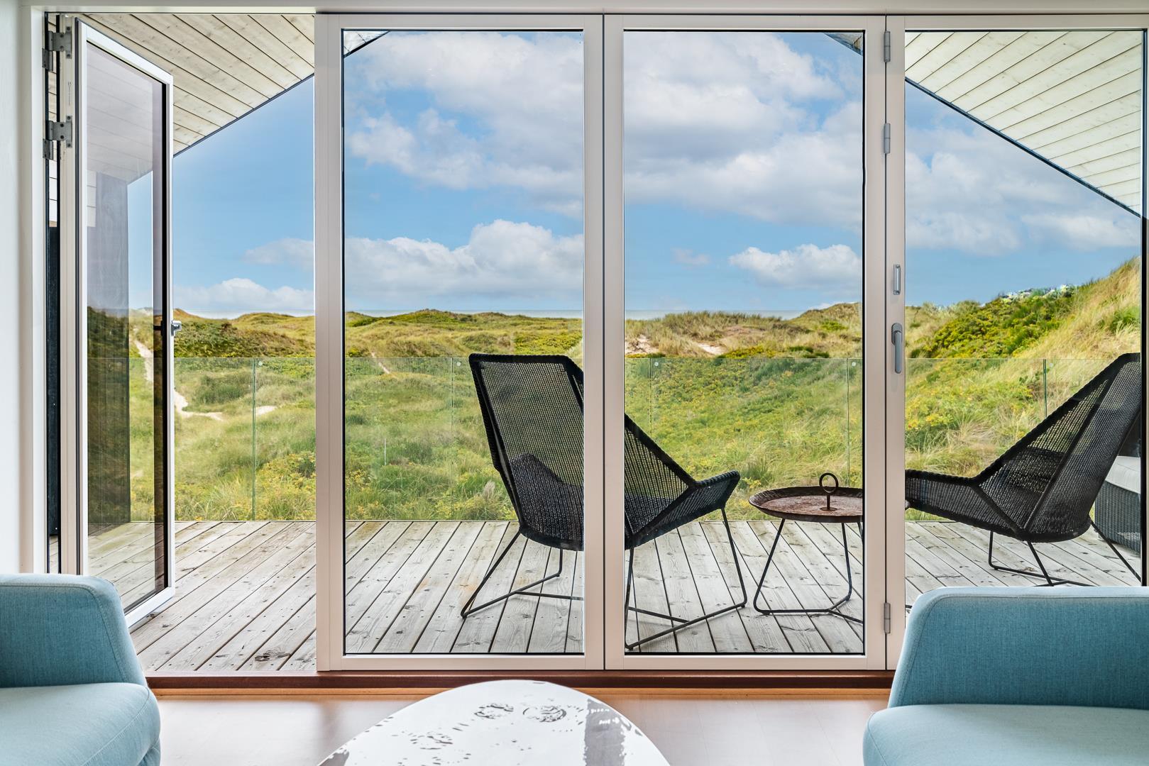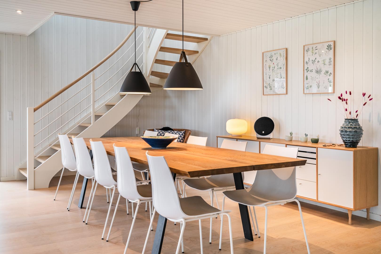 Große, helle und geräumige Küche/Esszimmer mit Holzofen und Wärmepumpe und mit großen Panoramafenstern mit Blick auf die großen Dünen. Im ersten Stock des Sommerhauses befindet sich der Aktivitätsraum mit Billard und Tischfussball sowie ein großes und sehr geräumiges, geschmackvoll eingerichtetes Wohnzimmer mit großen Panoramafenstern nach Westen.