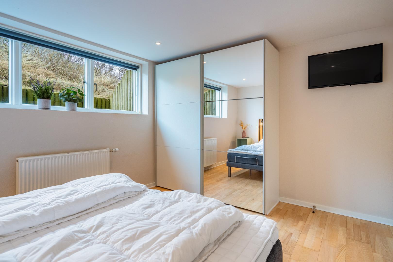Vom Wohnzimmer aus haben Sie direkten Zugang zu einer großen überdachten Terrasse und dem grün bewachsenen Naturgrundstück, das im Morgen- und Abendlicht auch mal von Rehen besucht wird. Die Umgebung bietet perfekte Bedingungen, um die Natur zu genießen: Direkt hinter den Dünen öffnet sich der kreideweiße Sandstrand, und die blauen Wellen versprechen im Sommer eine Urlaubsatmosphäre auf dem Niveau Südeuropas. Die Blåbjerg Plantage, Kærgård Plantage, der Filsø und mehr sind nur eine kurze Autofahrt oder Fahrrardtour entfernt.