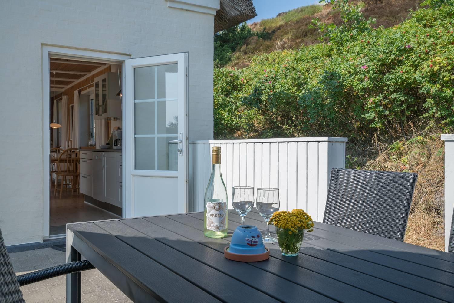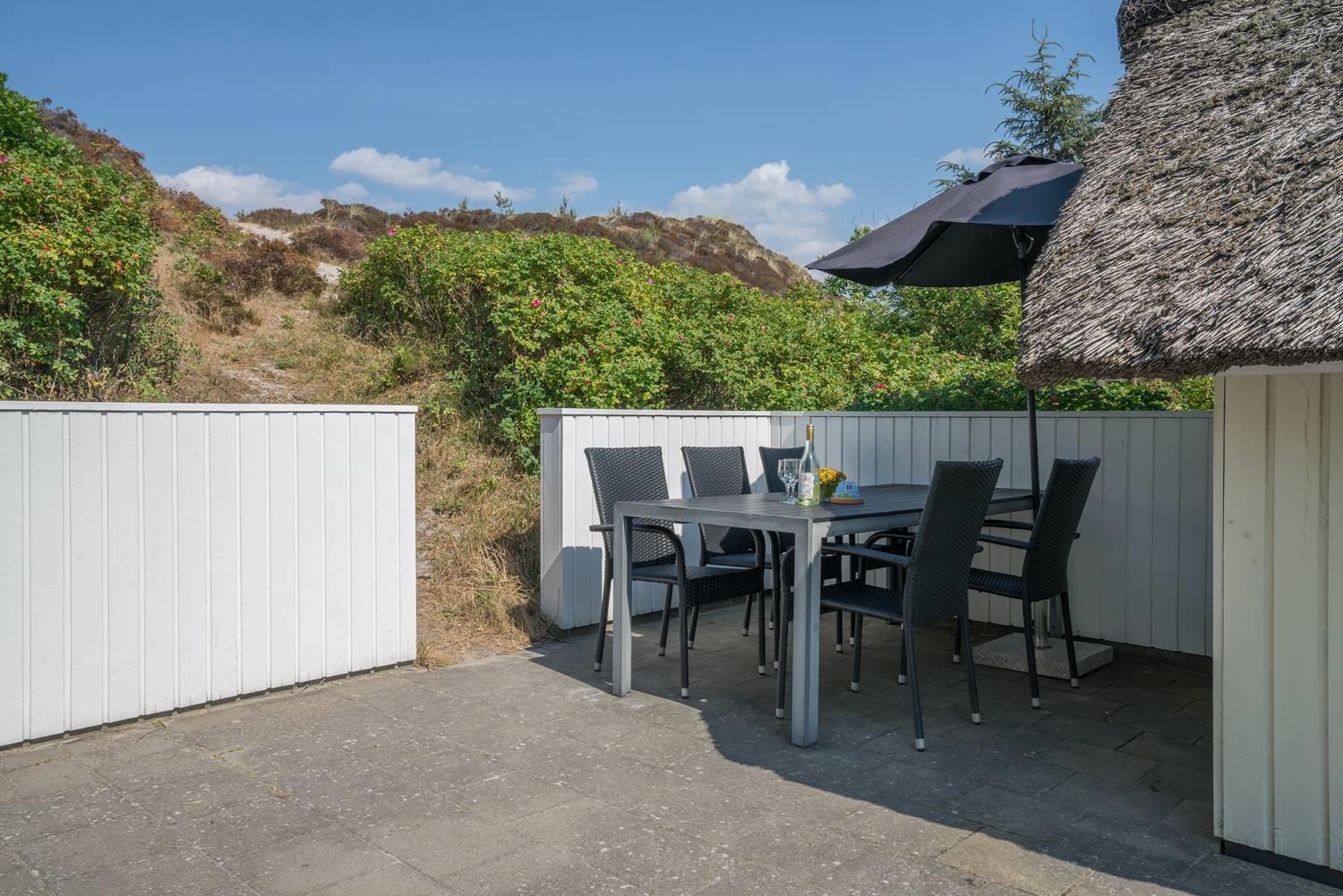 Rund um das Haus befindet sich eine große, geschützte und vollständig eingezäunte Terrasse, auf der man immer ein windgeschütztes Plätzchen zum Entspannen findet.