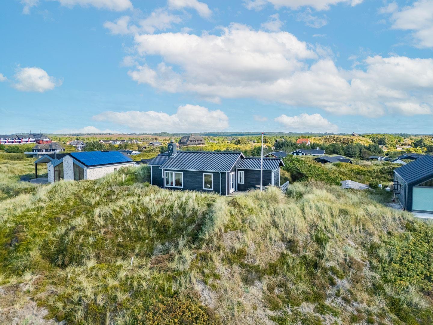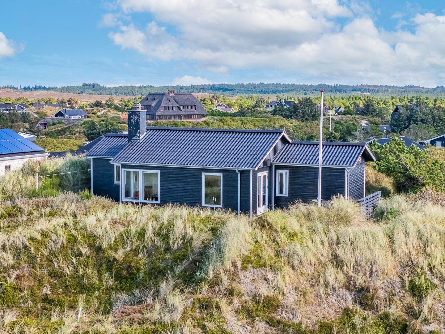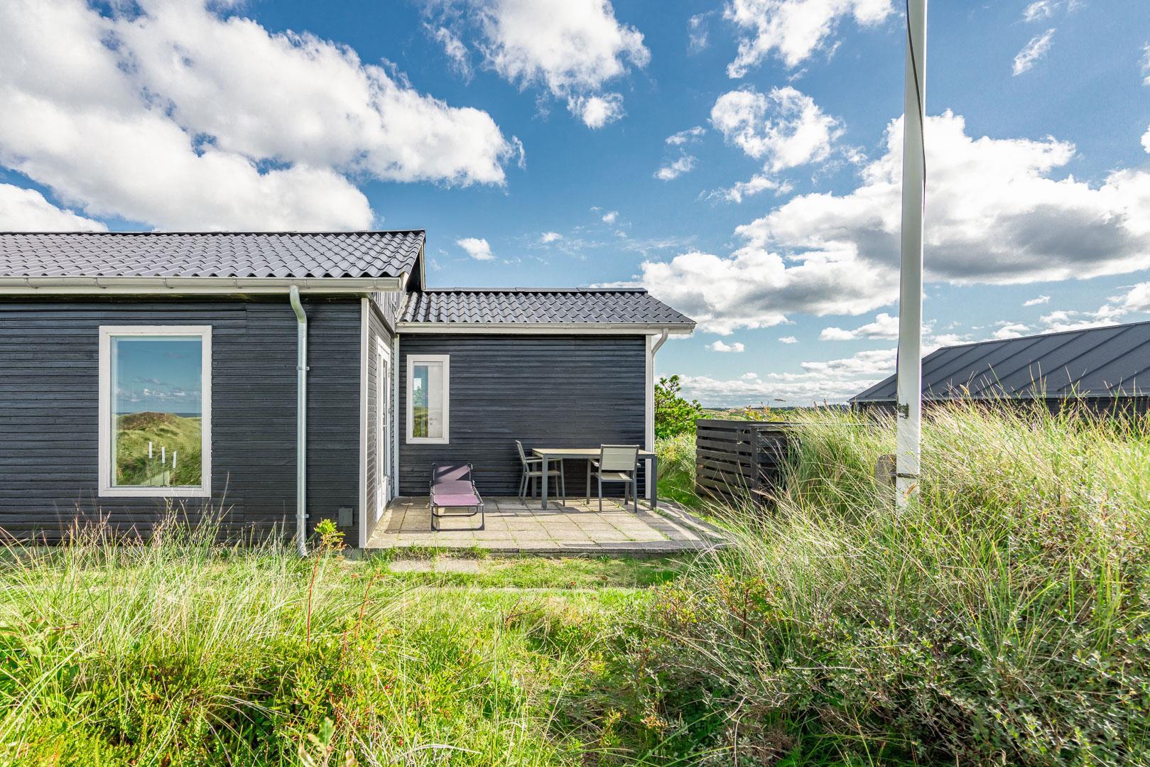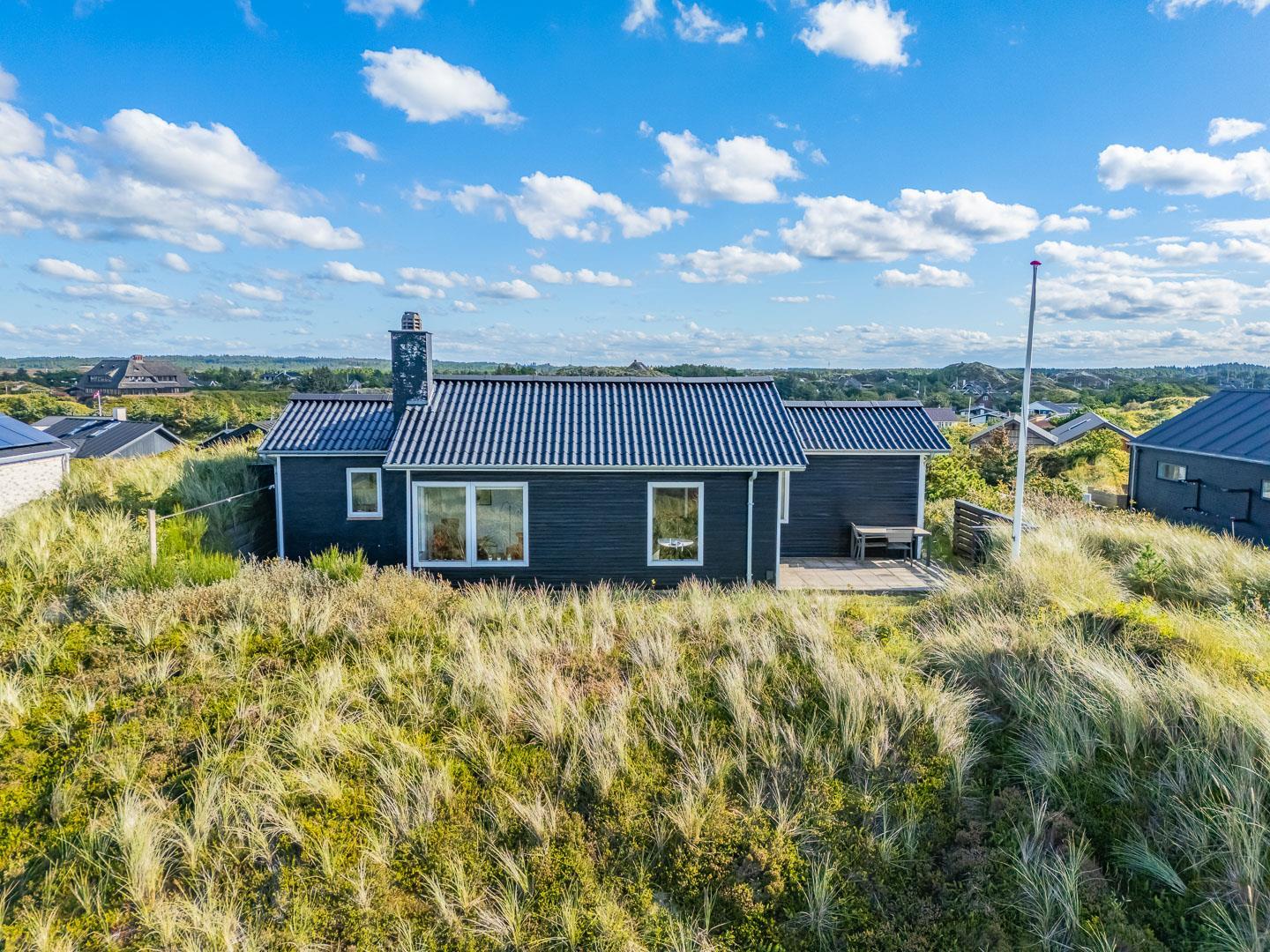 Charmantes Ferienhaus mit Meerblick gelegen auf einem prachtvollen und hochgelegenen Dünengrundstück in erster Dünenreihe in Henne Strand. Das Haus ist 2015 komplett modernisiert, so dass das ganze Haus hell und freundlich ist. Gemütliche Stube, die eingerichtet ist in gutem Stil und mit guten Möbeln. Die Stube hat große Fenster, so dass man das Meer und die fantastische Aussicht über die Dünen voll genießen kann. Ein Schlafzimmer mit guten Einzelbetten und Schränken. Gut ausgestattete Küche mit Spülmaschine und Mikrowelle. Es gibt auch vom Küchenfenster eine tolle Aussicht über die Dünenlandschaft. Badezimmer mit Dusche, extra Toilette. Es gibt mehrere tolle und ganz ungestörte Terrassen um das Haus herum. Ein fantastisches und super gemütliches Ferienhaus für 2 Personen. Depotraum auf der Terrasse ist privat.